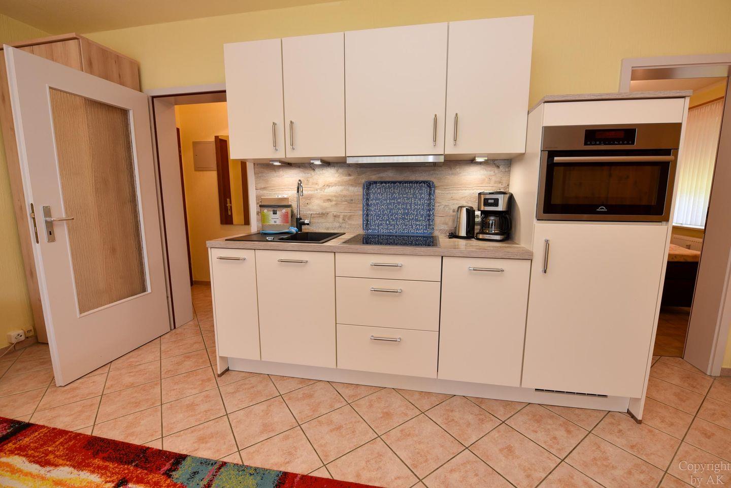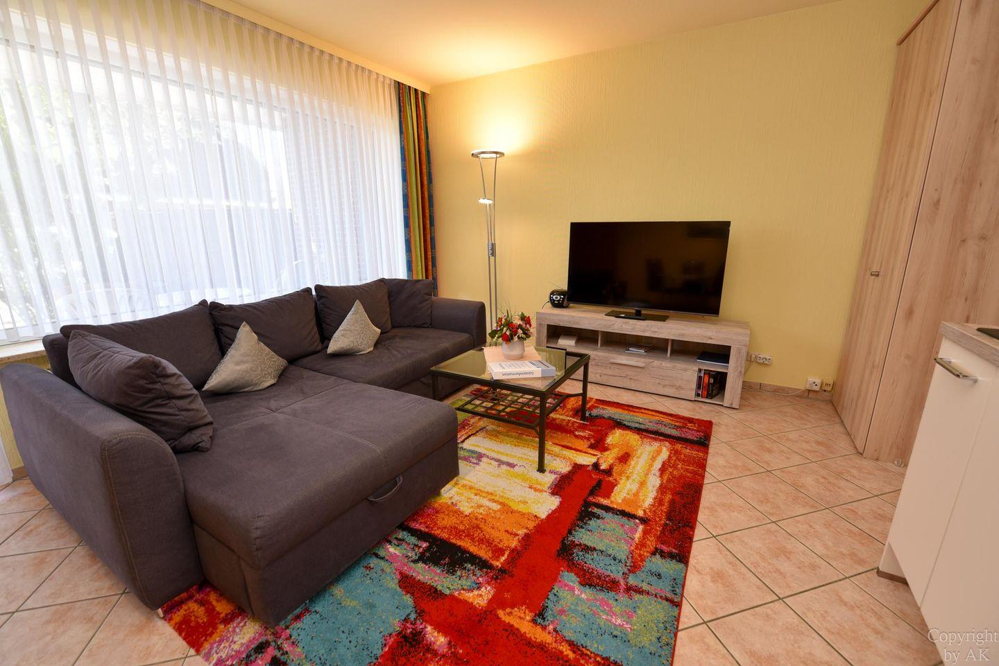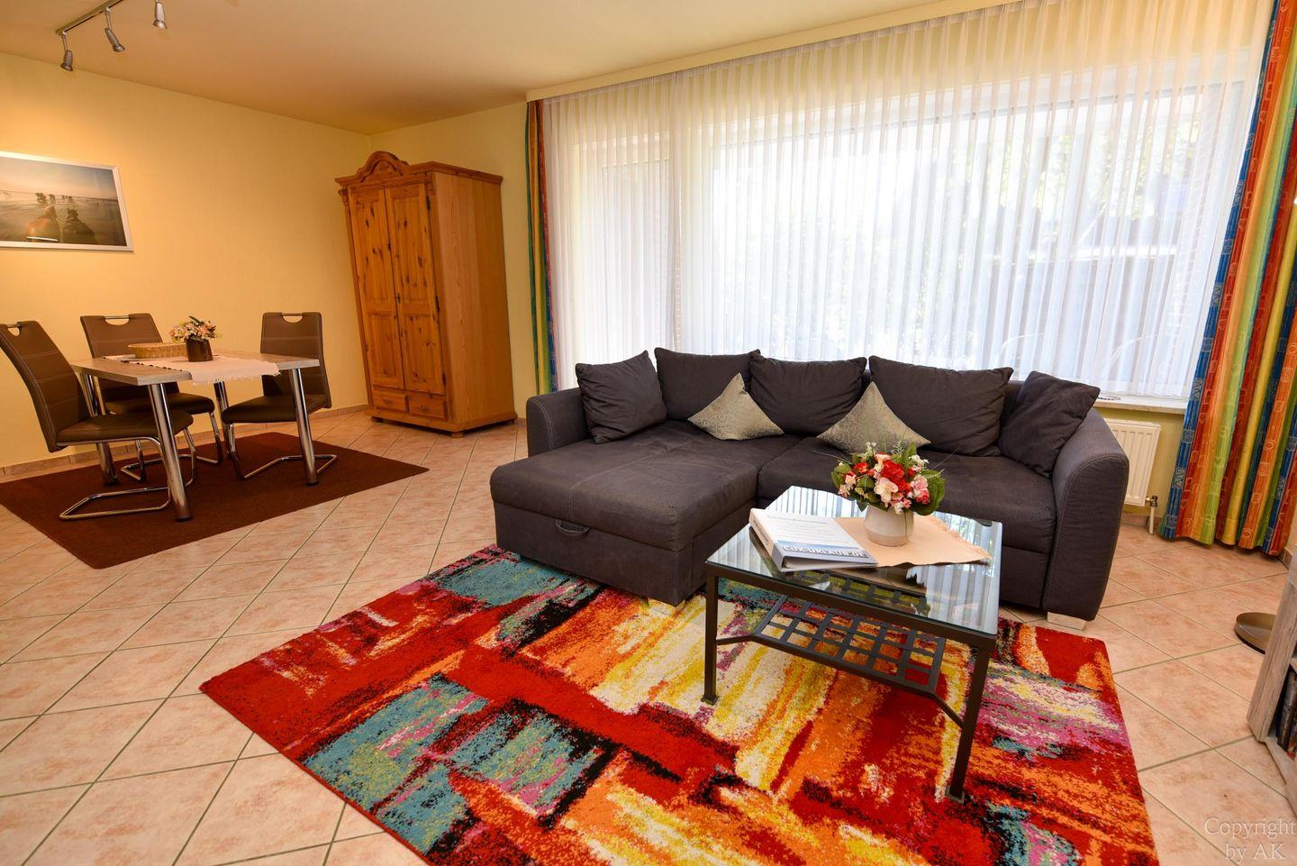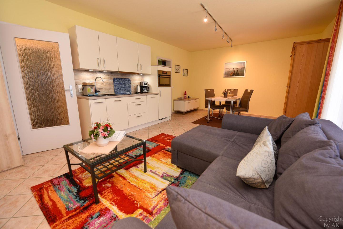 Der helle Wohnbereich ist mit einem Schlafsofa, einem Kleiderschrank und einem Esstisch mit drei Stühlen eingerichtet. Die moderne, im Wohnraum integrierte Küche ist mit Cerankochfeld, Spülmaschine und allem ausgestattet, was Sie für einen entspannten Aufenthalt benötigen.