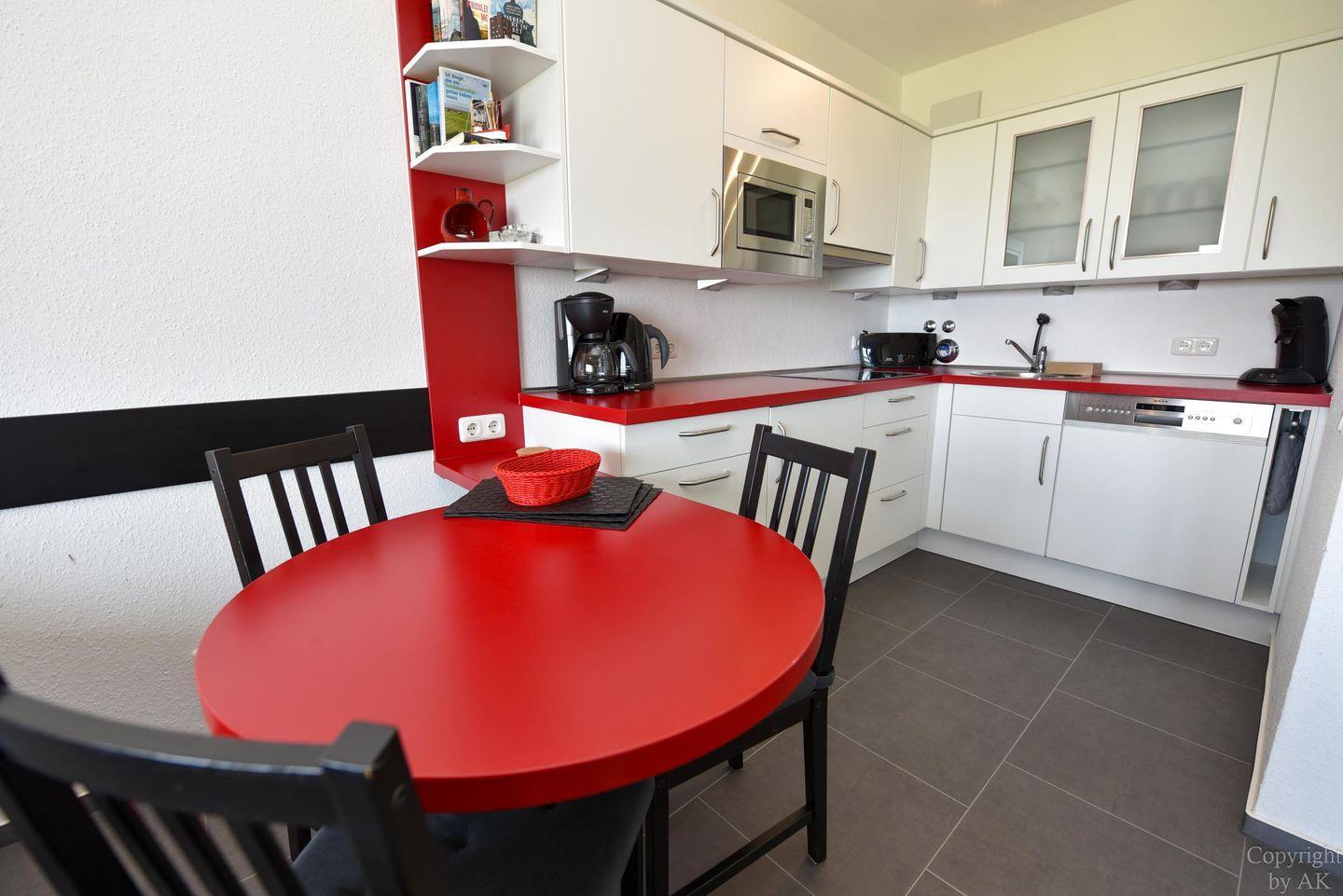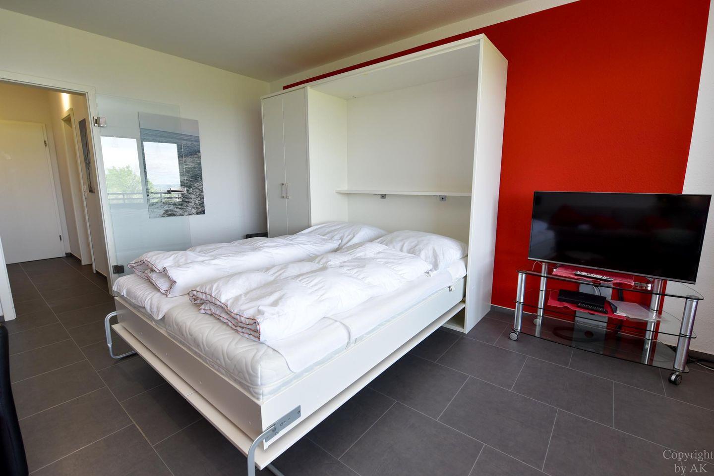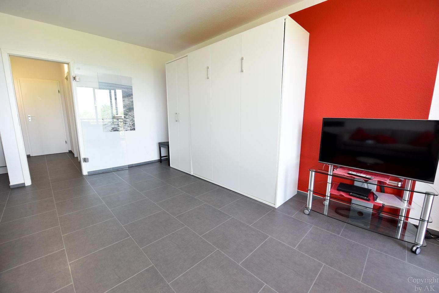 Vollständig renoviertes 1-Zimmer Appartement im 4. OG mit Balkon und Seeblick plus Strandkorb (01.05.-30.09.) am Sandstrand. Wohn-/ Schlafraum mit Schrankbett, Couch und zwei Sesseln, TV und Bluray-Player. Voll ausgestattete offene Küche mit integriertem Tisch und 4 Stühlen, Herd mit 4 Kochfeldern, Mikrowelle, Kühlschrank und Spülmaschine. Bad mit geräumiger Dusche, Waschtisch und WC. Der kostenlose Tiefgaragenstellplatz hat eine Einstellhöhe von 1,49 m. Der Eigentümer stellt seinen Gästen aber auch einen Parkausweis für den städtischen Parkplatz vor dem Haus zur Verfügung. ( 01.01.- 31.12. )