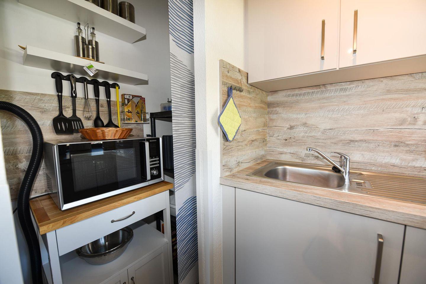 Schön renoviertes 2-Zimmer-Appartement im 1 OG. mit 2 großen Balkon-Terrassen mit Blick in Richtung Weltschifffahrtsweg. Große Kochnische mit Spülmaschine und Kapsel-Kaffeemaschine. Im Wohnbereich befindet sich ein Esstisch mit vier Stühlen, einem Schlafsofa sowie einem Flach-TV mit Kabelanschluss. Im Schlafraum steht ein Ehebett. Helles und neu renoviertes Bad mit tiefer Dusche. Auch ist ein separates WC vorhanden. Der Tiefgaragenstellplatz hat eine Einstellhöhe bis 149 cm.
