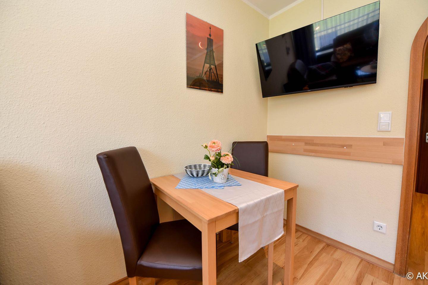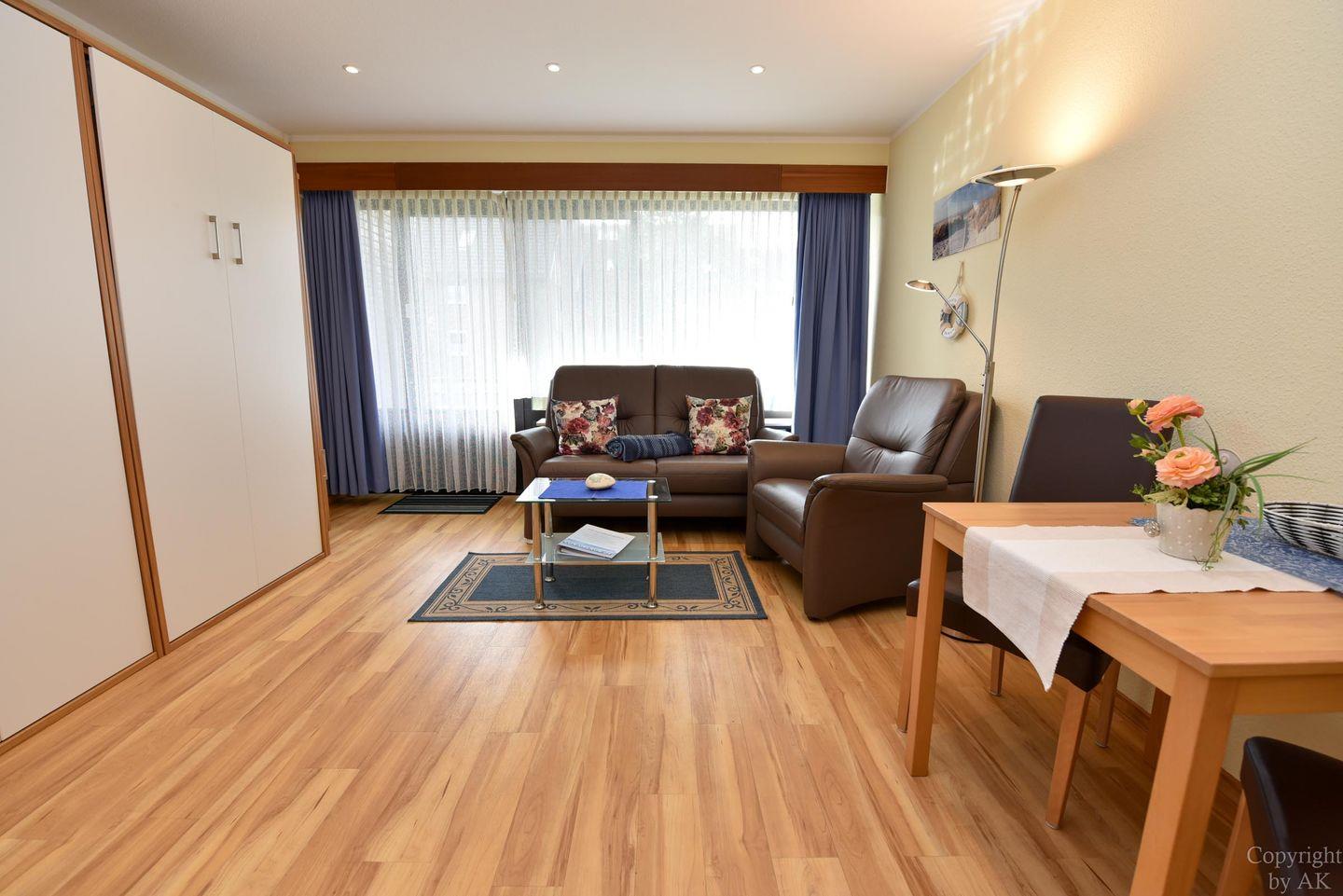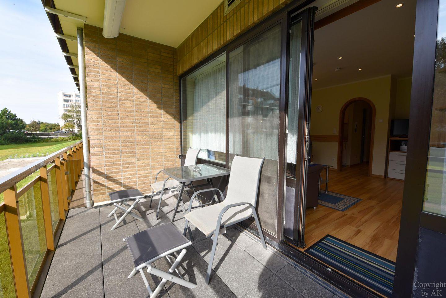 Modern eingerichtetes und bedingt behindertengerechtes 1- Zimmer-Appartement im Erdgeschoss mit großem Balkon. Im Wohn-/Schlaf-/ Essbereich gibt es ein einzeln klappbares Doppelschrankbett, ein Sofa mit passendem Sessel, sowie einen Esstisch. Zum Kochen gibt es eine Kochnische, welche mit einem Ceranfeld Herd mit zwei Platten ausgestattet ist. Das Appartement hat ein neues WC/Duschbad. Es gibt natürlich einen Kabel-Flach- TV und W-LAN. Der dazugehörige PKW Stellplatz in der Tiefgarage hat eine Einstellhöhe von 1,49.m