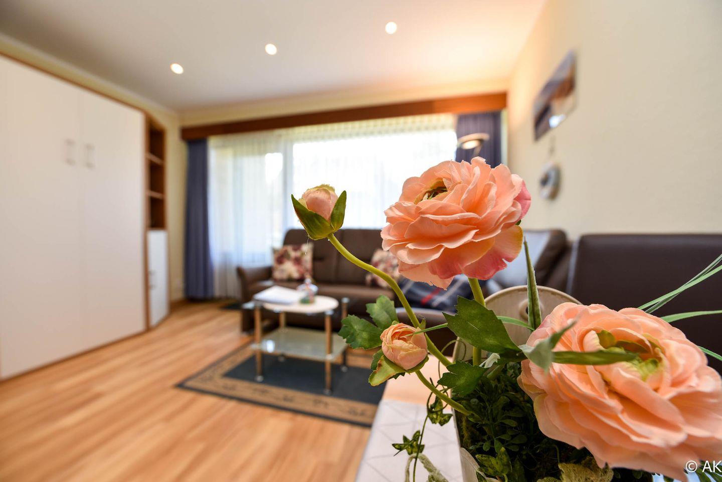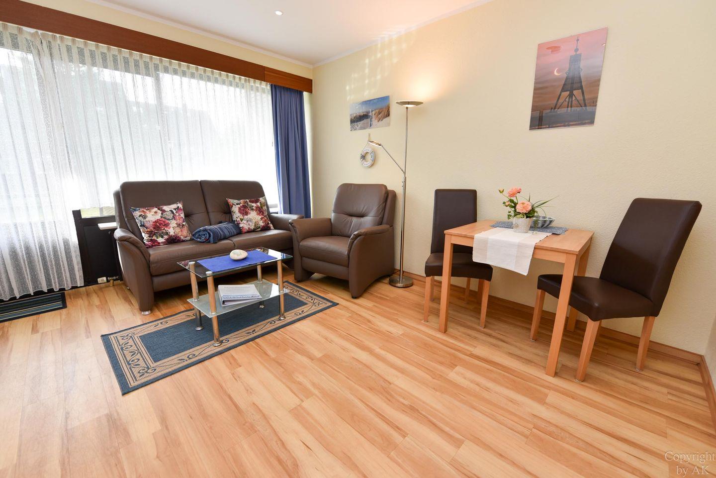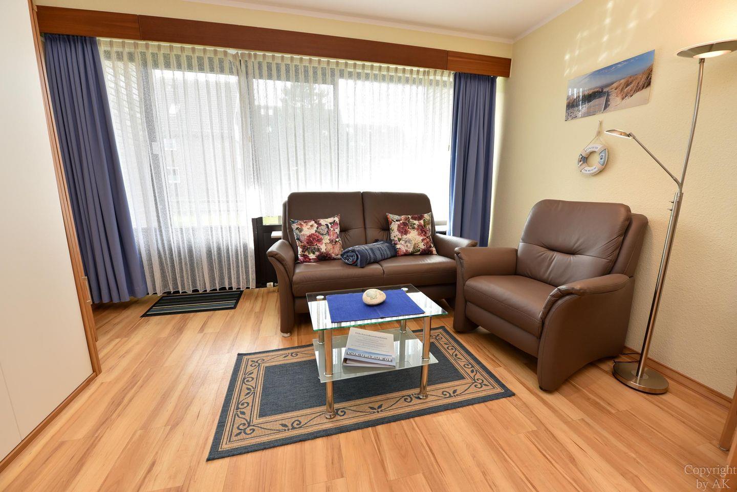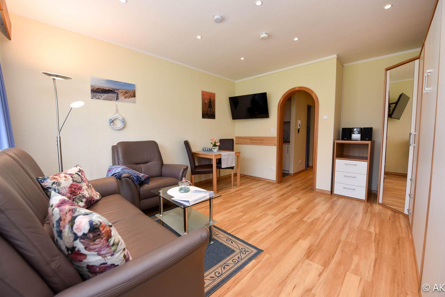 Modern eingerichtetes und bedingt behindertengerechtes 1- Zimmer-Appartement im Erdgeschoss mit großem Balkon. Im Wohn-/Schlaf-/ Essbereich gibt es ein einzeln klappbares Doppelschrankbett, ein Sofa mit passendem Sessel, sowie einen Esstisch. Zum Kochen gibt es eine Kochnische, welche mit einem Ceranfeld Herd mit zwei Platten ausgestattet ist. Das Appartement hat ein neues WC/Duschbad. Es gibt natürlich einen Kabel-Flach- TV und W-LAN. Der dazugehörige PKW Stellplatz in der Tiefgarage hat eine Einstellhöhe von 1,49.m