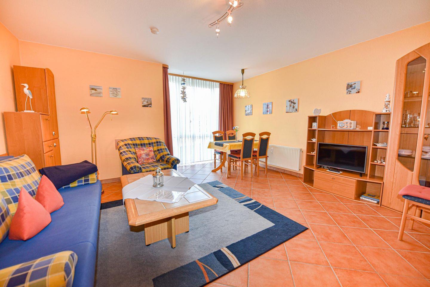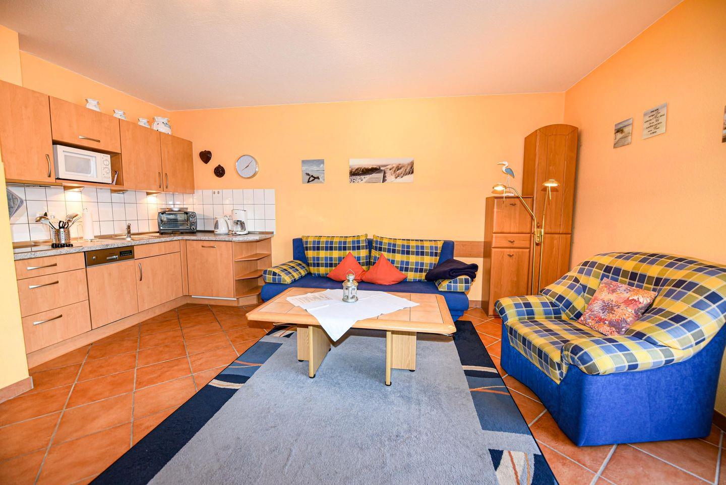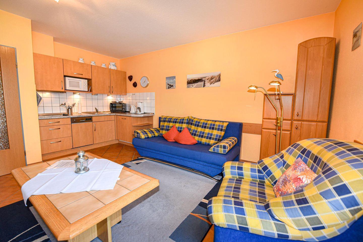 Großzügiges 2-Zimmer-Appartement in der Residenz PASSAT für 2 bis 4 Personen. Im Hochparterre gelegenes freundliches Appartement: 1 Wohn-/Ess-/Schlafraum (Fliesen) mit integrierter Küchenzeile, Pizzaofen, Spülmaschine, Kühlschrank mit Gefrierfach und Mikrowelle. Der Wohnraum bietet eine bequeme Doppelschlafcouch,1 Sessel und einen Couchtisch, 1 Esstisch und 4 Stühle. Das Schlafzimmer ein Ehebett und großer Kleiderschrank. Sat-TV . Duschbad/WC. Möblierte Süd-Ostterrasse. Stellplatz auf dem Parkdeck. Rasenanlage mit Spielgerät. Das Schwimmbad mit Gegenstromanlage und eine finnische Sauna sind kostenfrei im Haus zu nutzen. Fahrstuhl bis zum Schwimmbad, Sauna u. Münzwaschmaschine u. Trockner stehen für alle Gäste bereit. 190 m bis zum Sandstrand. Fahrradverleih in der Nähe.
