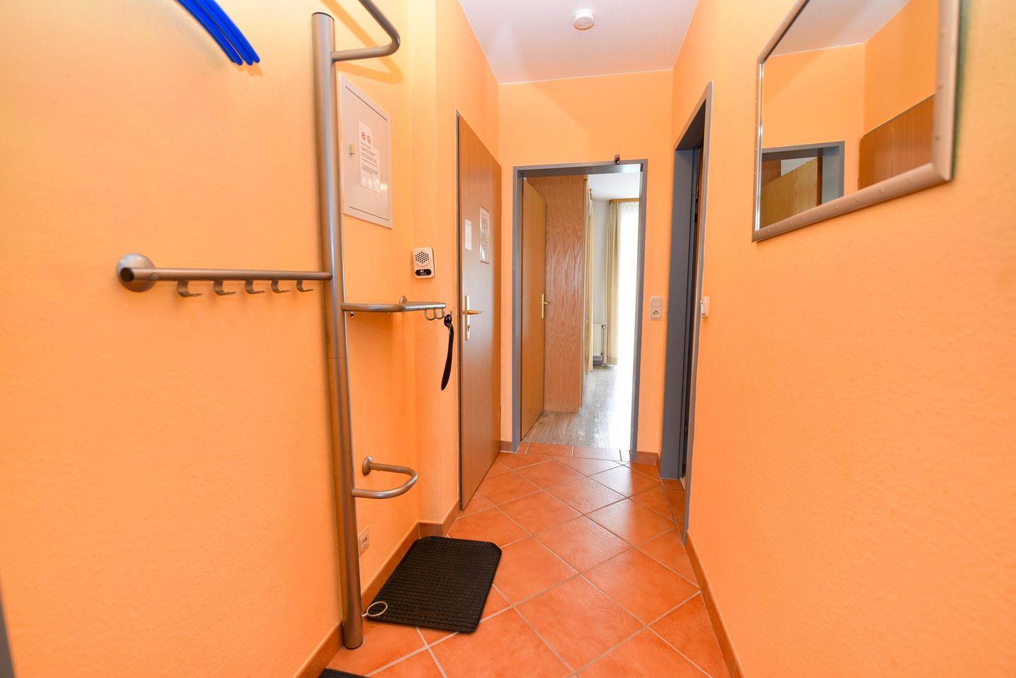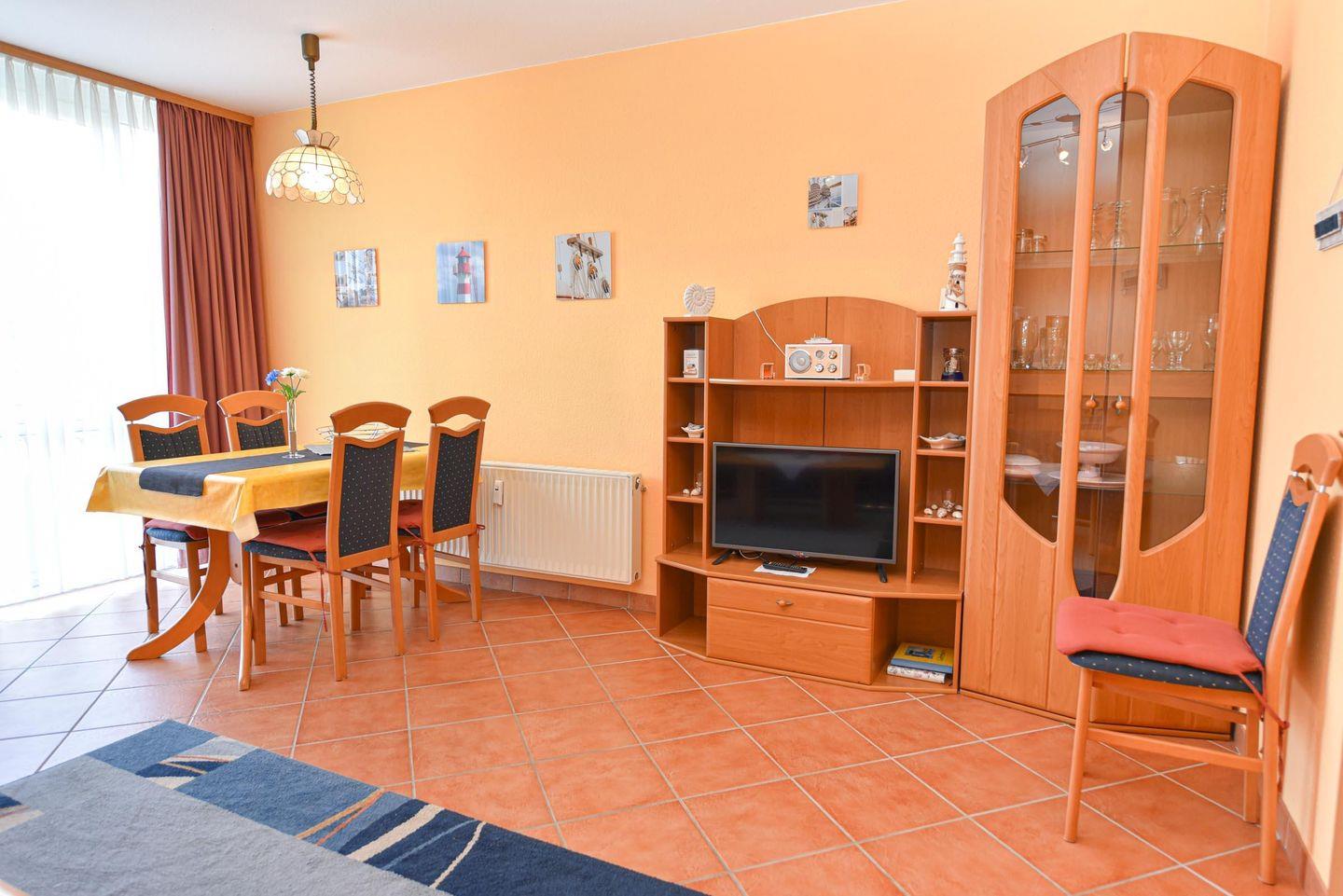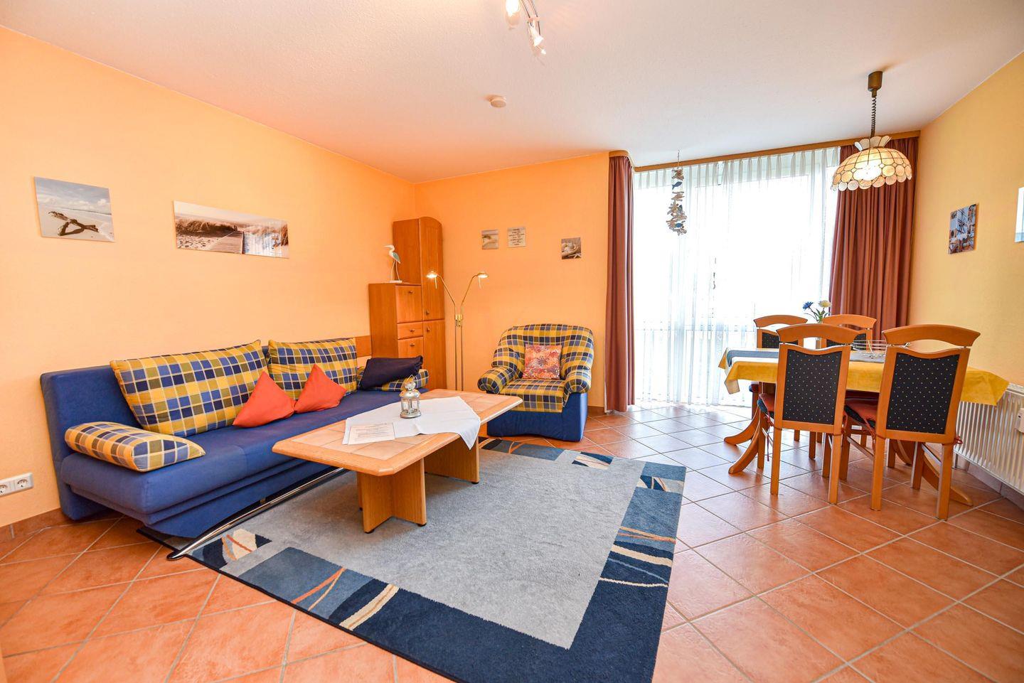 Großzügiges 2-Zimmer-Appartement in der Residenz PASSAT für 2 bis 4 Personen. Im Hochparterre gelegenes freundliches Appartement: 1 Wohn-/Ess-/Schlafraum (Fliesen) mit integrierter Küchenzeile, Pizzaofen, Spülmaschine, Kühlschrank mit Gefrierfach und Mikrowelle. Der Wohnraum bietet eine bequeme Doppelschlafcouch,1 Sessel und einen Couchtisch, 1 Esstisch und 4 Stühle. Das Schlafzimmer ein Ehebett und großer Kleiderschrank. Sat-TV . Duschbad/WC. Möblierte Süd-Ostterrasse. Stellplatz auf dem Parkdeck. Rasenanlage mit Spielgerät. Das Schwimmbad mit Gegenstromanlage und eine finnische Sauna sind kostenfrei im Haus zu nutzen. Fahrstuhl bis zum Schwimmbad, Sauna u. Münzwaschmaschine u. Trockner stehen für alle Gäste bereit. 190 m bis zum Sandstrand. Fahrradverleih in der Nähe.