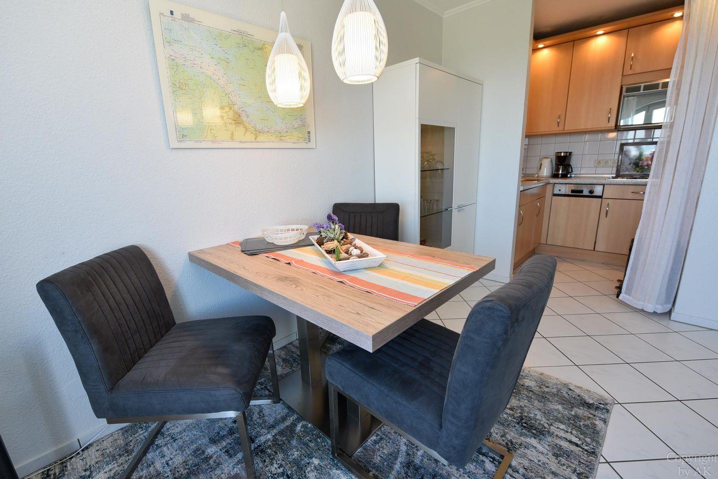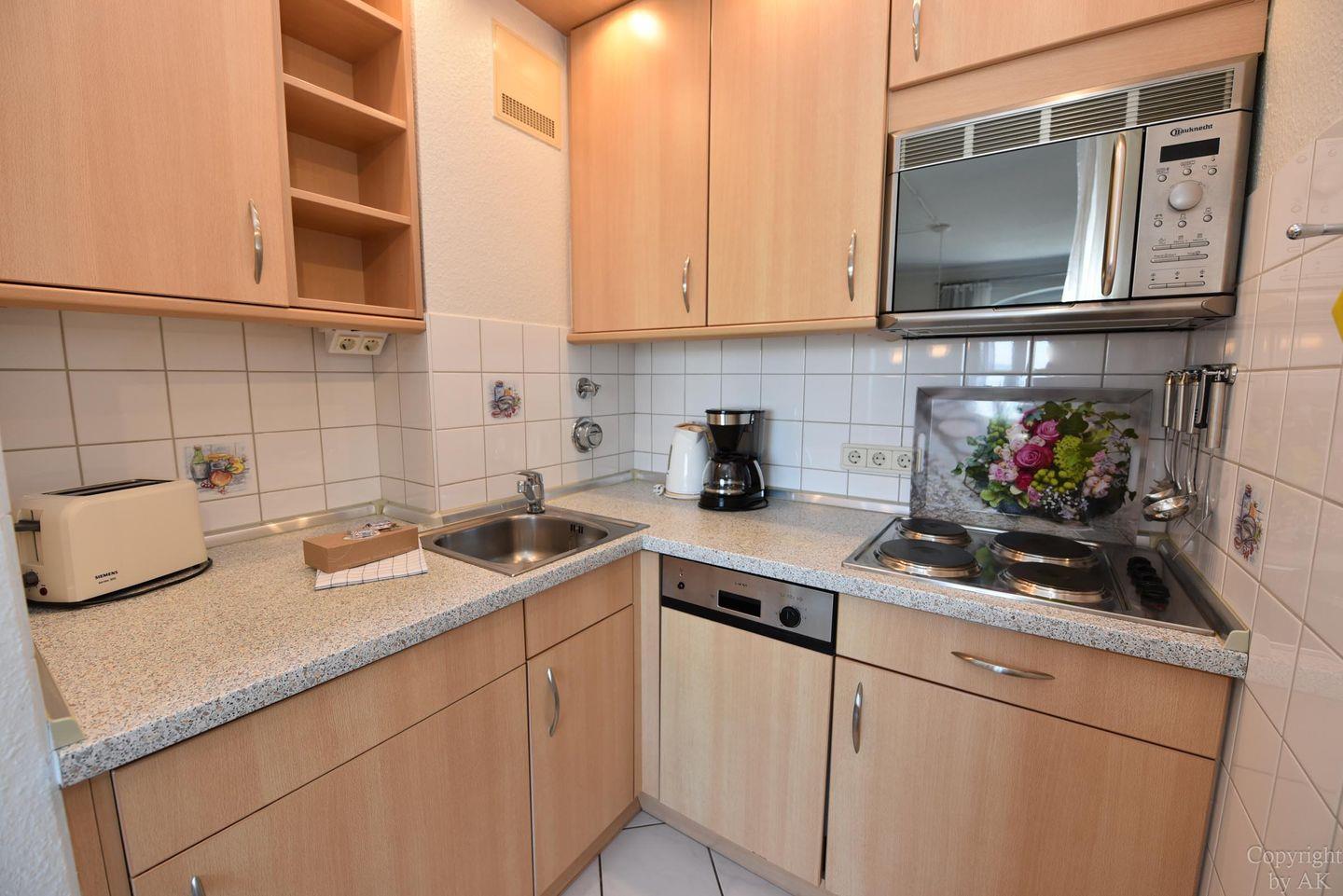 Die moderne Küchenzeile ist bestens ausgestattet mit Kühlschrank***, Back-Mikrowelle und Geschirrspülautomat. Sie ist offen zum Ess- und Wohnraum gestaltet und ermöglicht so ein geselliges Miteinander.