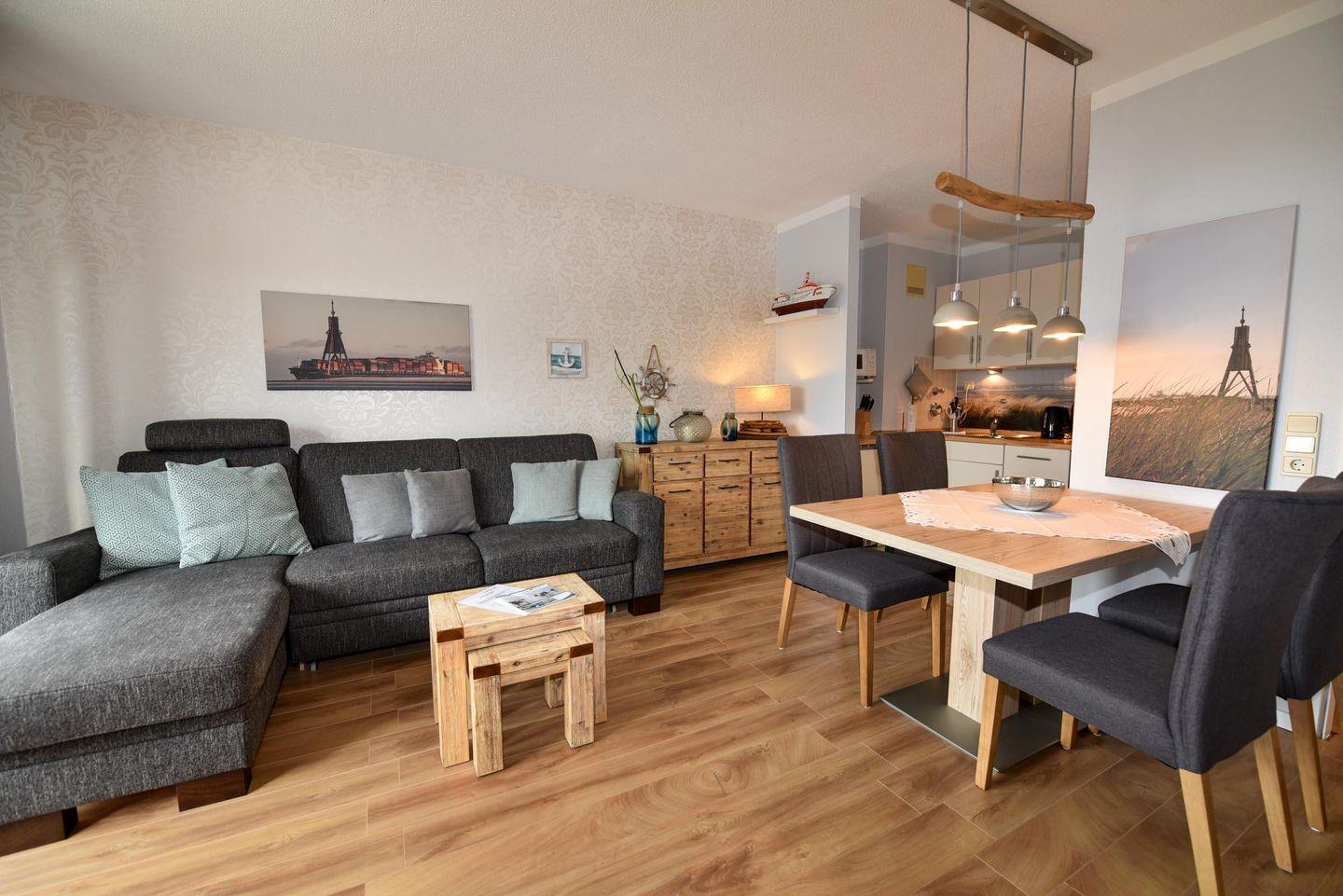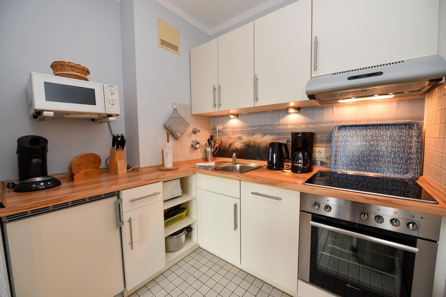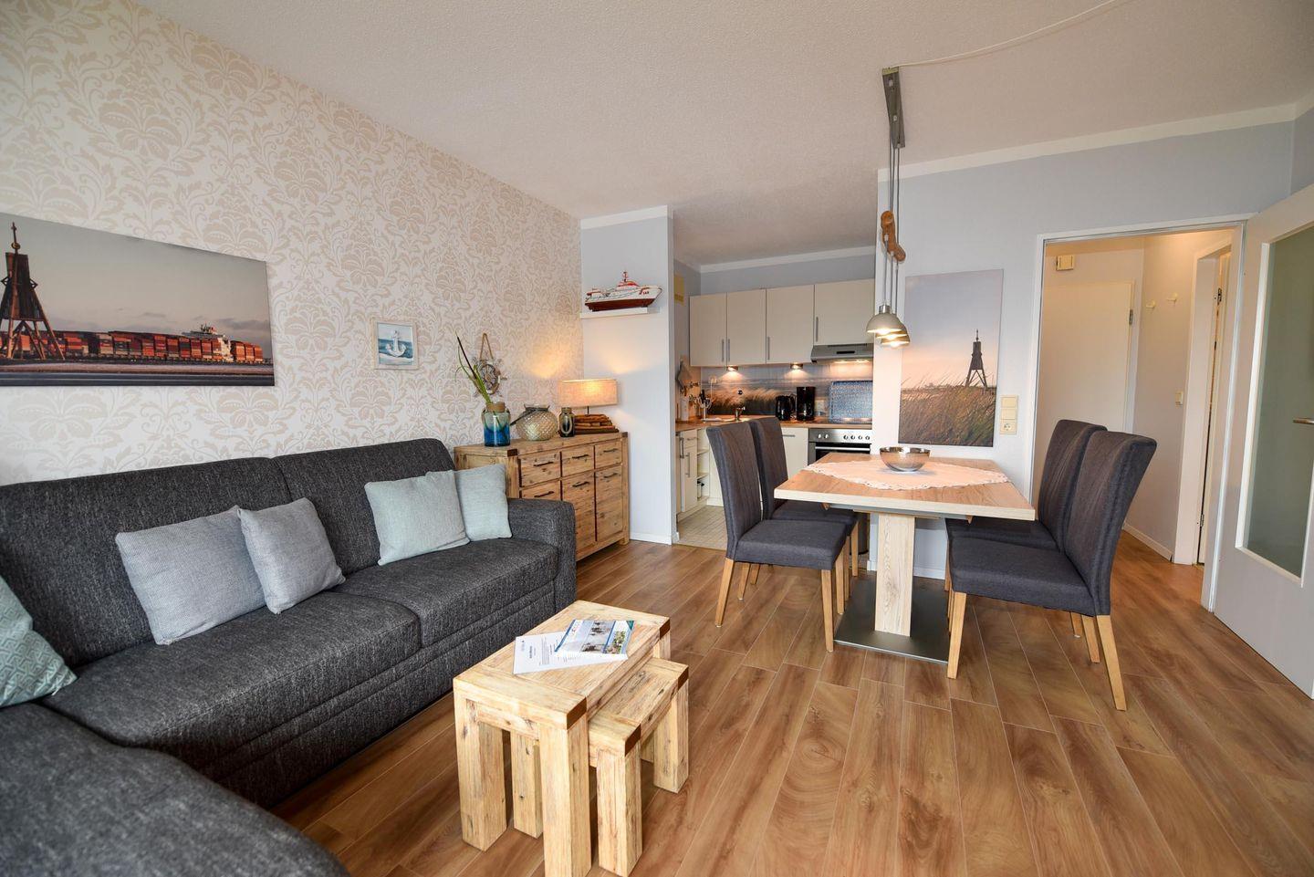 Freundliches und gepflegtes 2-Zimmer-Appartement im 3. Obergeschoss mit Laminatboden, geeignet für bis zu vier Personen. Das gemütlich eingerichtete Appartement verfügt über eine zum Essbereich offen gestaltete Küchenzeile, ausgestattet mit Geschirrspüler, Backofen sowie einer zusätzlichen Heißluftfritteuse, die den Komfort für die Selbstverpflegung weiter erhöht.