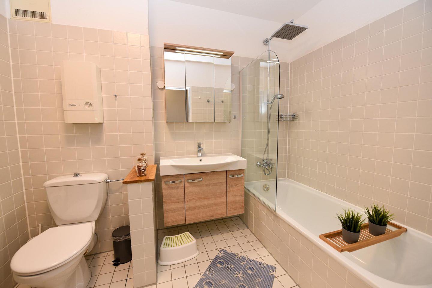 Das helle Dusch-/Wannenbad lädt zum Entspannen ein. Der kleine Balkon ist über eine Stufe erreichbar. Ein kostenfreier PKW-Stellplatz steht den Gästen ebenfalls zur Verfügung.