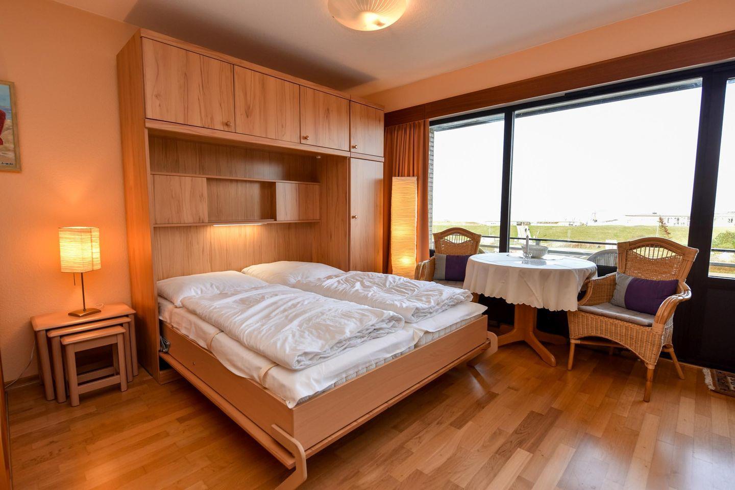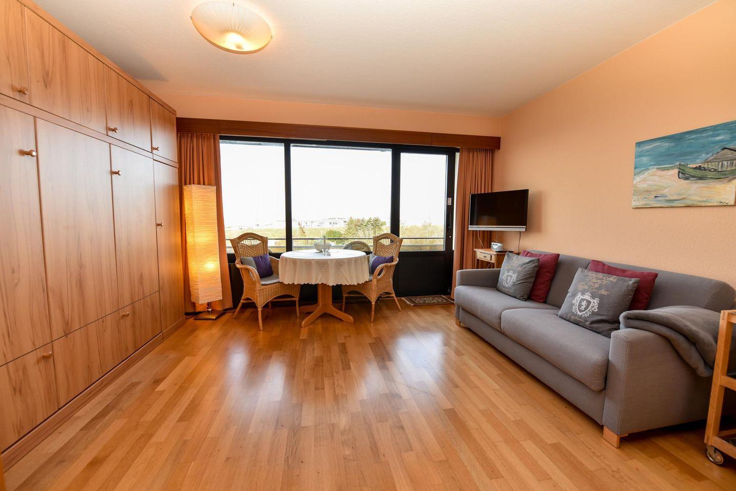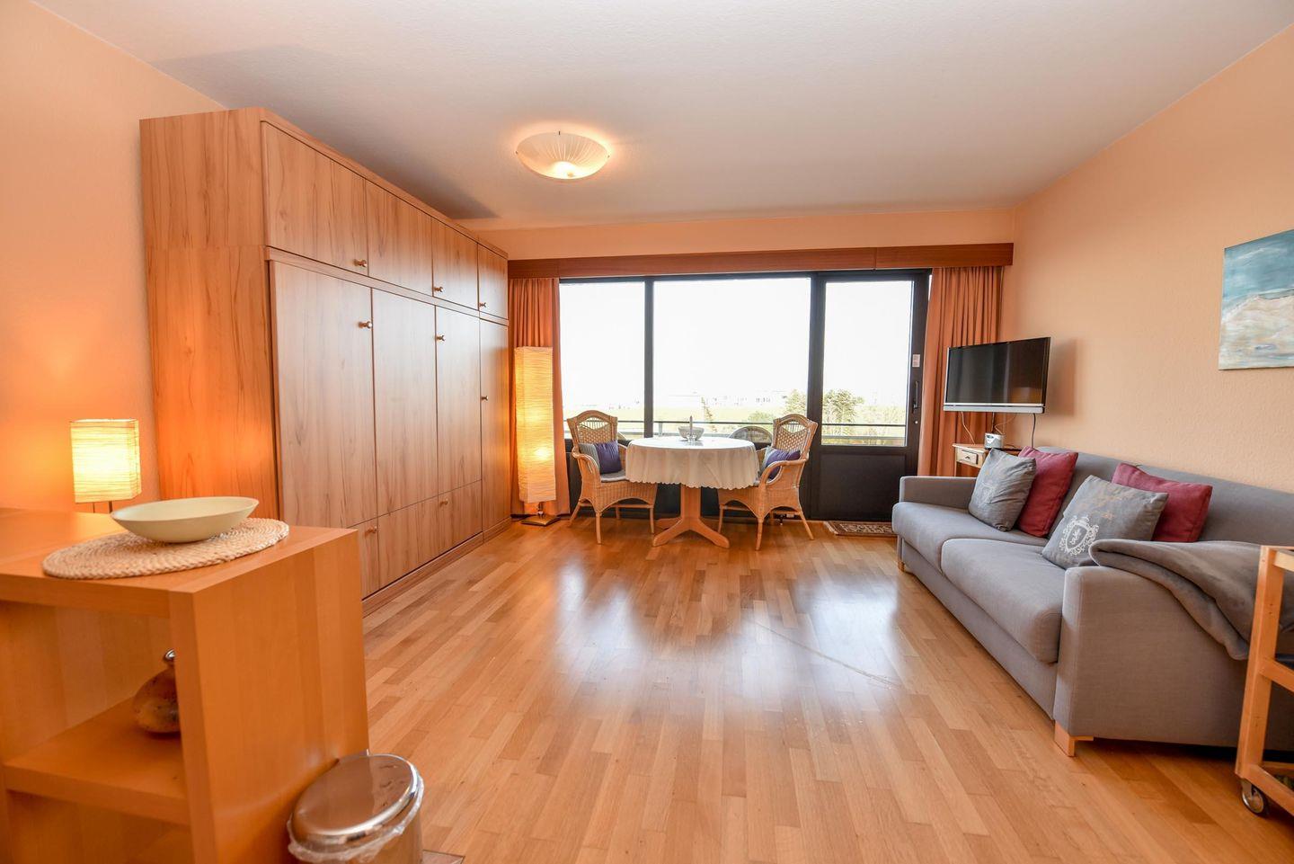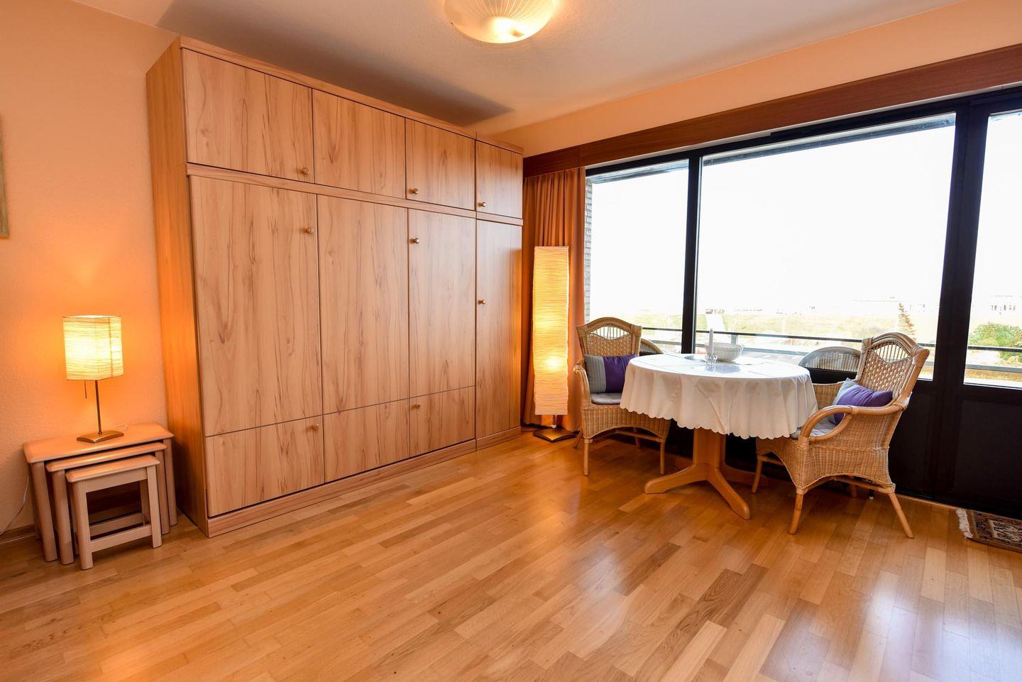 Das geräumige 1 1/2-Zimmer Appartement im Haus "Jan am Strand" liegt im 3. OG und verfügt über einen herrlichen Seeblick auf den Weltschifffahrtsweg. Eigener Strandkorb (01.05.-30.09.) Die Küchenzeile inkl. Mikrowelle ist in den Wohnraum integriert und lädt zum Kochen ein. Die Kleiderschränke befinden sich in einem separaten Raum mit Fenster in dem ggfs. auch ein Kinderbett oder Koffer genügend Platz finden. Das Appartement ist komfortabel für 2 Pers. eingerichtet und verfügt im Wohnbereich über einen Esszimmertisch mit 4 Stühlen, ein geräumiges Doppelbett versenkbar im Schrank, ein Sofa und 2 Korbsessel. Im Appartement befindet sich ferner ein Duschbad/WC, K-Flach-TV und ein großer Balkon. Der PKW-Tiefgaragenplatz hat eine Stellhöhe bis 190 cm.