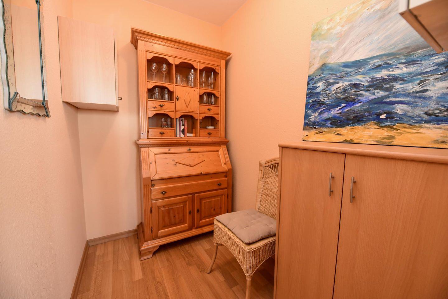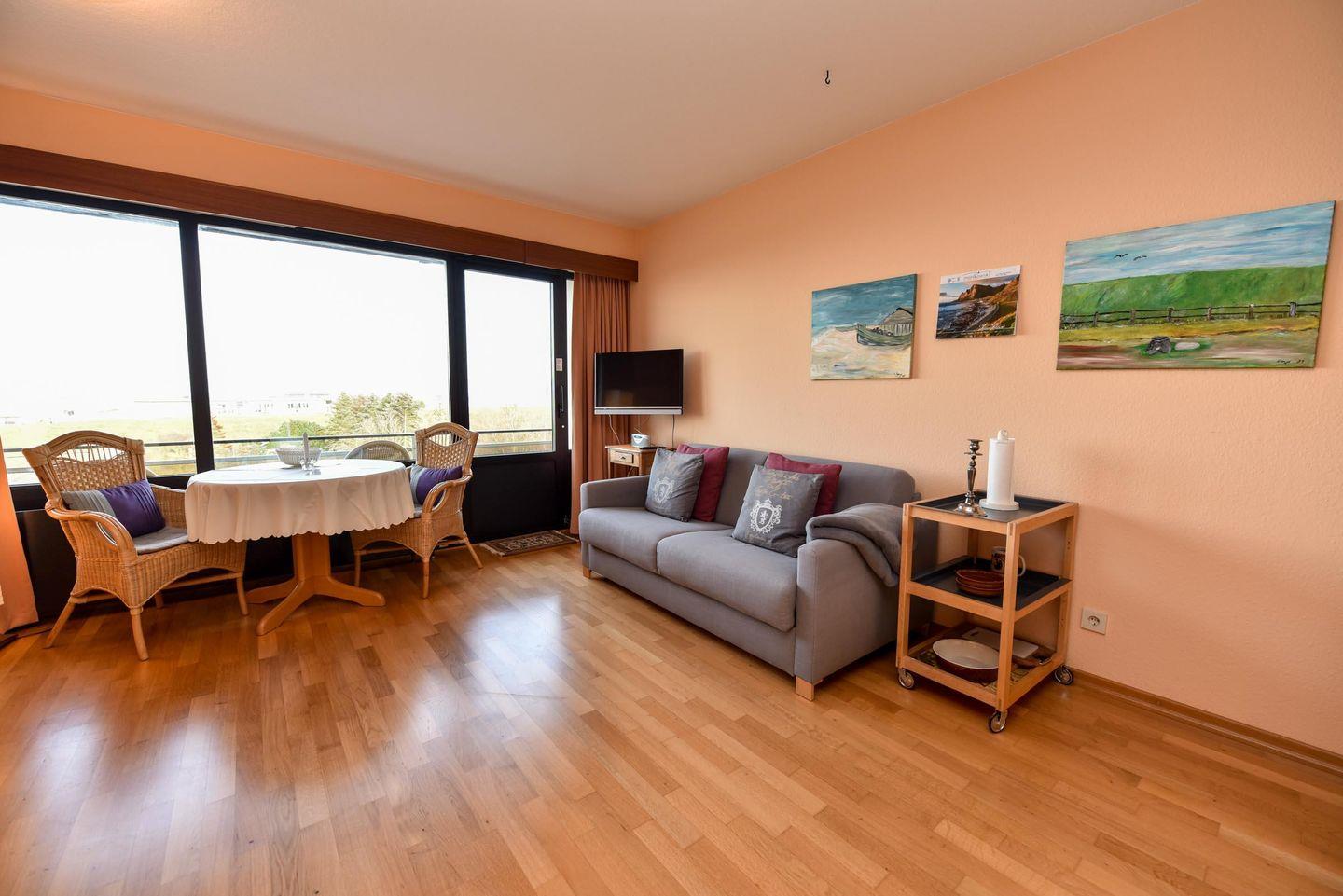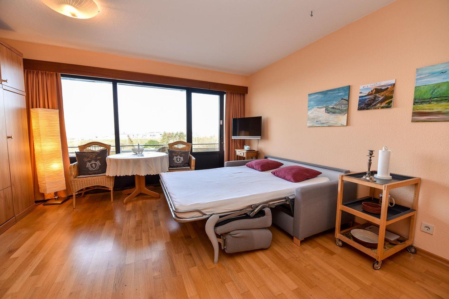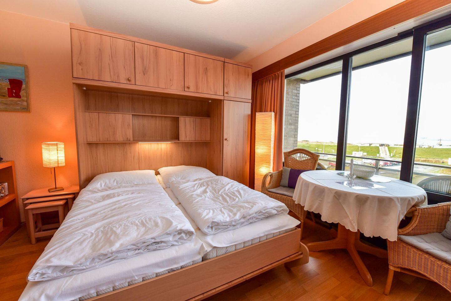 Das geräumige 1 1/2-Zimmer Appartement im Haus "Jan am Strand" liegt im 3. OG und verfügt über einen herrlichen Seeblick auf den Weltschifffahrtsweg. Eigener Strandkorb (01.05.-30.09.) Die Küchenzeile inkl. Mikrowelle ist in den Wohnraum integriert und lädt zum Kochen ein. Die Kleiderschränke befinden sich in einem separaten Raum mit Fenster in dem ggfs. auch ein Kinderbett oder Koffer genügend Platz finden. Das Appartement ist komfortabel für 2 Pers. eingerichtet und verfügt im Wohnbereich über einen Esszimmertisch mit 4 Stühlen, ein geräumiges Doppelbett versenkbar im Schrank, ein Sofa und 2 Korbsessel. Im Appartement befindet sich ferner ein Duschbad/WC, K-Flach-TV und ein großer Balkon. Der PKW-Tiefgaragenplatz hat eine Stellhöhe bis 190 cm.