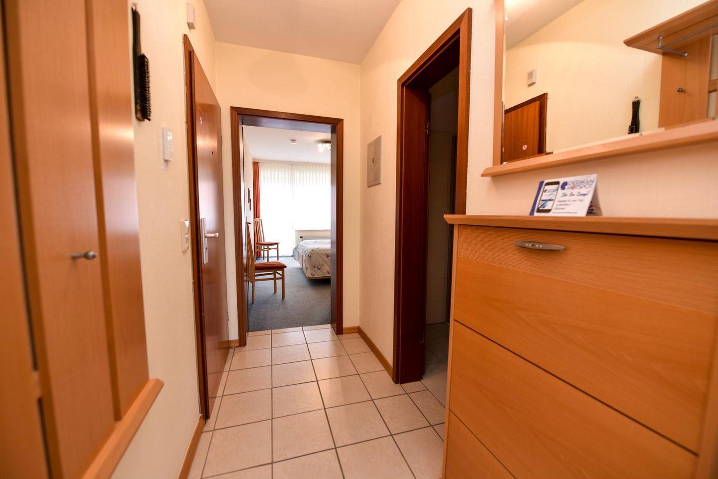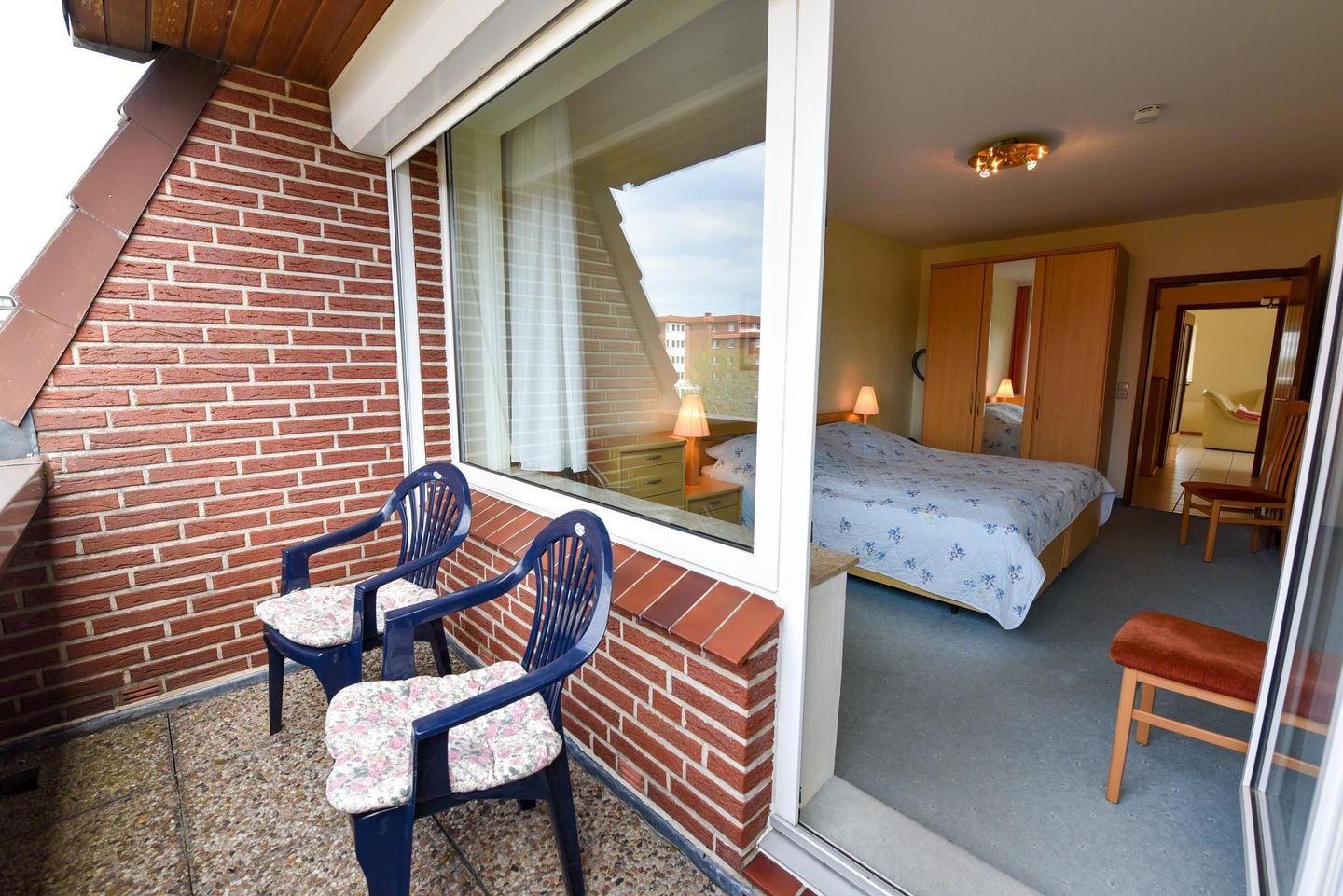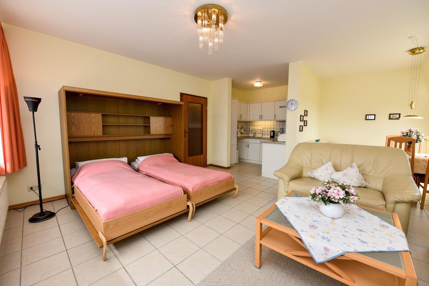 Großzügige 2-Zimmer-Ferienwohnung im 2.OG des Hauses LEE mit WLAN. Das zum Teil geflieste Appartement besteht aus 1 Wohn-/Ess-/Schlafraum mit Schrankbett, Esstisch und einer Couchgarnitur, sowie einer Einbauküche mit Mikrowelle und Geschirrspülautomat. Das Schlafzimmer bietet zwei Komfort-Einzelbetten, welche zusammen geschoben werden können, und noch zusätzlich Platz für ein Reisekinderbett. Es gibt ein modernes neues Duschbad mit WC. Zusätzlich verfügt das Appartement über Kabel-TV mit Flachbildschirm. Es gibt einen Süd- und einen West-Balkon. PKW-Stellplatz. Schwimmbadnutzung im Haus ist kostenfrei!