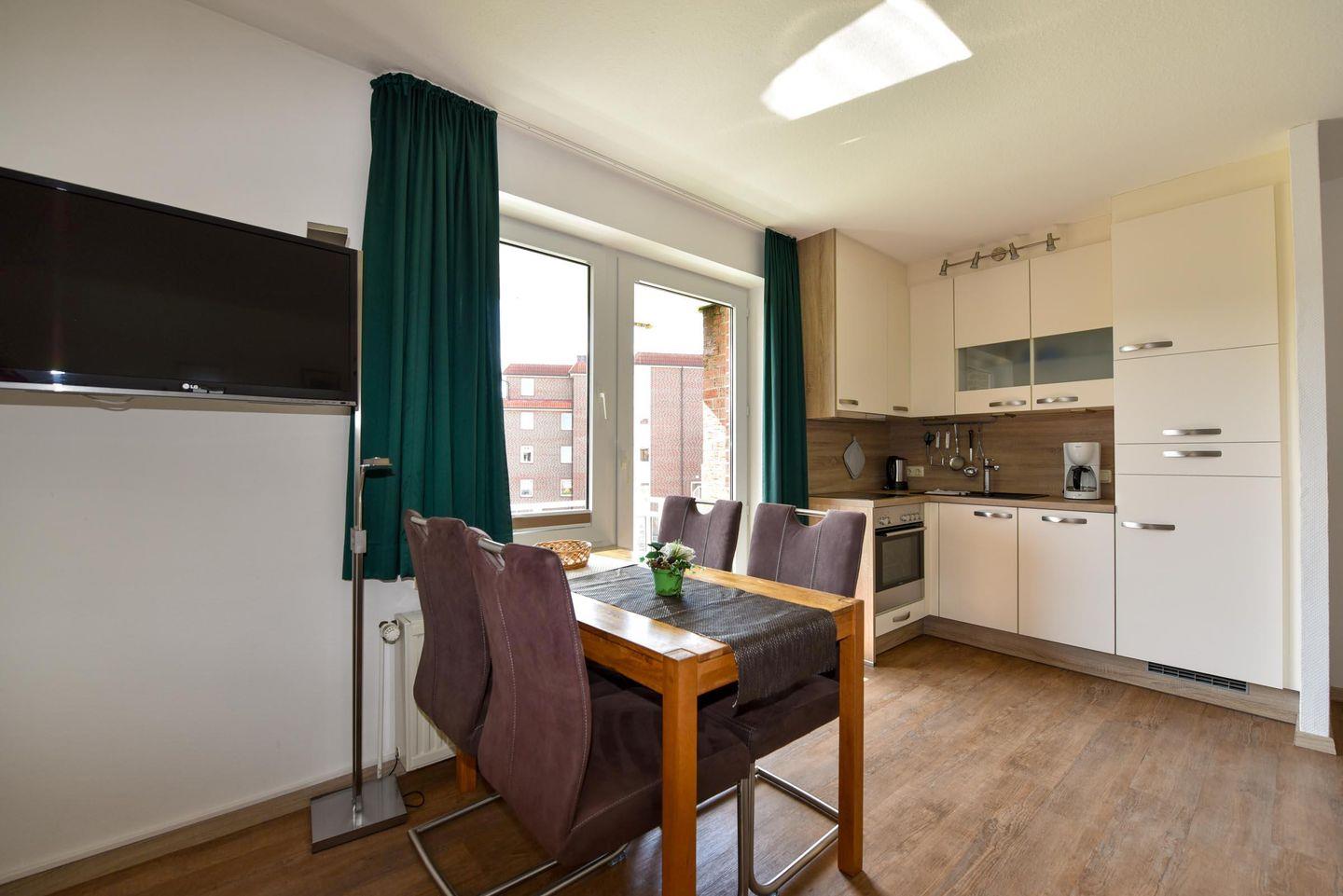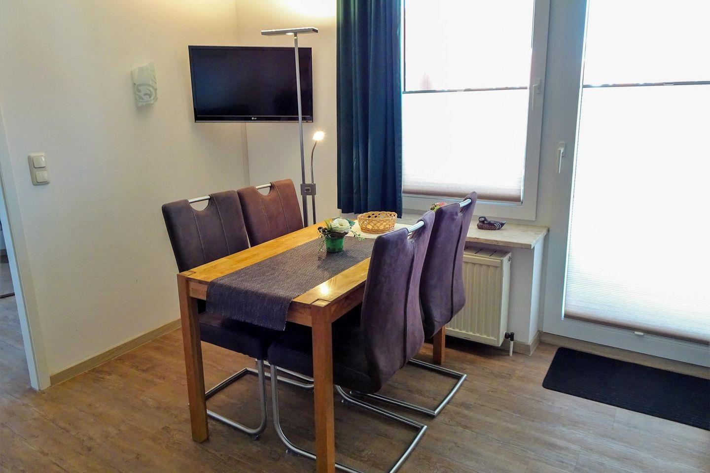 Im Wohnbereich erwartet Sie ein komfortables, modernes Schlafsofa, ein gemütlicher Sessel sowie ein Esstisch mit Platz für vier Personen. Das Schlafzimmer ist behaglich mit einem hochwertigen Boxspringbett eingerichtet, um Ihnen optimale Erholung zu gewährleisten. Zudem steht Ihnen ein Duschbad/WC zur Verfügung.
