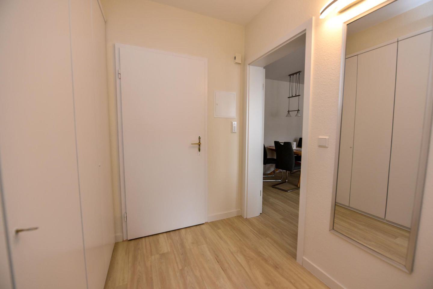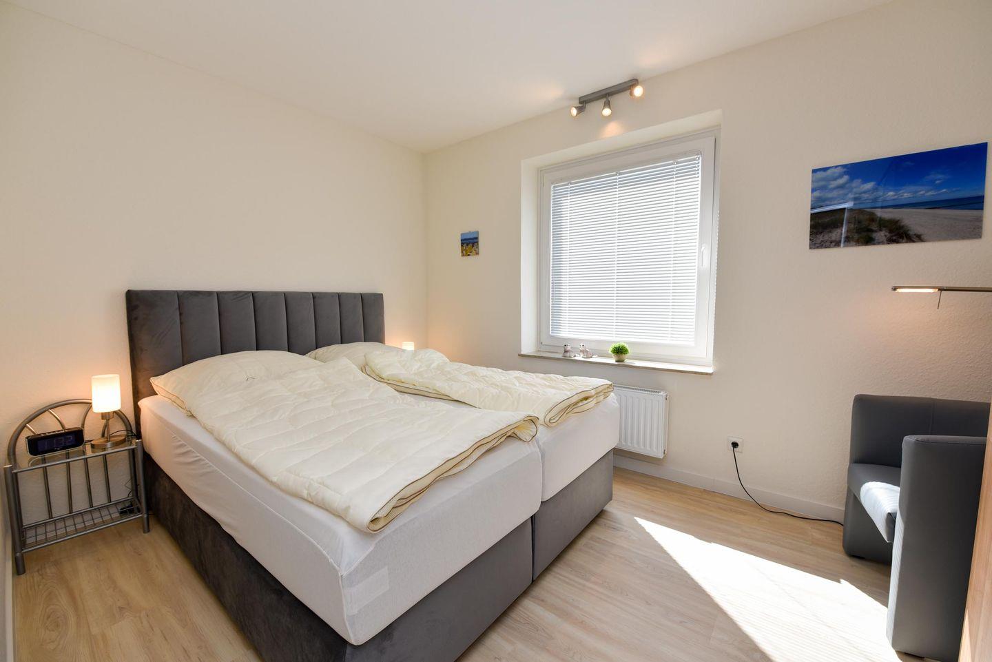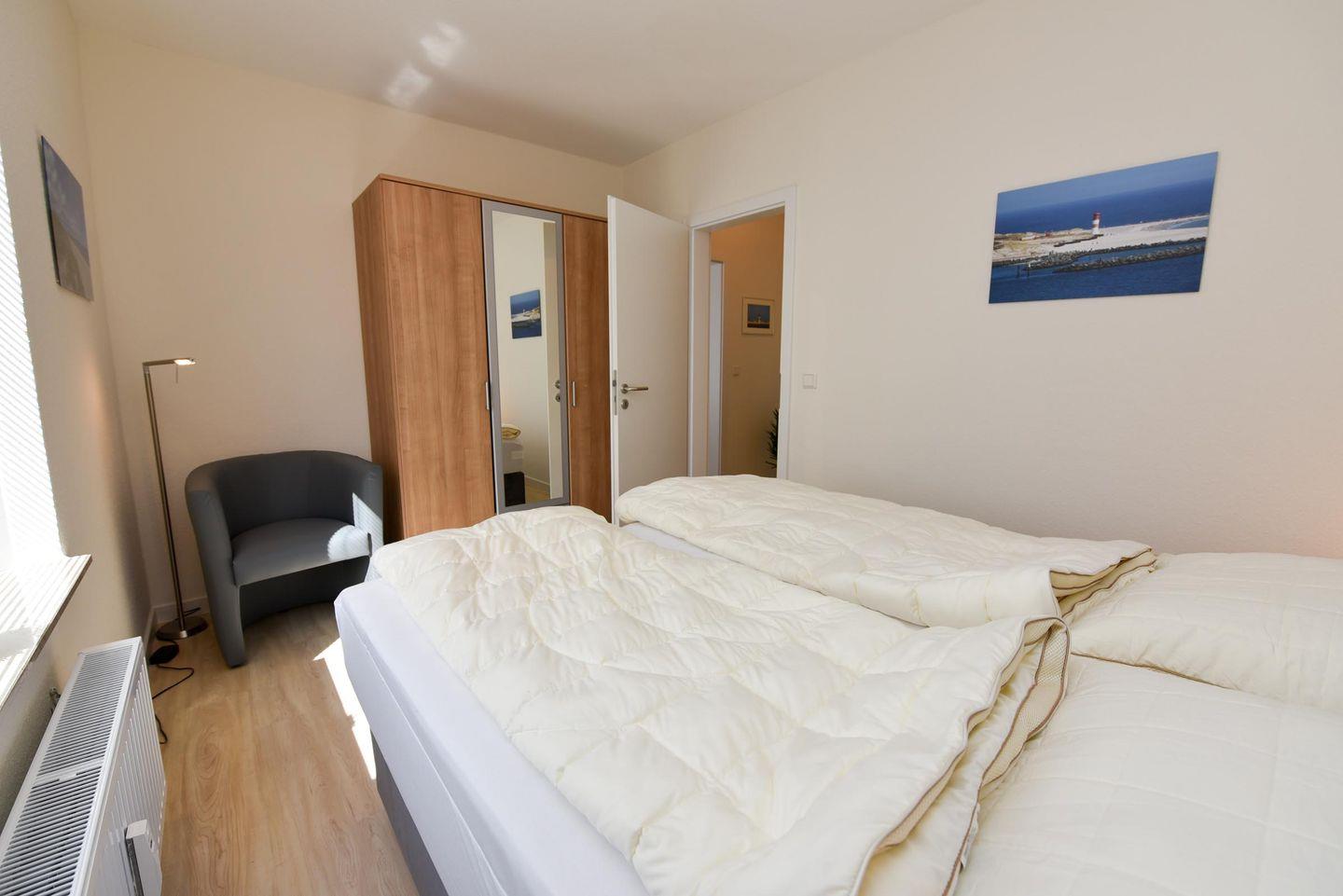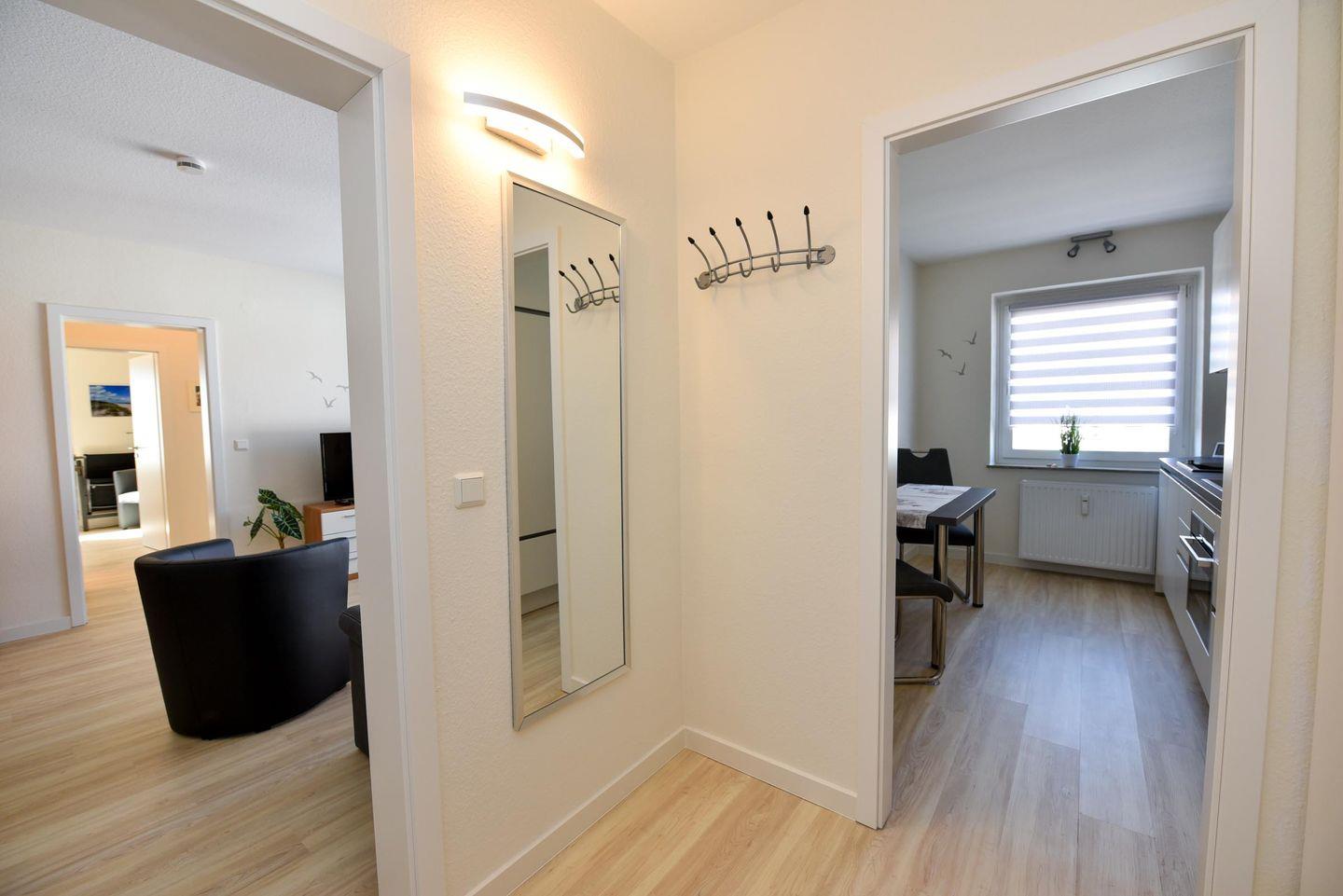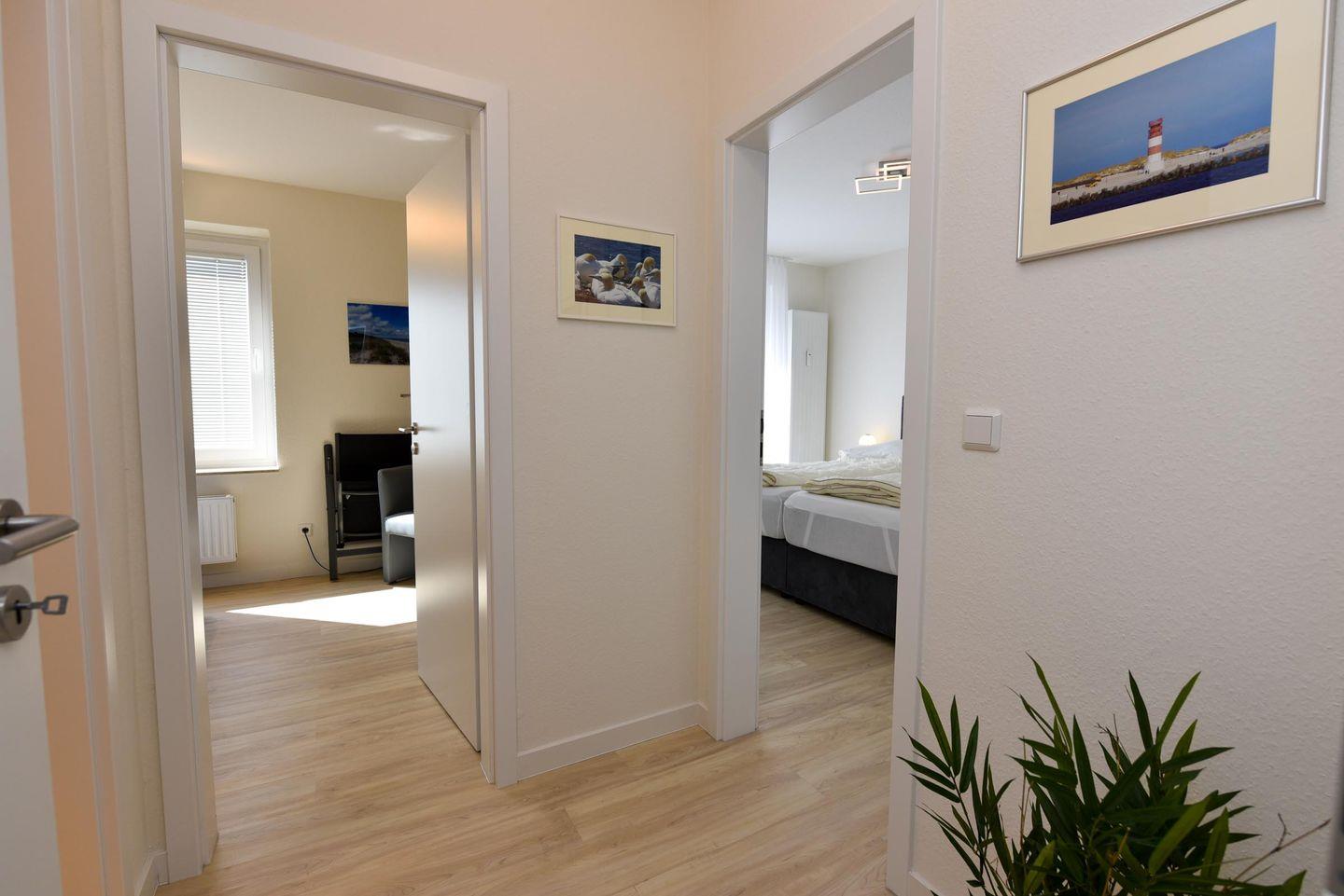 Der helle Wohnbereich lädt mit einem gemütlichen Sofa und einer separaten Essecke zum Verweilen ein. Vom ersten Flur gelangen Sie in die freundliche, voll ausgestattete Küche mit Ceranfeld, Backofen, Mikrowelle und Geschirrspüler – ideal für Selbstversorger. Über den zweiten Flur erreichen Sie die beiden Schlafzimmer, die jeweils mit komfortablen Boxspringbetten und geräumigen Kleiderschränken ausgestattet sind – perfekt für erholsamen Schlaf und ausreichend Stauraum.