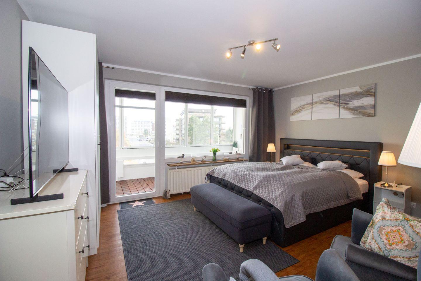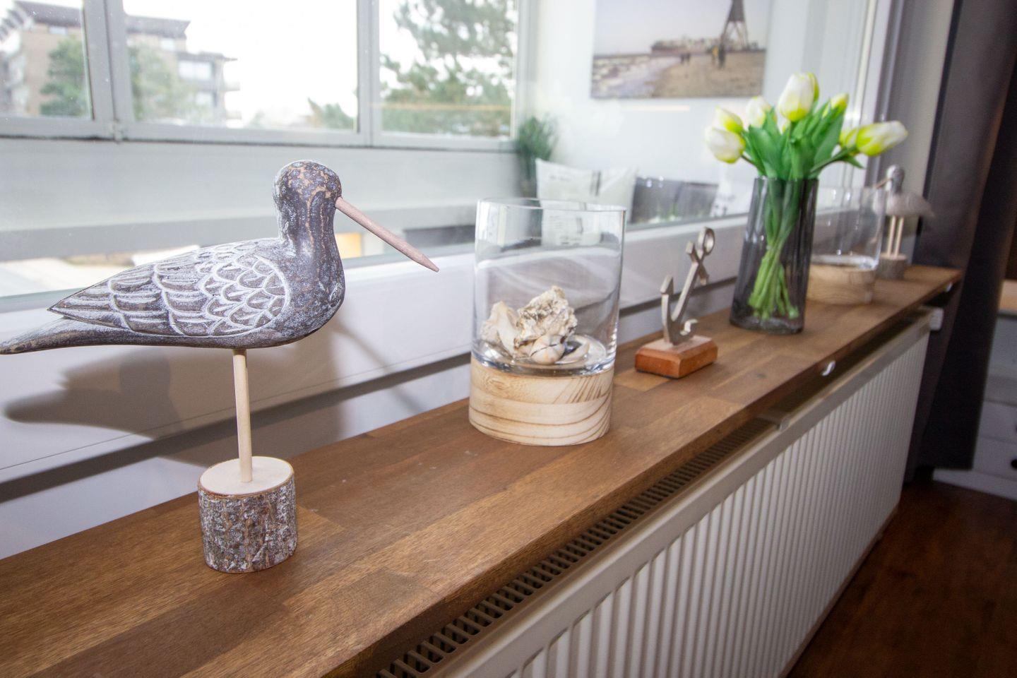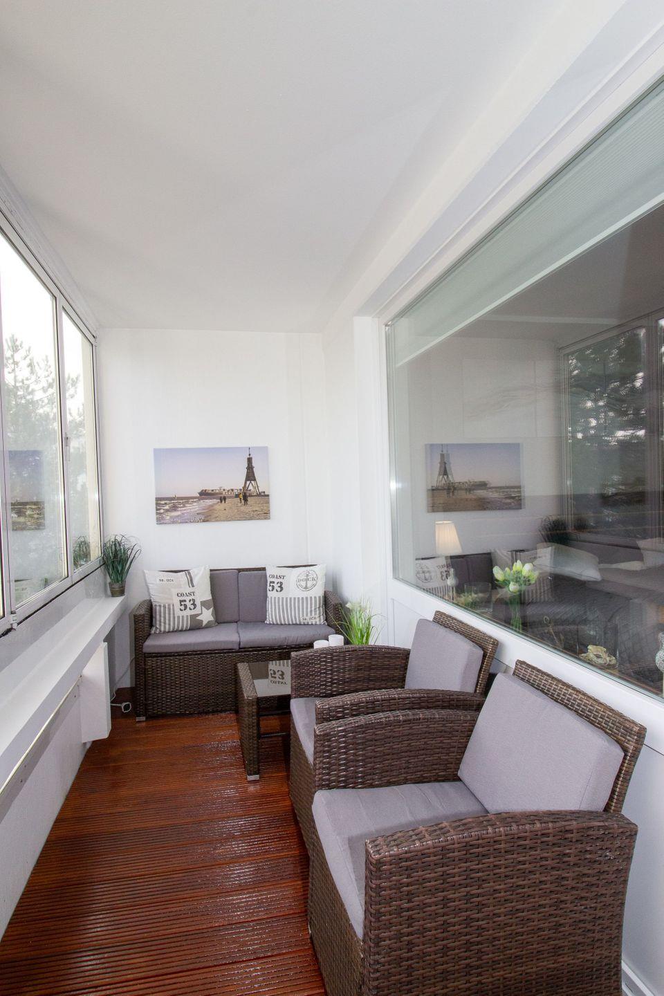 Die Wohnung bietet zudem einen geschlossenen Balkon in ruhiger Wintergarten-Atmosphäre, auf dem Gäste den Tag in bequemen Sitzmöbeln ausklingen lassen können. Bei Bedarf können einzelne Elemente des Balkons geöffnet werden, um frische Luft zu genießen.
