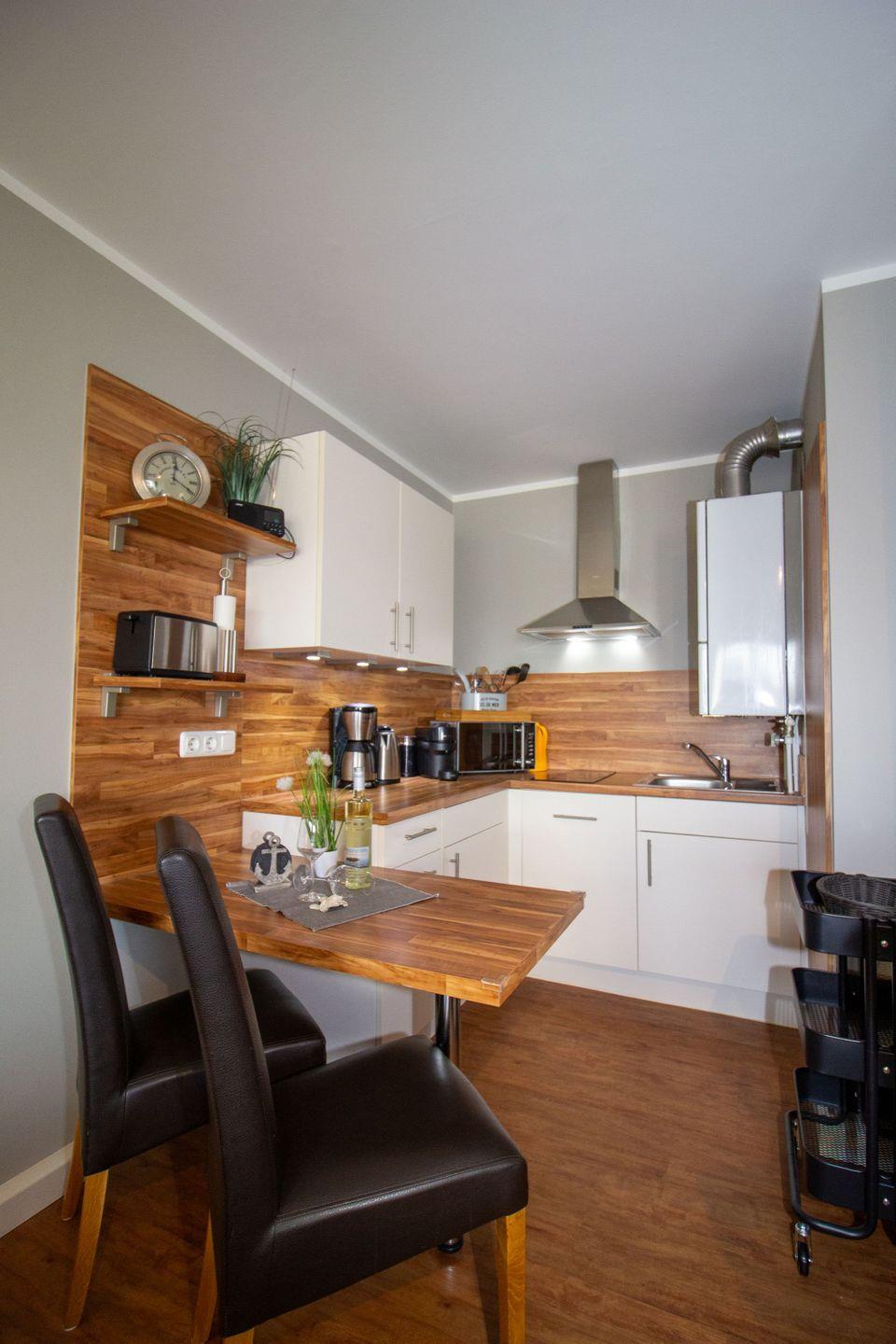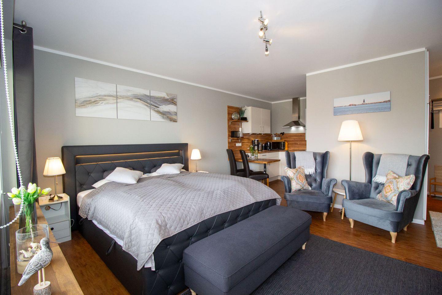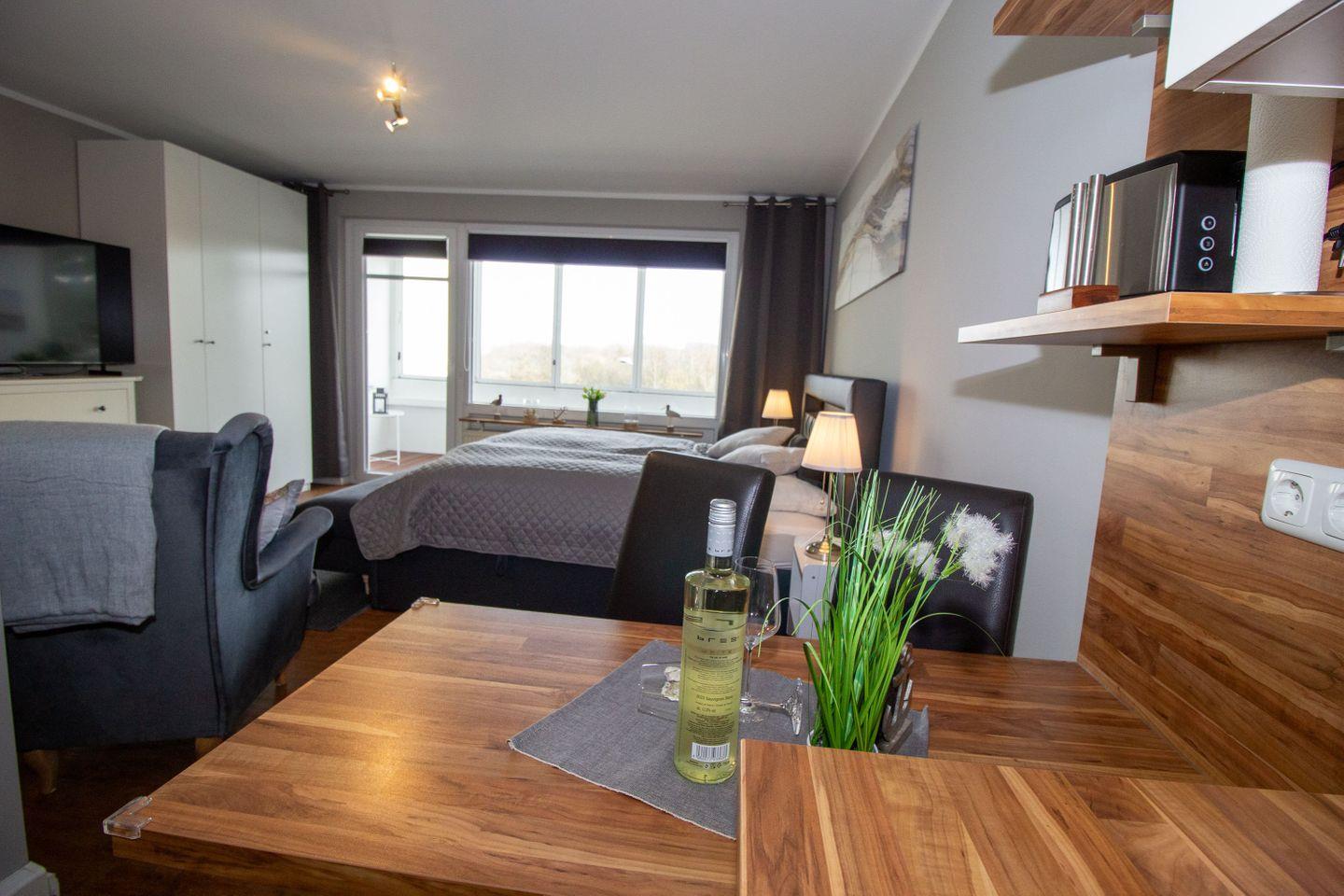 Modernes 1-Zimmer-Appartement in Cuxhaven-Döse mit Balkon, Strandkorb und Wellnessbereich.