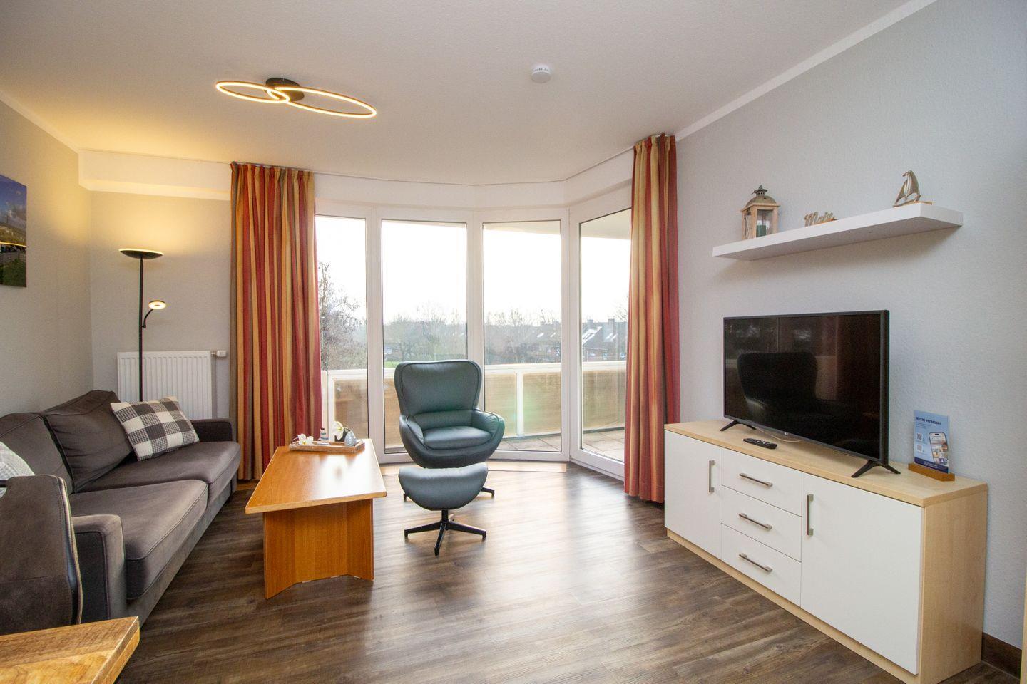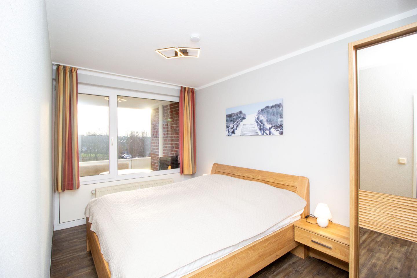 Haus "Trafalgar", Typ B, Appartement-Nr. 246, bis 4 Pers., 2.Etage, ca. 46 qm, Südseite (ohne Seesicht), Schlafzimmer mit Doppelbett, Wohnbereich mit Schlafcouch, Küchenzeile mit 4-Platten-Ceranfeld, Geschirrspüler und Mikrowelle, Dusche/WC, Fön, Balkon, Kabel-TV, kostenl. WLAN-Anschluss, Telefon, kostenloser W-Lan Zugang im App. Tiefgaragenstellplatz, Nichtraucherwohnung, Haustiere sind erlaubt, Strandkorb im Sommer 2025.