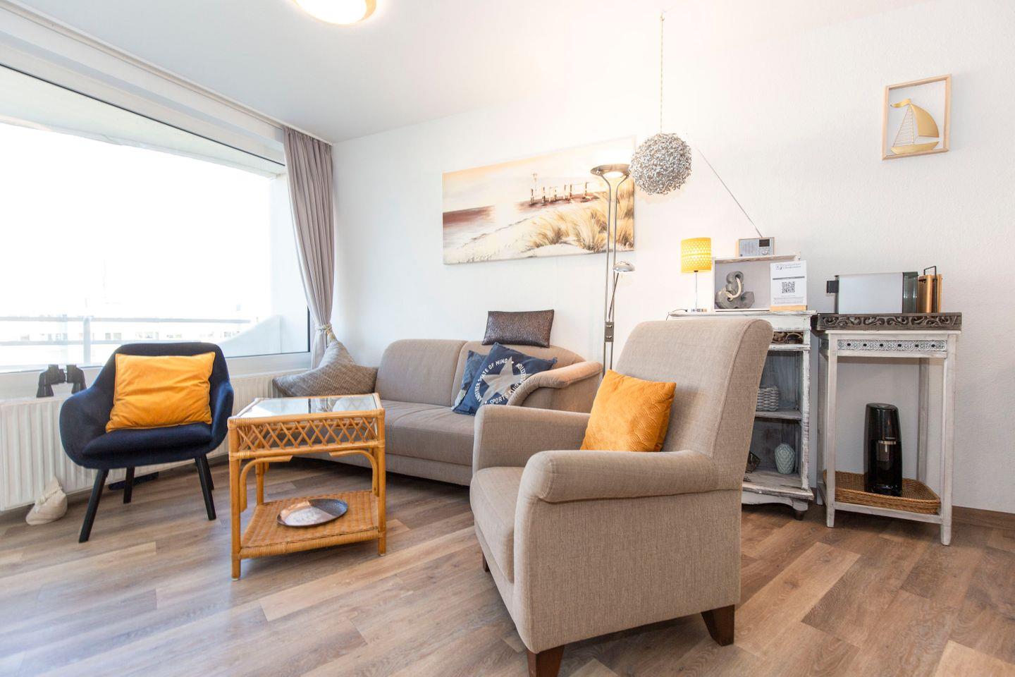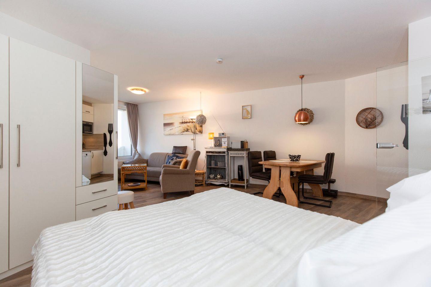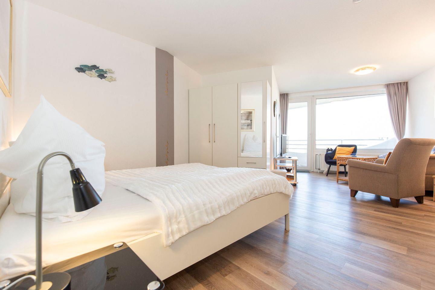 Haus "Lord Nelson", Typ 2, App.-Nr. "715", bis 3 Pers., 7. Etage, ca. 43 qm Größe, Weltschifffahrtsweg (seitlicher Meerblick Richtung Elbe), Wohnbereich mit Doppelbett, separates kleines Schlafzimmer mit Einzelbett und TV, Dusche/WC, Küchenzeile mit Geschirrspüler, Mikrowellen-Backofen-Kombigerät, W-Lan inklusive, Kabel-TV, ab 4 Übernachtungen einmalig p.P. Bettwäsche und Handtücher inkl., Balkon, Tiefgaragenstellplatz, Strandkorb im Sommer 2026.