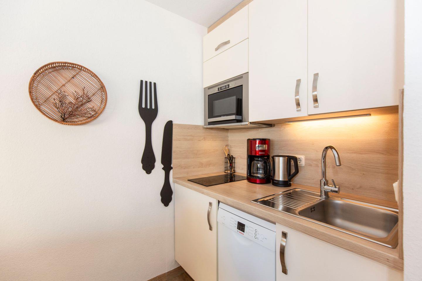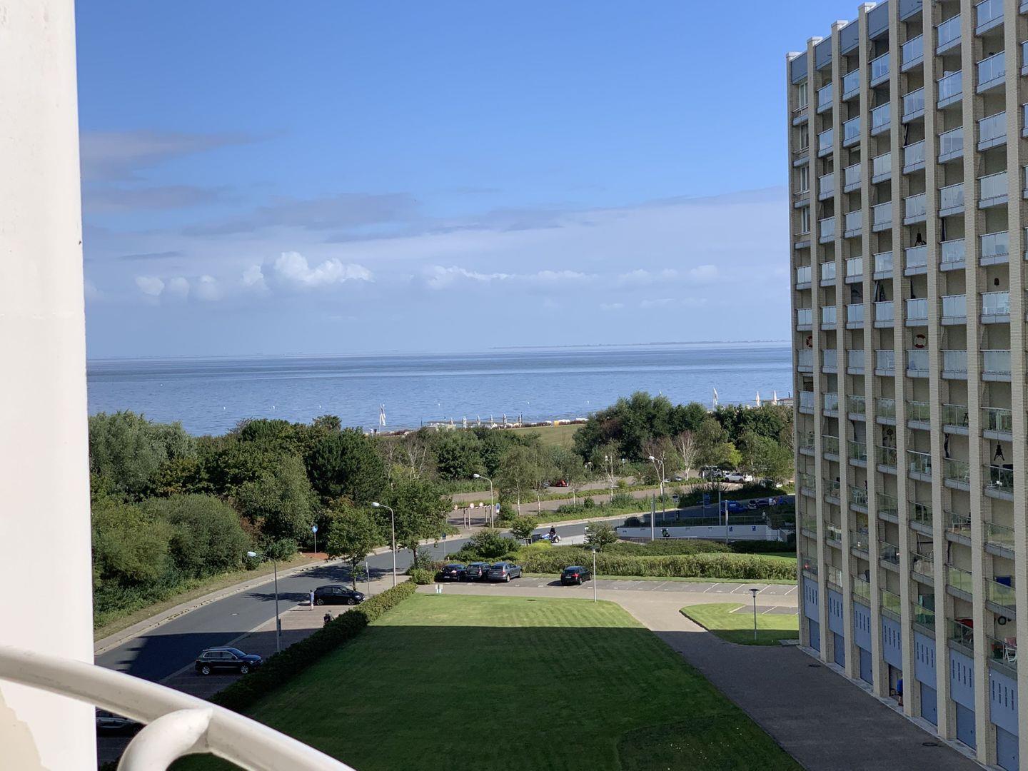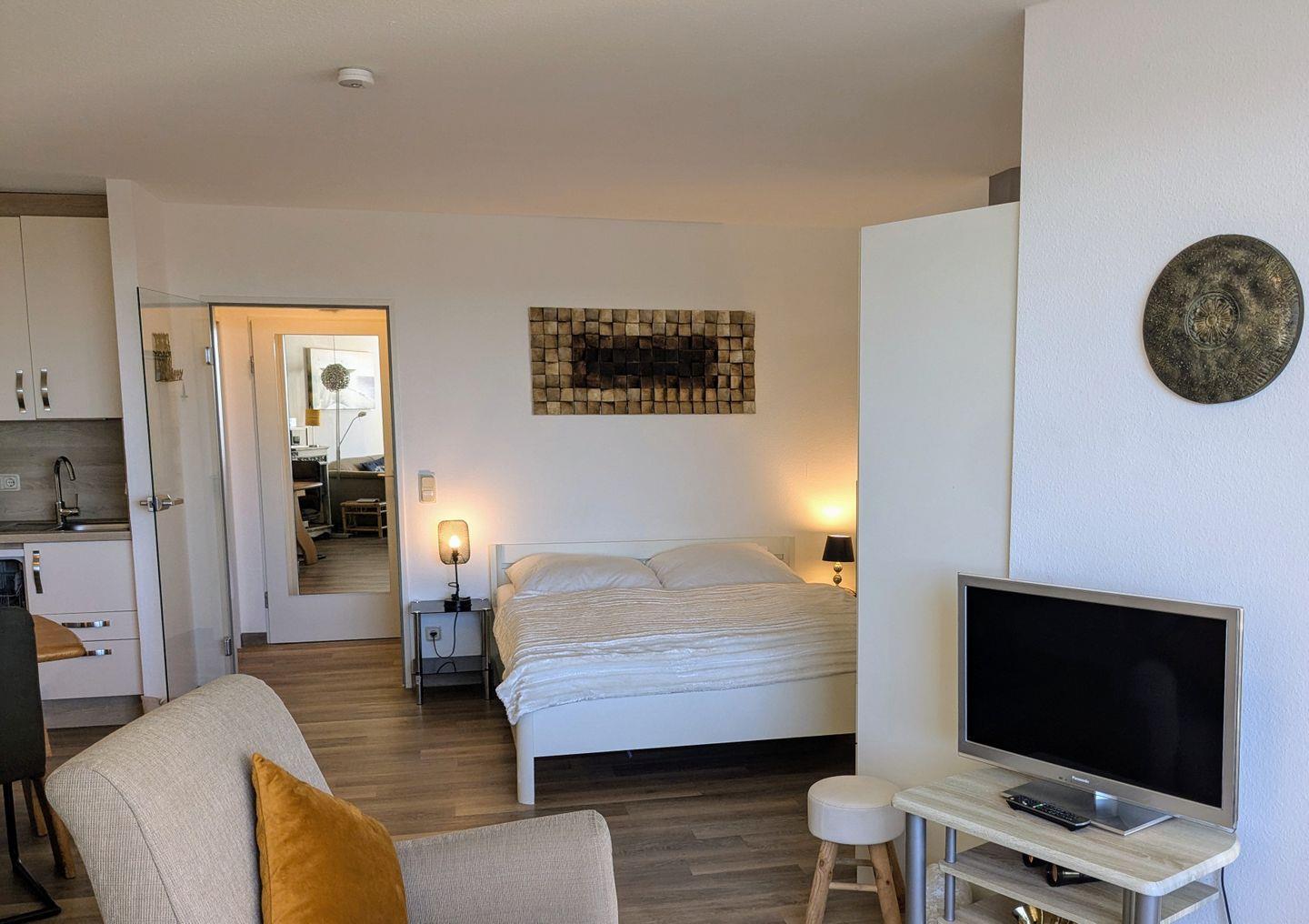Haus "Lord Nelson", Typ 2, App.-Nr. "715", bis 3 Pers., 7. Etage, ca. 43 qm Größe, Weltschifffahrtsweg (seitlicher Meerblick Richtung Elbe), Wohnbereich mit Doppelbett, separates kleines Schlafzimmer mit Einzelbett und TV, Dusche/WC, Küchenzeile mit Geschirrspüler, Mikrowellen-Backofen-Kombigerät, W-Lan inklusive, Kabel-TV, ab 4 Übernachtungen einmalig p.P. Bettwäsche und Handtücher inkl., Balkon, Tiefgaragenstellplatz, Strandkorb im Sommer 2026.