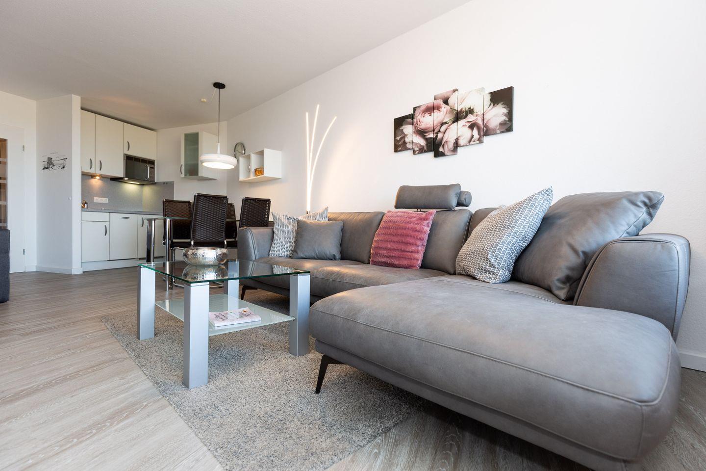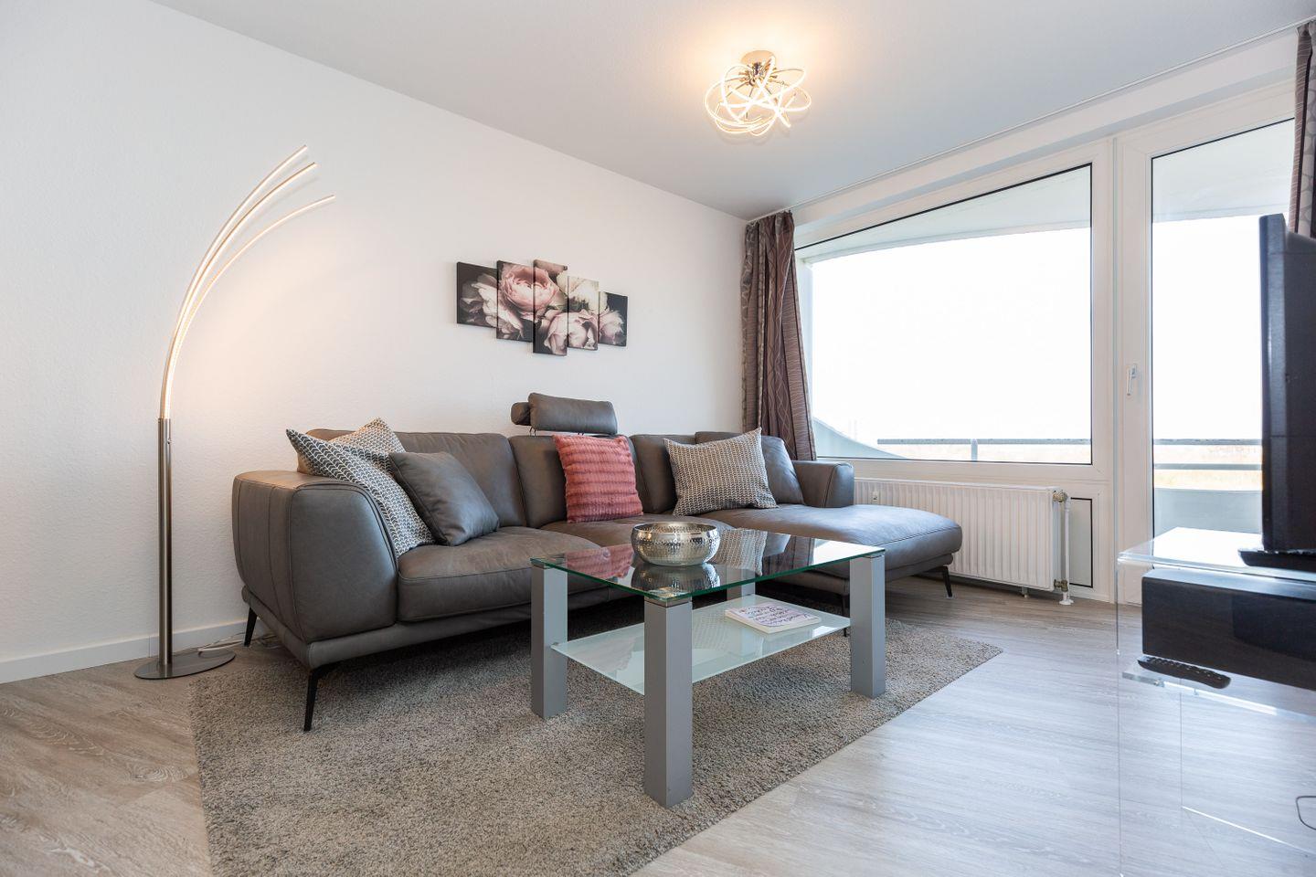 Die 2-Zimmer-Ferienwohnung für 4 Personen befindet sich in direkter Strandnähe. Die moderne Einrichtung mit grauem Sofa und hellem Bodenbelag kreieren ein elegantes Bild. Ein Westbalkon lädt zum Beobachten farbenreicher Sonnenuntergänge ein. Die Kugelbake an der Elbmündung, der Miniaturgolfpark Döse und der Zoo im Kurpark Döse sind in wenigen Gehminuten zu erreichen. Von der Aussichtsplattform "Alte Liebe" können Sie die großen Schiffe bestaunen oder selbst an einer Schifffahrt zu einem der vielen Ausflugsziele in der Umgebung teilnehmen.