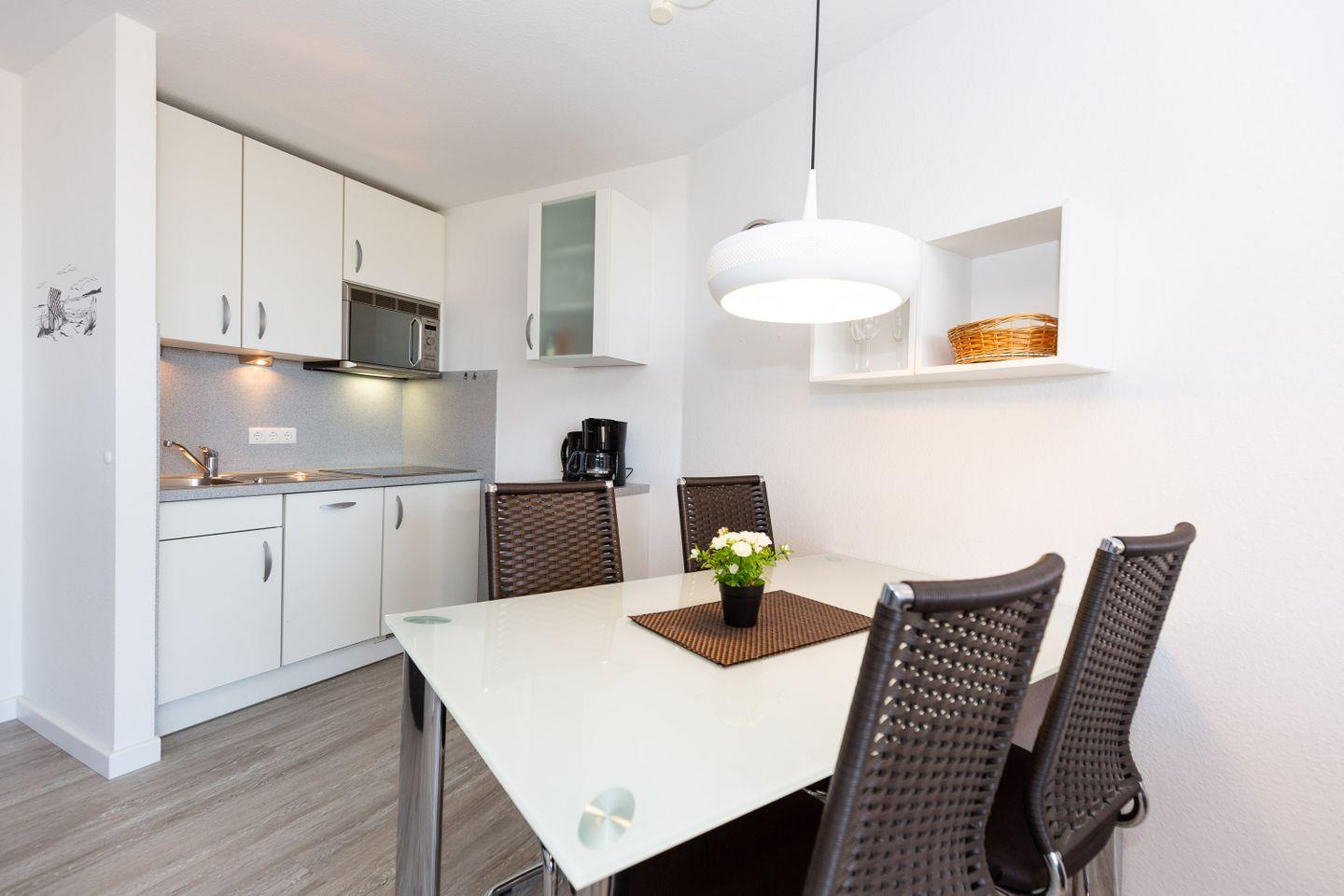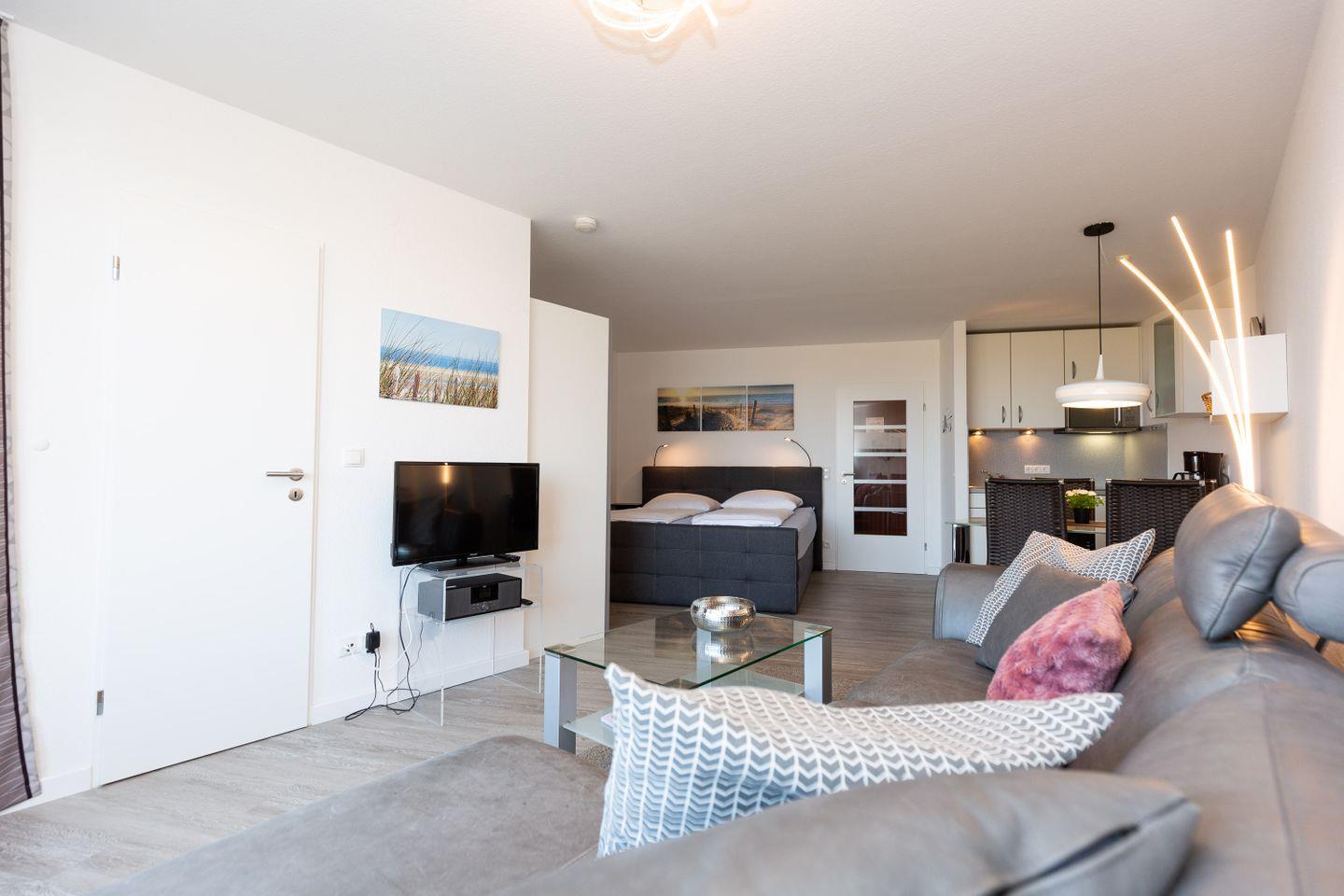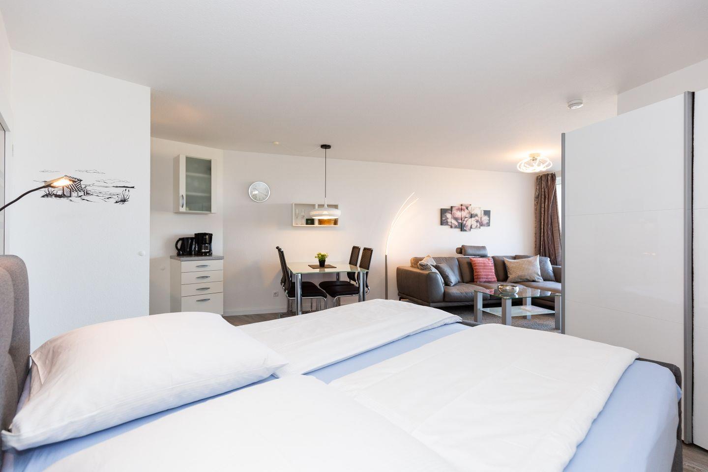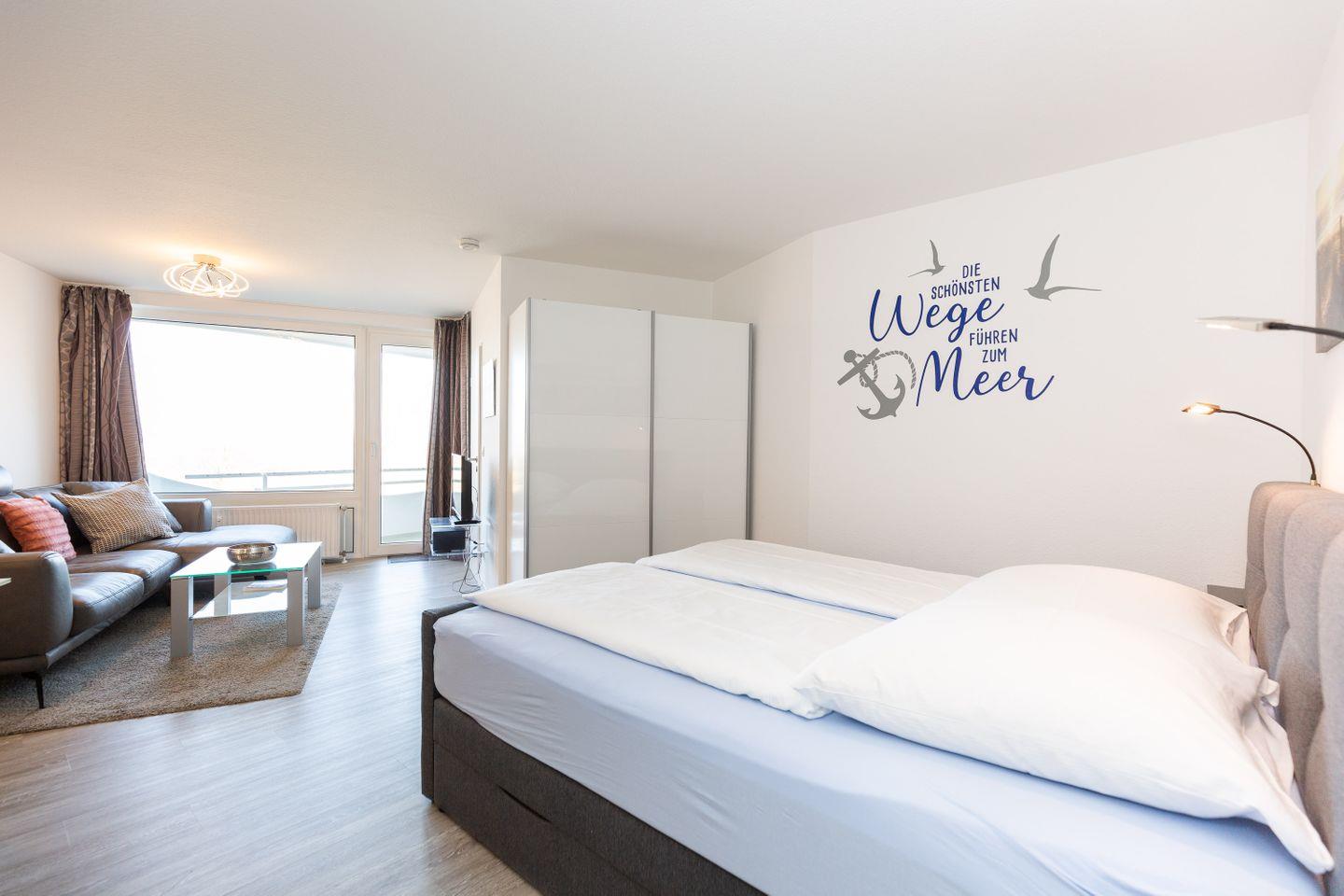 Moderne 2-Zimmer-Ferienwohnung in Cuxhaven-Döse mit Meerblick, Schwimmbad, Sauna und Balkon in direkter Strandnähe.