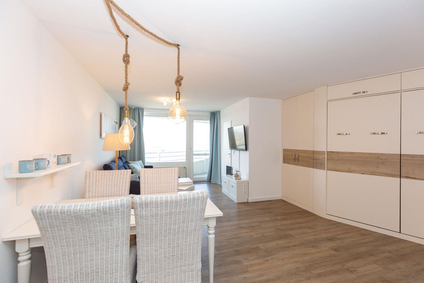 Haus "Lord Nelson", Typ 2, App.-Nr. 602, bis 4 Pers., 6.Etage, ca. 40 qm Wohnungsgröße, Weltnaturerbe Wattenmeer (Meerblick Richtung Neuwerk), Wohnbereich mit Schrankbett, separates Schlafzimmer mit Etagenbett, Dusche/WC, Küchenzeile mit Geschirrspüler, 4-Platten-Ceranfeld und Mikrowelle mit Back- und Grillfunktion,