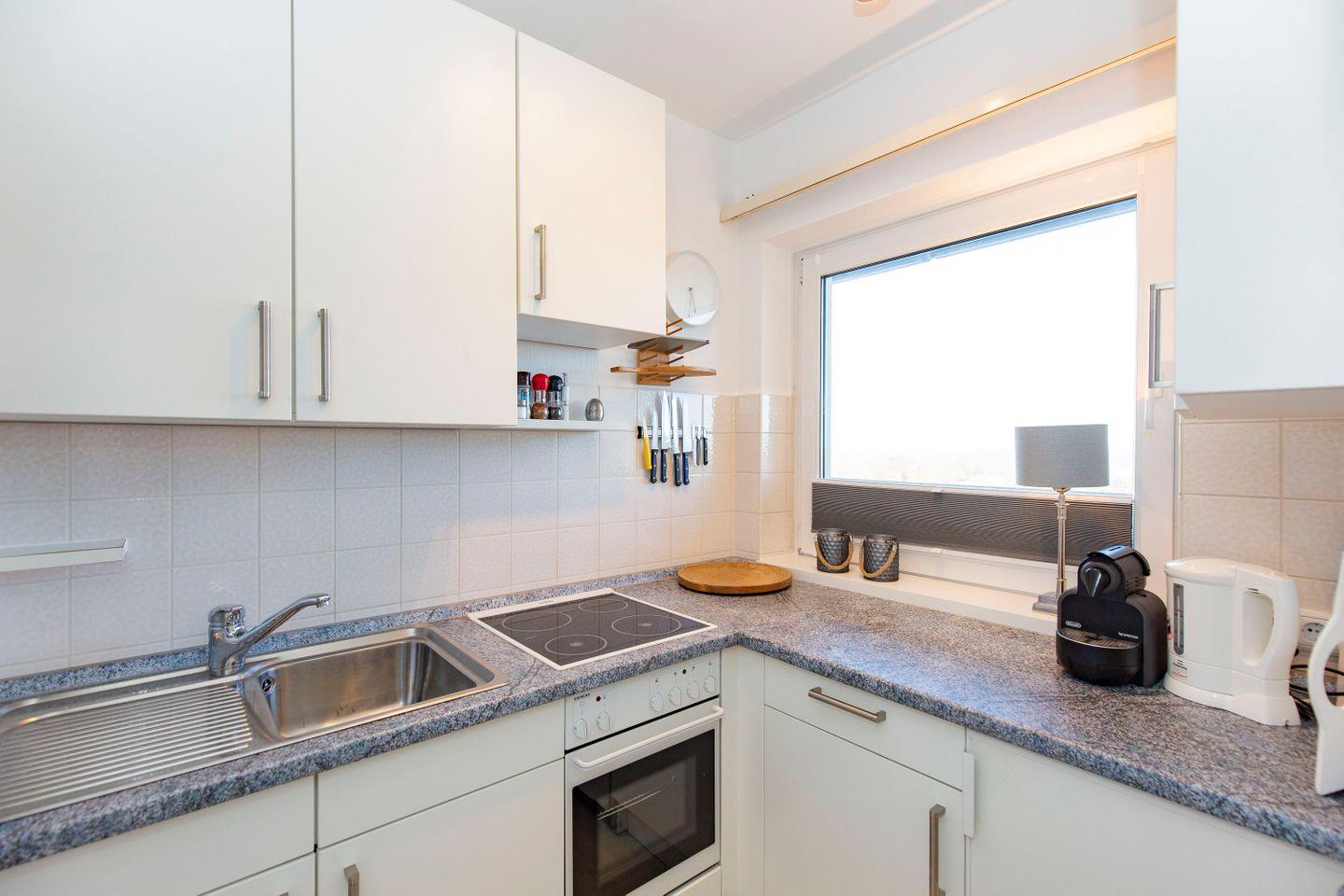 Aussicht nach Neuwerk und zur Elbmündung vom Balkon und Wohnzimmer, Aussicht auf die Kugelbake und das Hafengebiet von Cuxhaven aus der Küche und dem Esszimmer, diese Ferienwohnung bietet einen großartigen Ausblick auf die Umgebung. In direkter Strandnähe erwartet unsere Urlaubsgäste in dieser 54 m² großen Ferienwohnung eine moderne Einrichtung in angenehmen Weiß- und Grautönen. Die Wohnung bietet Platz für bis zu 3 Personen.