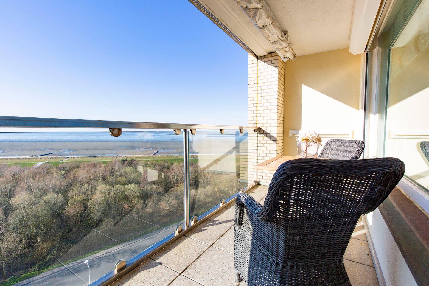 Der Balkon der Ferienwohnung bietet die beeindruckende Aussicht über den Grünstreifen Richtung Strand und Nordsee. Hier können die Urlaubsgäste jederzeit die frische Nordseeluft und den weiten Ausblick nach Neuwerk und Richtung Elbmündung genießen. Das Balkongeländer besteht aus Glasscheiben, so dass die Aussicht ohne Einschränkungen vorhanden ist.