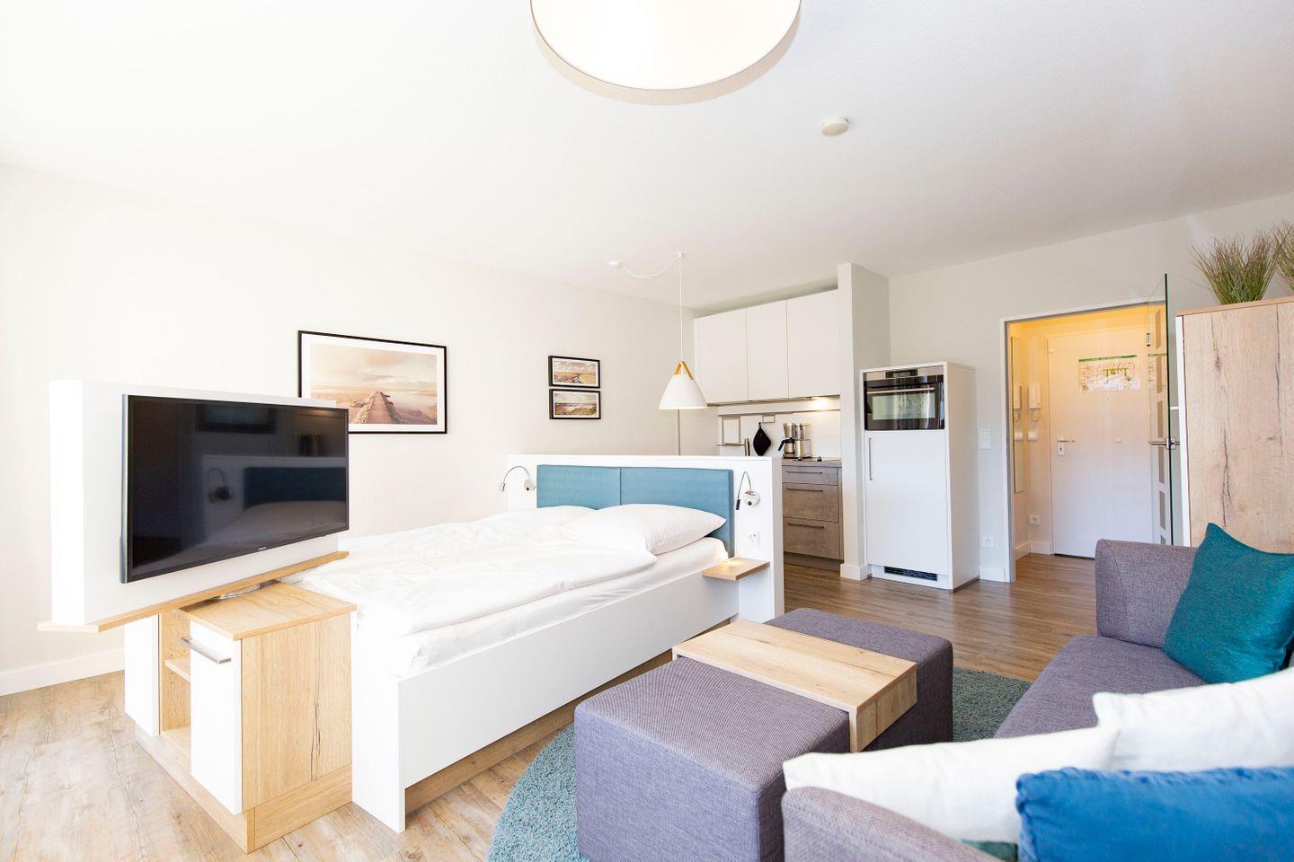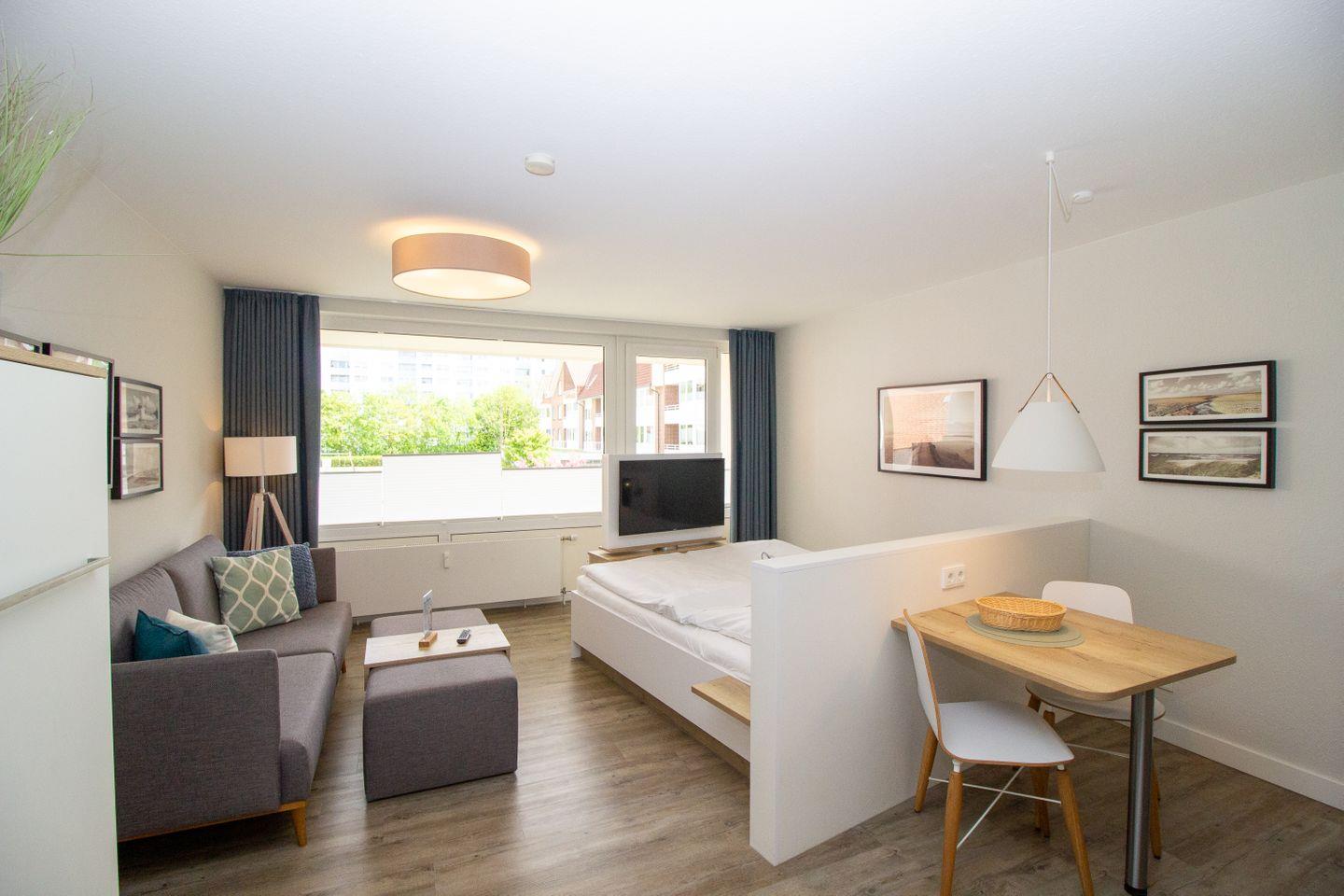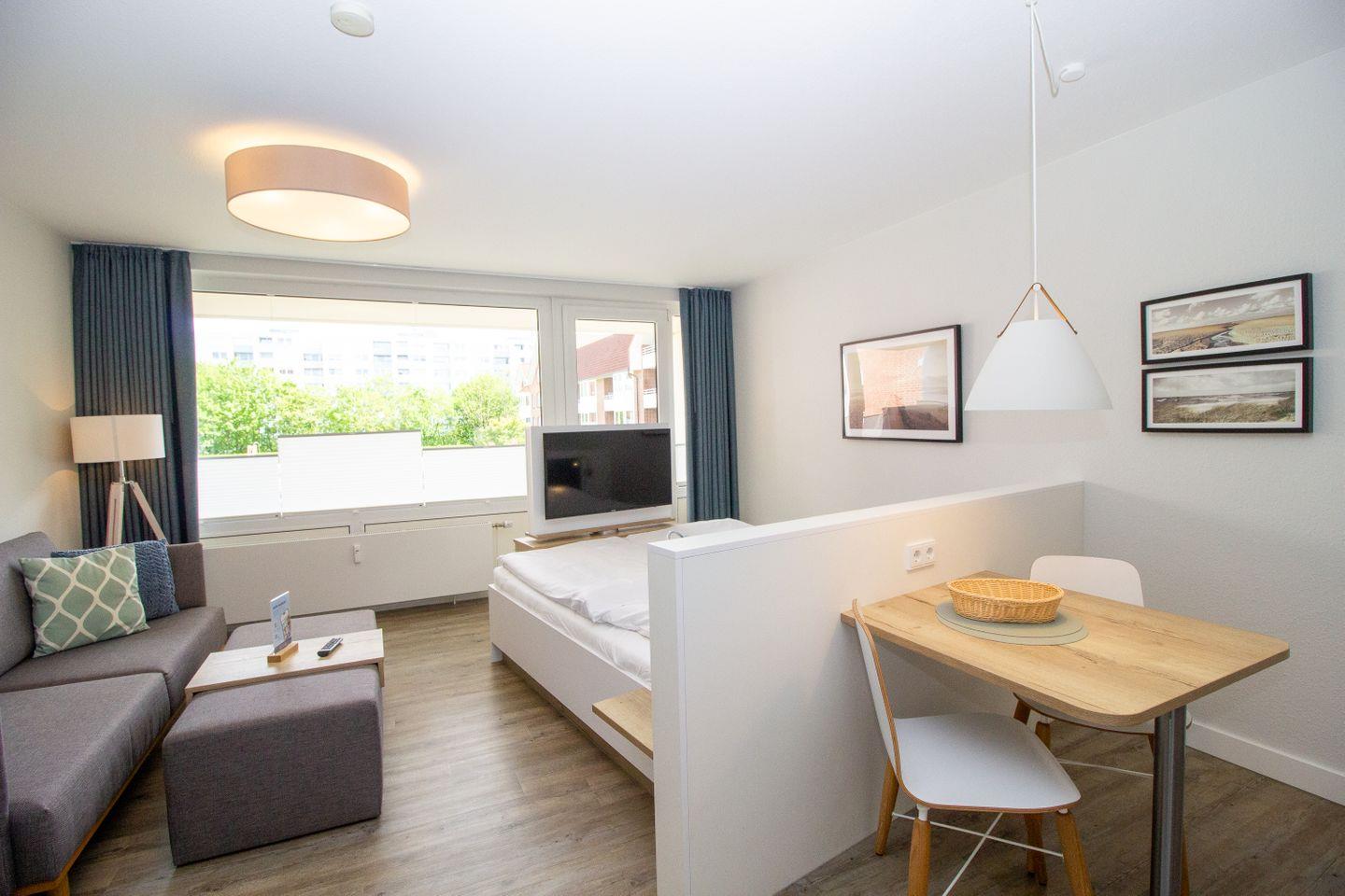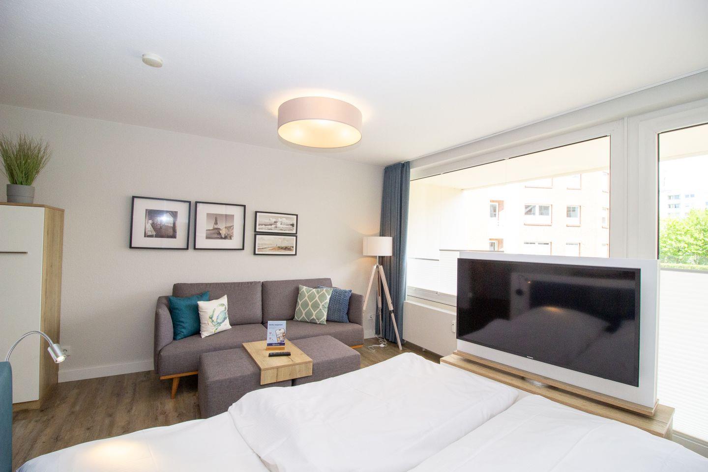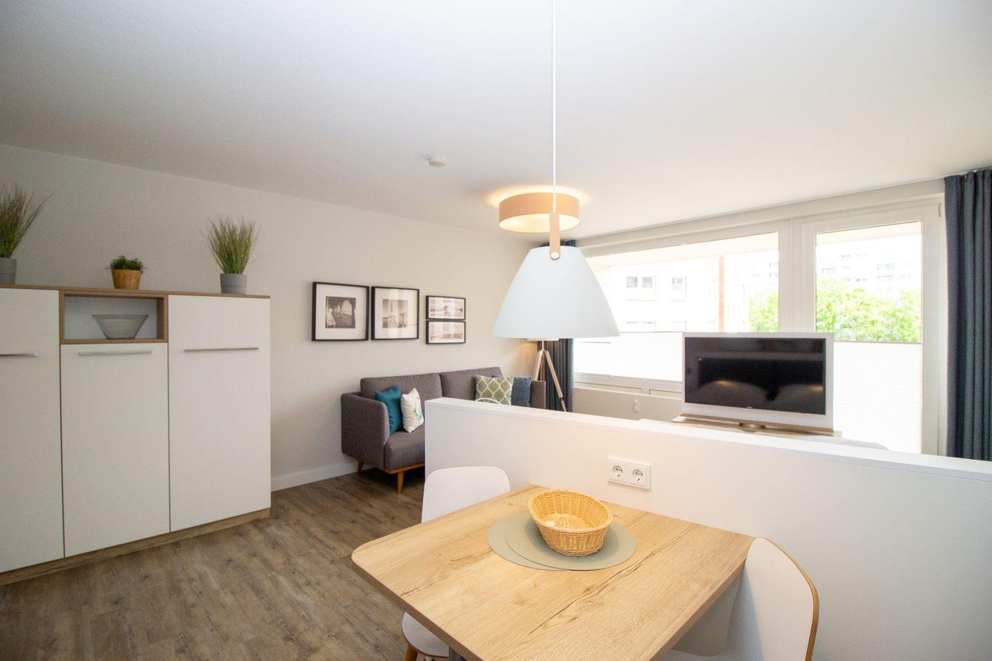 Haus "Trafalgar", Typ A-Ost, App.-Nr. 132, bis 2 Pers., 1. Etage, ca. 34 qm, Ostseite (ohne Meerblick), Wohn/Schlafbereich mit Doppelbett (2x200x80), Küchenzeile mit 2-Platten-Ceranfeld, Geschirrspüler und Mikrowellen-Backofen-Kombigerät, Dusche/WC, Balkon, Kabel-TV, kostenl. WLAN-Zugang im App., Nichtraucherwohnung, Haustiere sind nicht gestattet, Tiefgaragenstellplatz, Strandkorb im Sommer 2026, Bettwäsche und Handtücher einmalig pro Person inklusive
