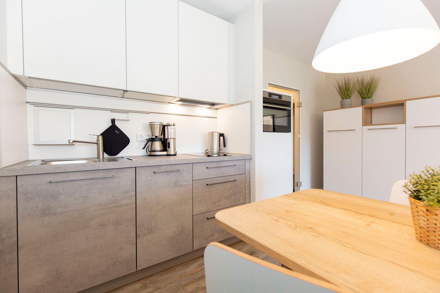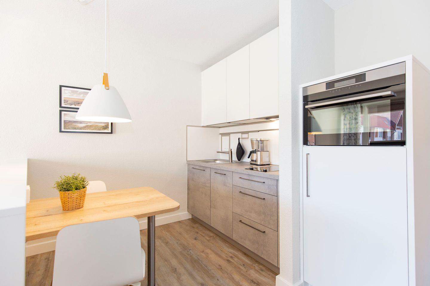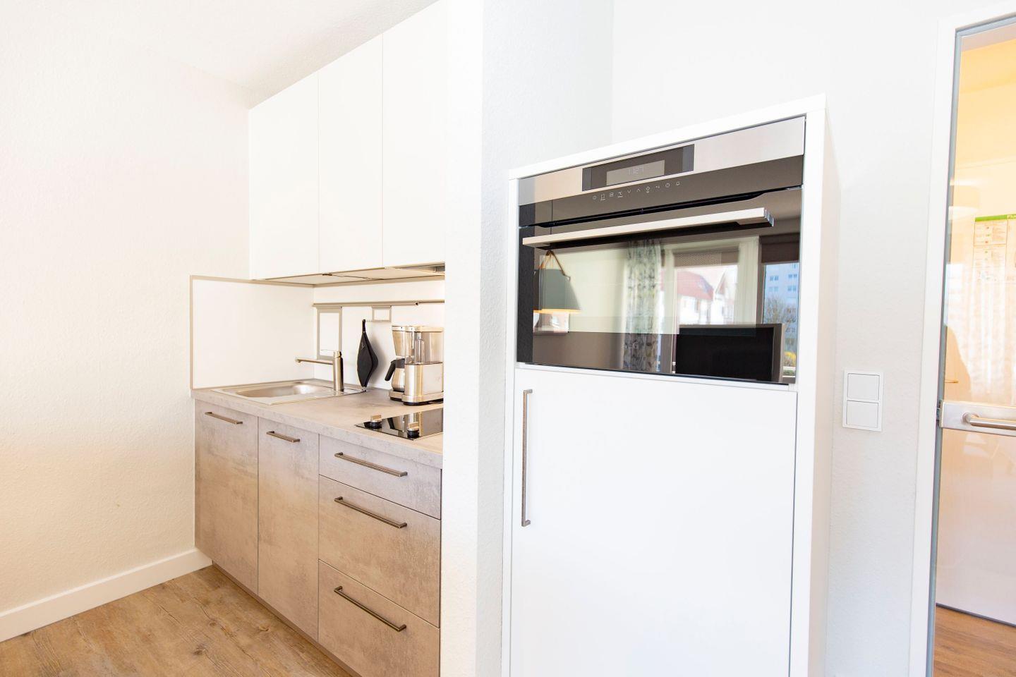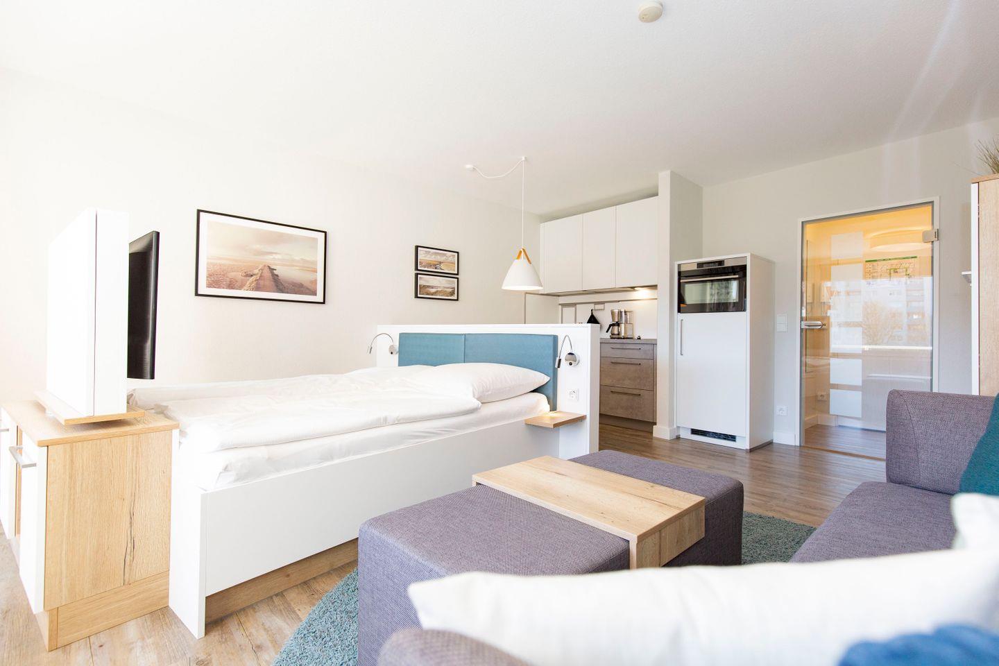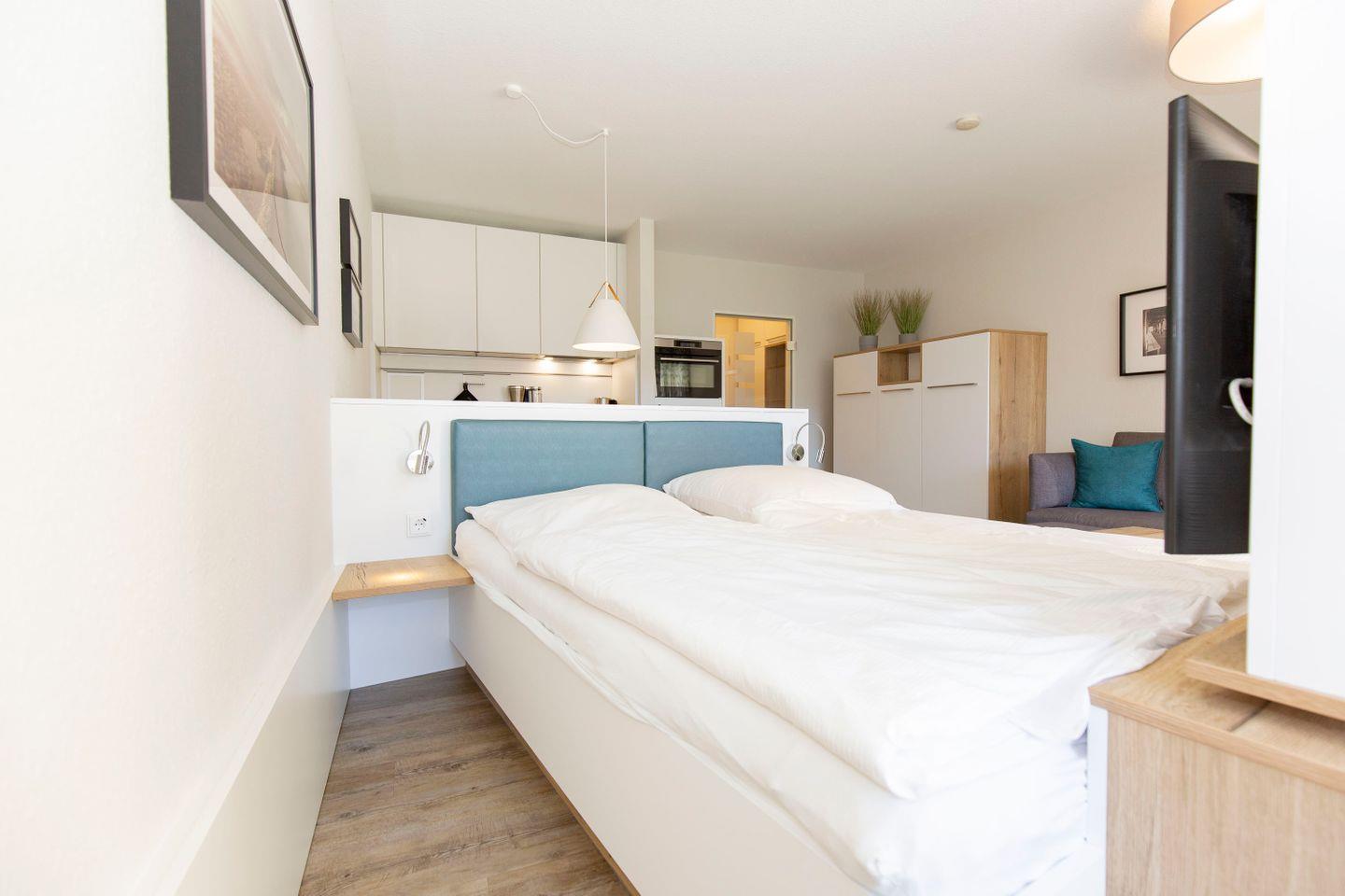 Haus "Trafalgar", Typ A-Ost, App.-Nr. 132, bis 2 Pers., 1. Etage, ca. 34 qm, Ostseite (ohne Meerblick), Wohn/Schlafbereich mit Doppelbett (2x200x80), Küchenzeile mit 2-Platten-Ceranfeld, Geschirrspüler und Mikrowellen-Backofen-Kombigerät, Dusche/WC, Balkon, Kabel-TV, kostenl. WLAN-Zugang im App., Nichtraucherwohnung, Haustiere sind nicht gestattet, Tiefgaragenstellplatz, Strandkorb im Sommer 2026, Bettwäsche und Handtücher einmalig pro Person inklusive