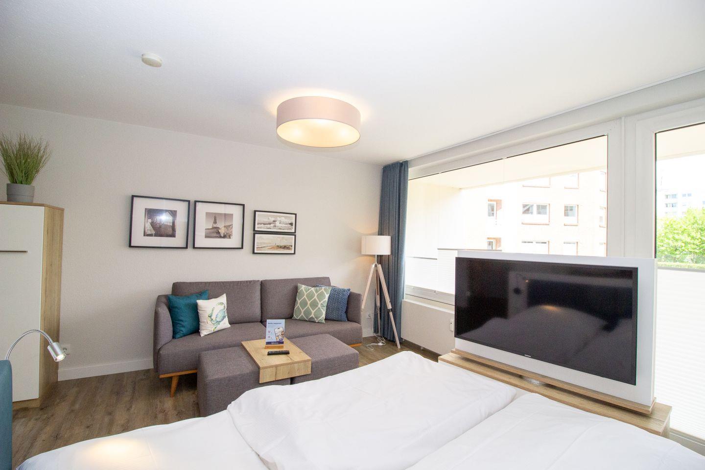 Haus "Trafalgar", Typ A-Ost, App.-Nr. 132, bis 2 Pers., 1. Etage, ca. 34 qm, Ostseite (ohne Meerblick), Wohn/Schlafbereich mit Doppelbett (2x200x80), Küchenzeile mit 2-Platten-Ceranfeld, Geschirrspüler und Mikrowellen-Backofen-Kombigerät, Dusche/WC, Balkon, Kabel-TV, kostenl. WLAN-Zugang im App., Nichtraucherwohnung, Haustiere sind nicht gestattet, Tiefgaragenstellplatz, Strandkorb im Sommer 2025, Bettwäsche und Handtücher einmalig pro Person inklusive