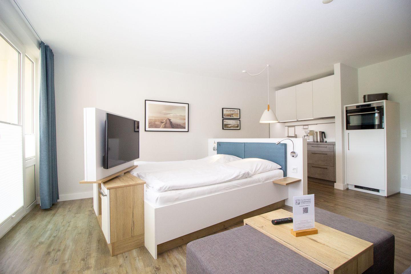 Moderne 1-Zimmer-Ferienwohnung in Cuxhaven-Döse mit Balkon, Wellnessbereich und strandnaher Lage für erholsame Urlaubstage.