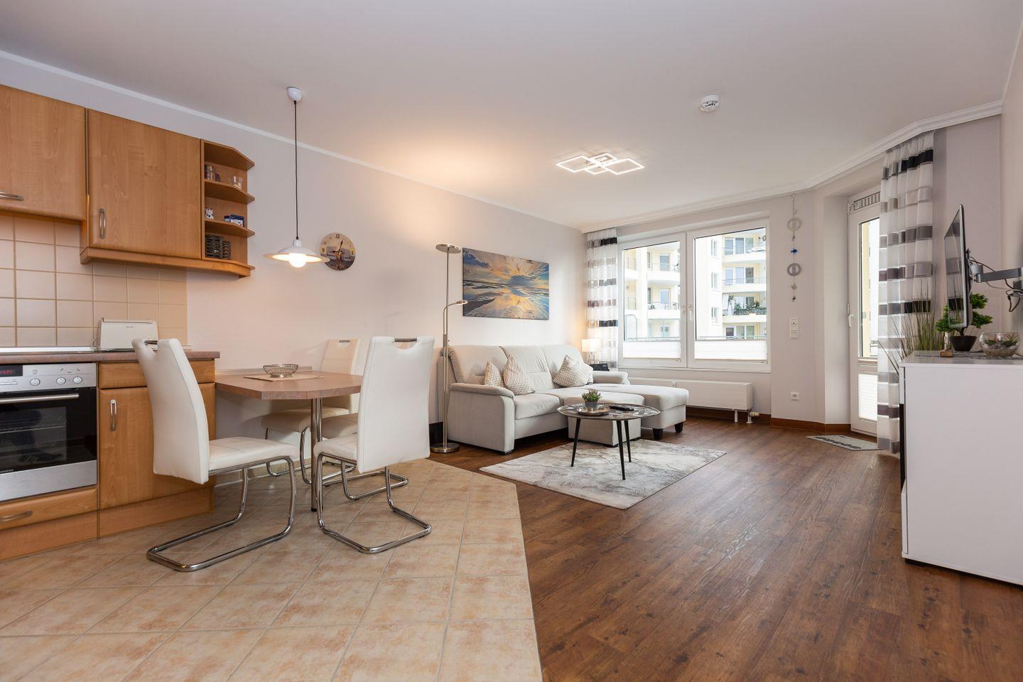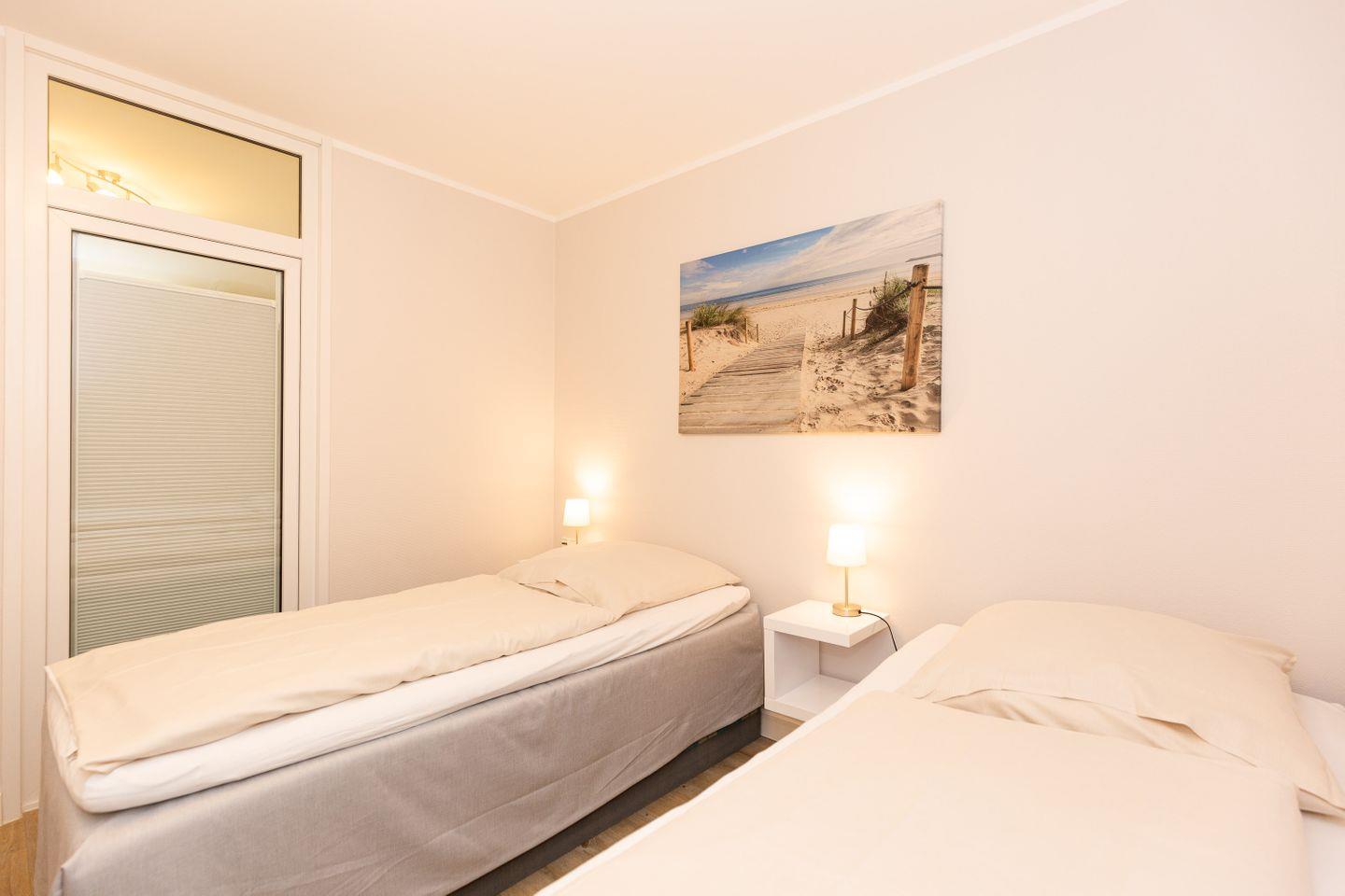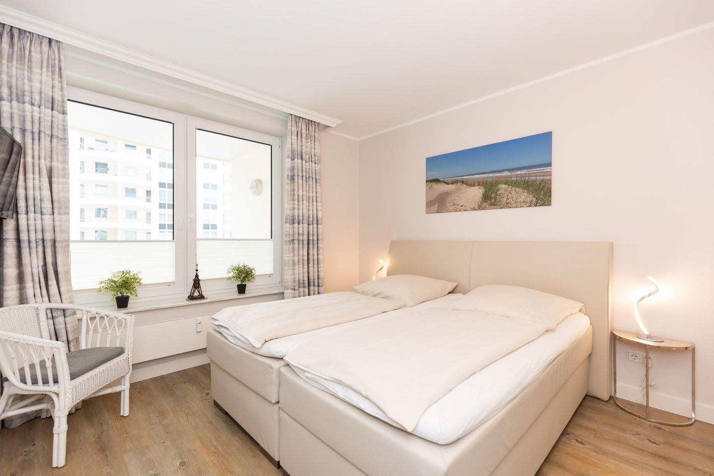 Haus "Kurpark-Residenz", Typ D2, App.-Nr. "125", bis 4 Personen, 1. OG, Ostseite ("Parkseite"), ca. 67 m² Größe, Wohnzimmer, separates Schlafzimmer mit Boxspringbett und Flachbild TV, zweites separates Schlafzimmer (innenliegend) mit zwei Boxspringbetten, Dusche/WC, Küchenzeile mit Mikrowelle, Backofen und Geschirrspüler, Balkon,