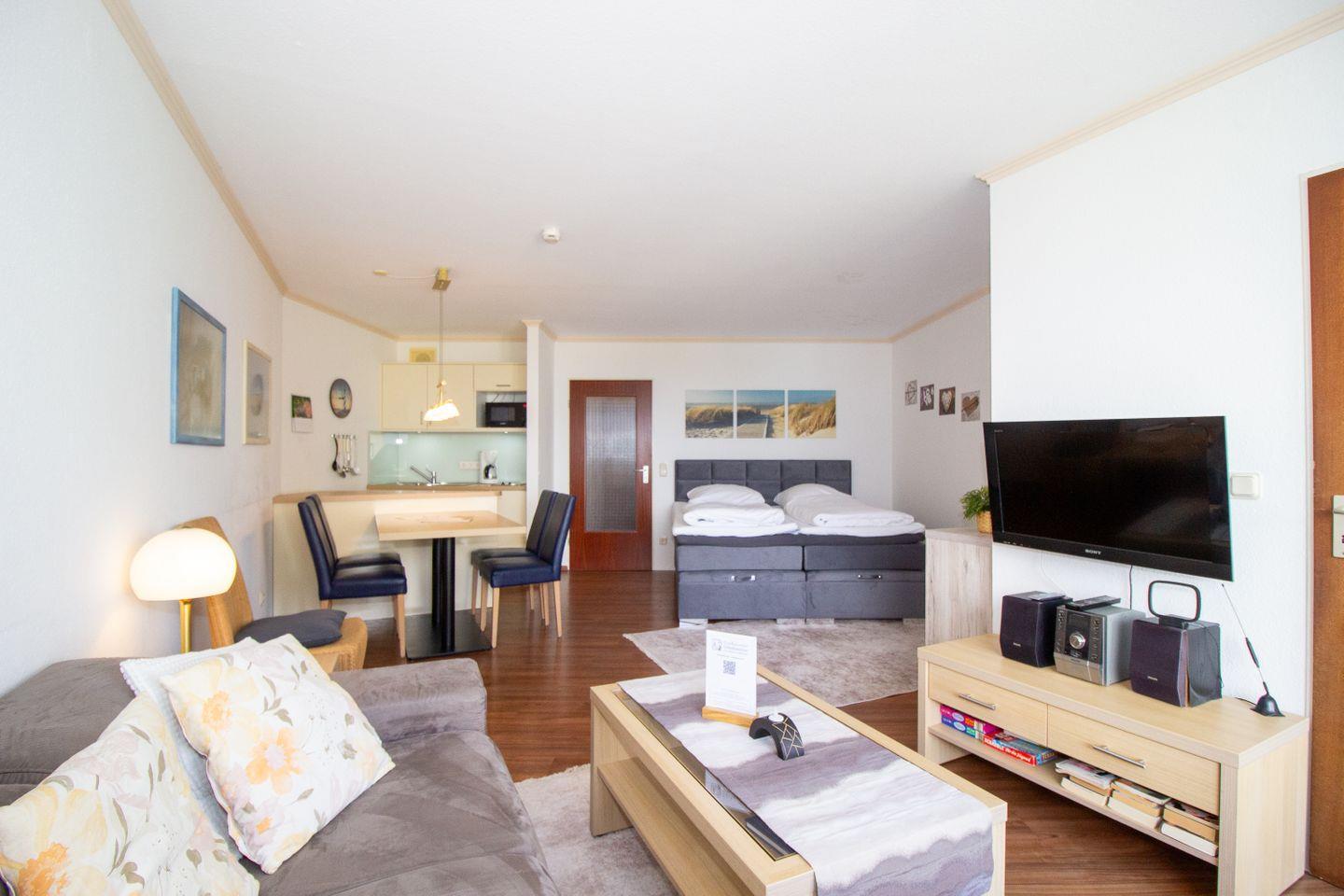 Auf 40 m² finden in der 2-Zimmer-Ferienwohnung (Hundefreundliche) bis zu vier Personen Platz. Die eher schlichte, edle Einrichtung sowie dezente Farbakzente in der Dekoration kreieren eine ruhige Atmosphäre, die zu Entspannung und Erholung einlädt. Zudem punktet die Ferienwohnung mit einem Balkon mit seitlichem Meerblick in Richtung Elbe.