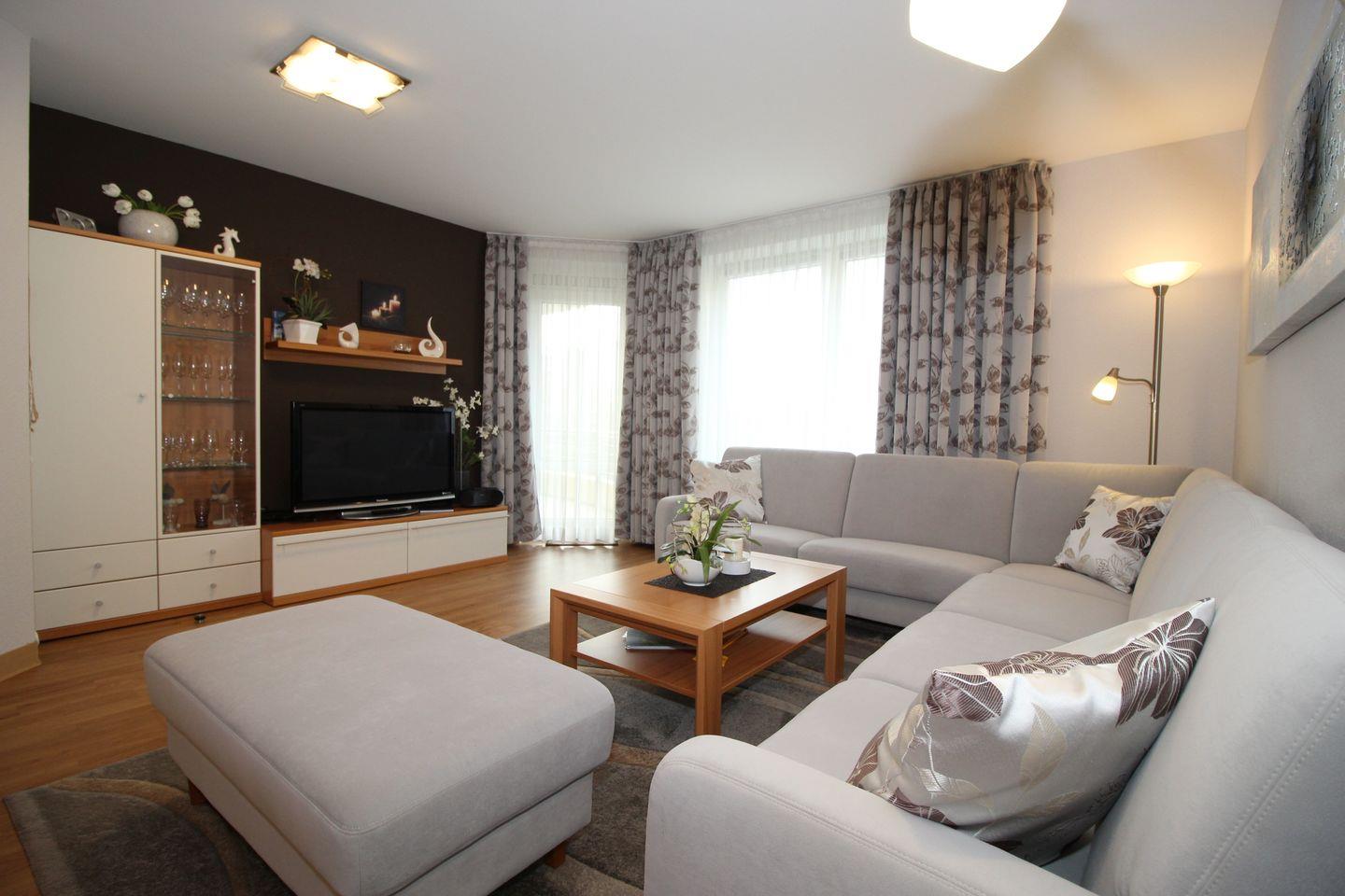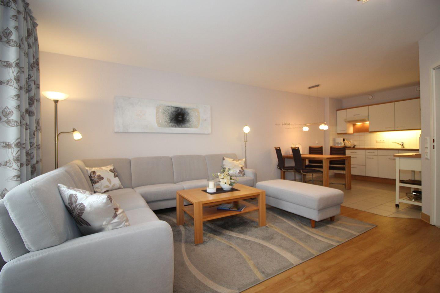 Haus "Kurpark-Residenz", Typ D2, Appartement-Nr. "132", bis 4 Personen, 1. OG, Südseite (Parkseite), ca. 68 m² Größe, Wohnzimmer, separates Schlafzimmer mit Doppelbett, sep. Kinderzimmer mit 2 Einzelbetten (innenliegend), Dusche/WC, offene Küche mit Mikrowelle und Geschirrspüler , Balkon, SAT-TV, WLAN Zugang im App., Tiefgaragenstellplatz, Nichtraucher, Haustiere sind nicht gestattet. Strandkorb im Sommer 2026.