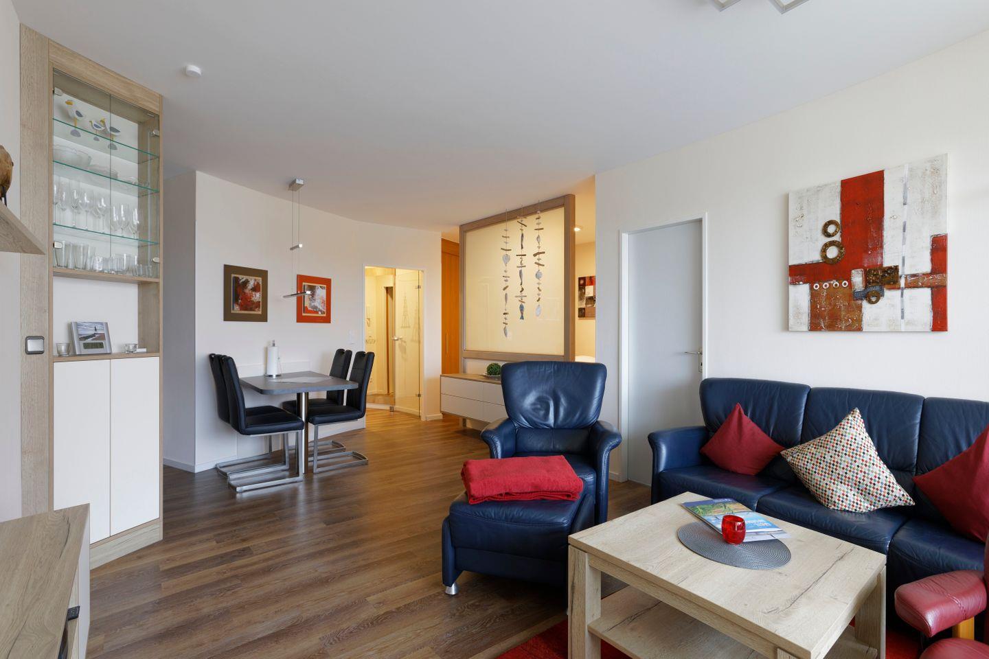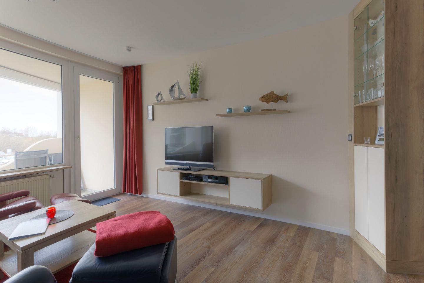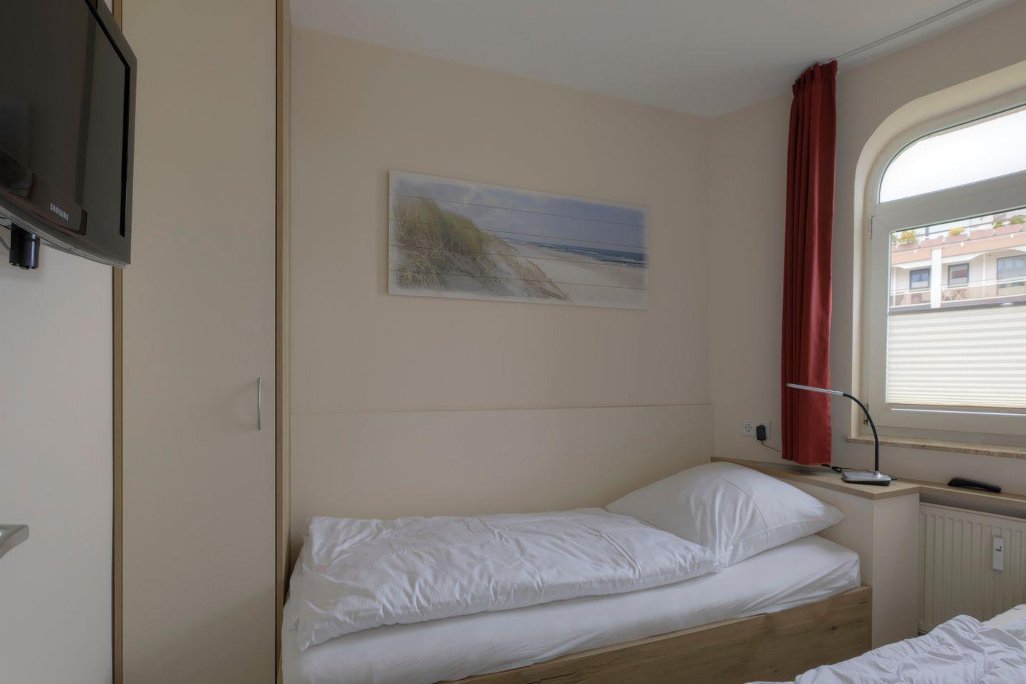 Haus "Trafalgar", Typ C, App.-Nr. 125, bis 4 Pers., 1.Etage, ca. 55 qm, Westseite (ohne Meerblick), Wohn/Schlafbereich mit Doppelbett (Raumteiler), separates Schlafzimmer mit 2 Einzelbetten und 2. TV-Gerät, Küchenzeile mit Backofen, Geschirrspüler und Mikrowelle, Dusche/WC, Balkon, Kabel-TV, W-Lan Zugang im App, CD-Player, DVD-Spieler, Tiefgaragenstellplatz, Haustiere sind nicht gestattet, Nichtraucher, Strandkorb im Sommer 2026.
