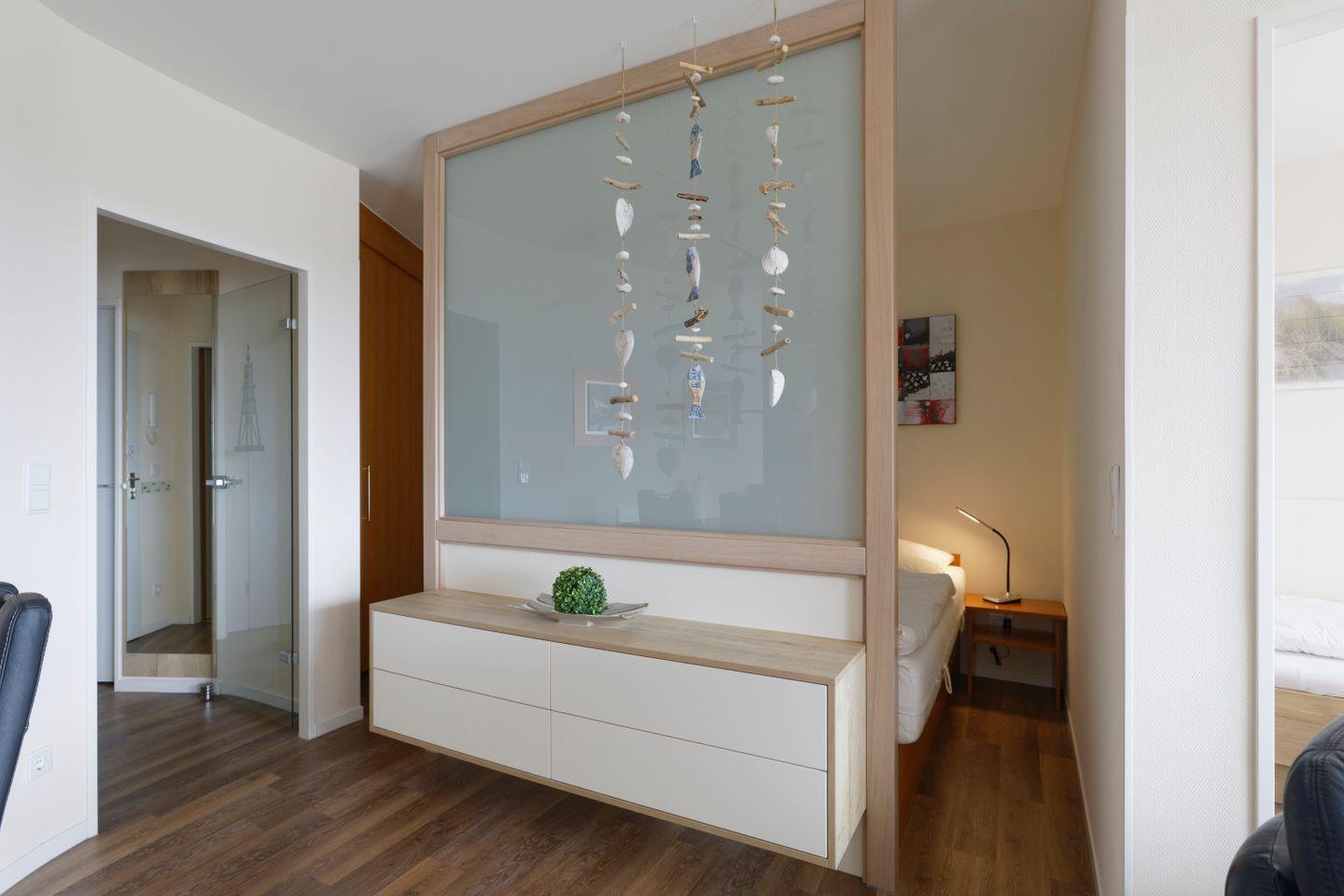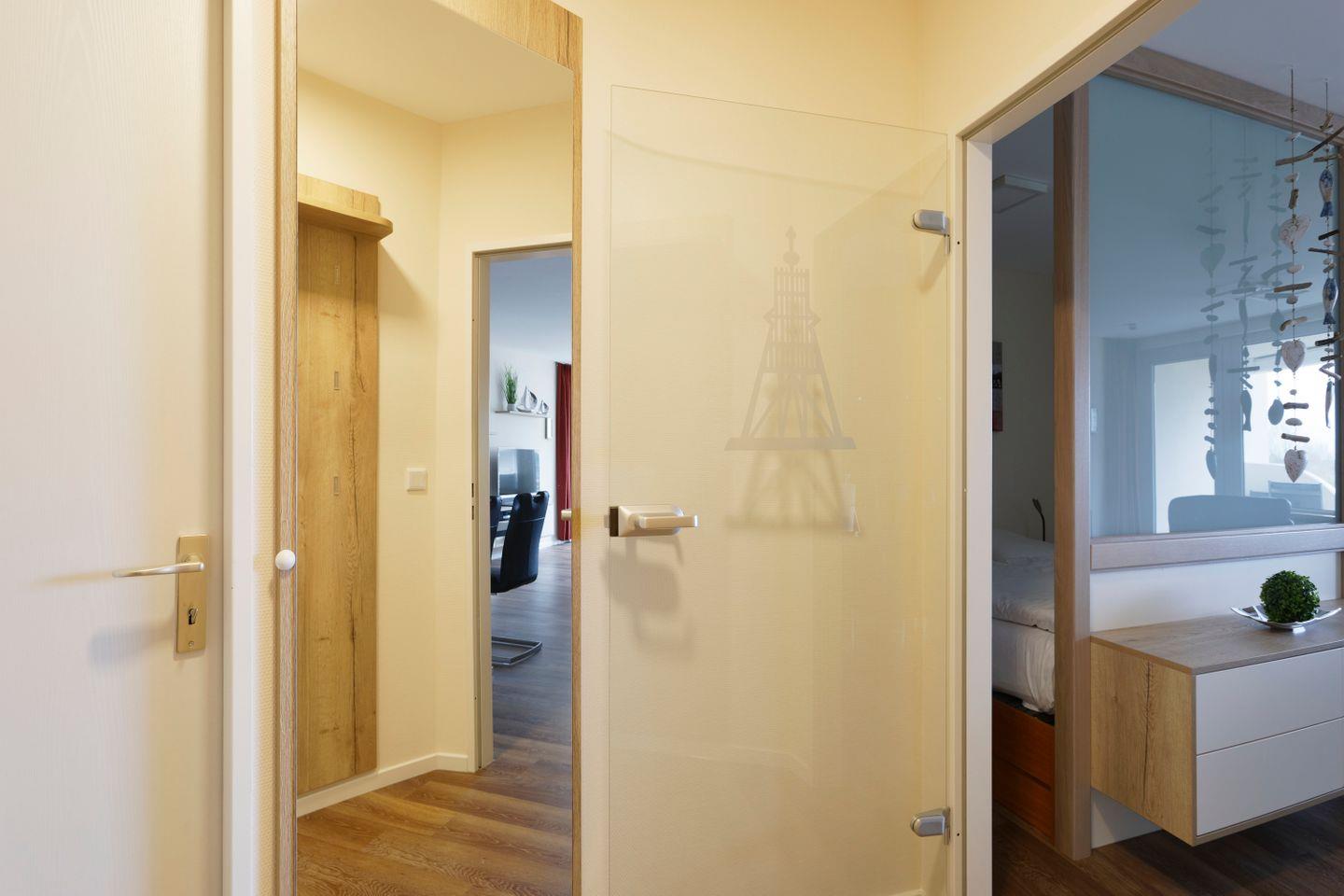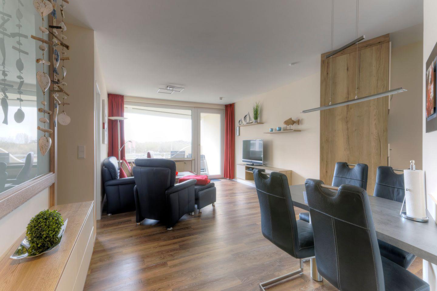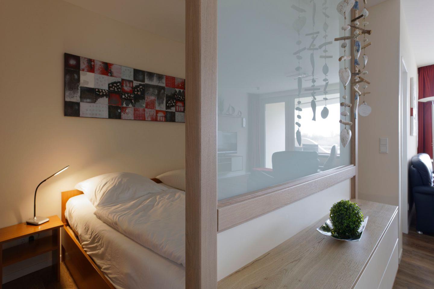 Haus "Trafalgar", Typ C, App.-Nr. 125, bis 4 Pers., 1.Etage, ca. 55 qm, Westseite (ohne Meerblick), Wohn/Schlafbereich mit Doppelbett (Raumteiler), separates Schlafzimmer mit 2 Einzelbetten und 2. TV-Gerät, Küchenzeile mit Backofen, Geschirrspüler und Mikrowelle, Dusche/WC, Balkon, Kabel-TV, W-Lan Zugang im App, CD-Player, DVD-Spieler, Tiefgaragenstellplatz, Haustiere sind nicht gestattet, Nichtraucher, Strandkorb im Sommer 2026.