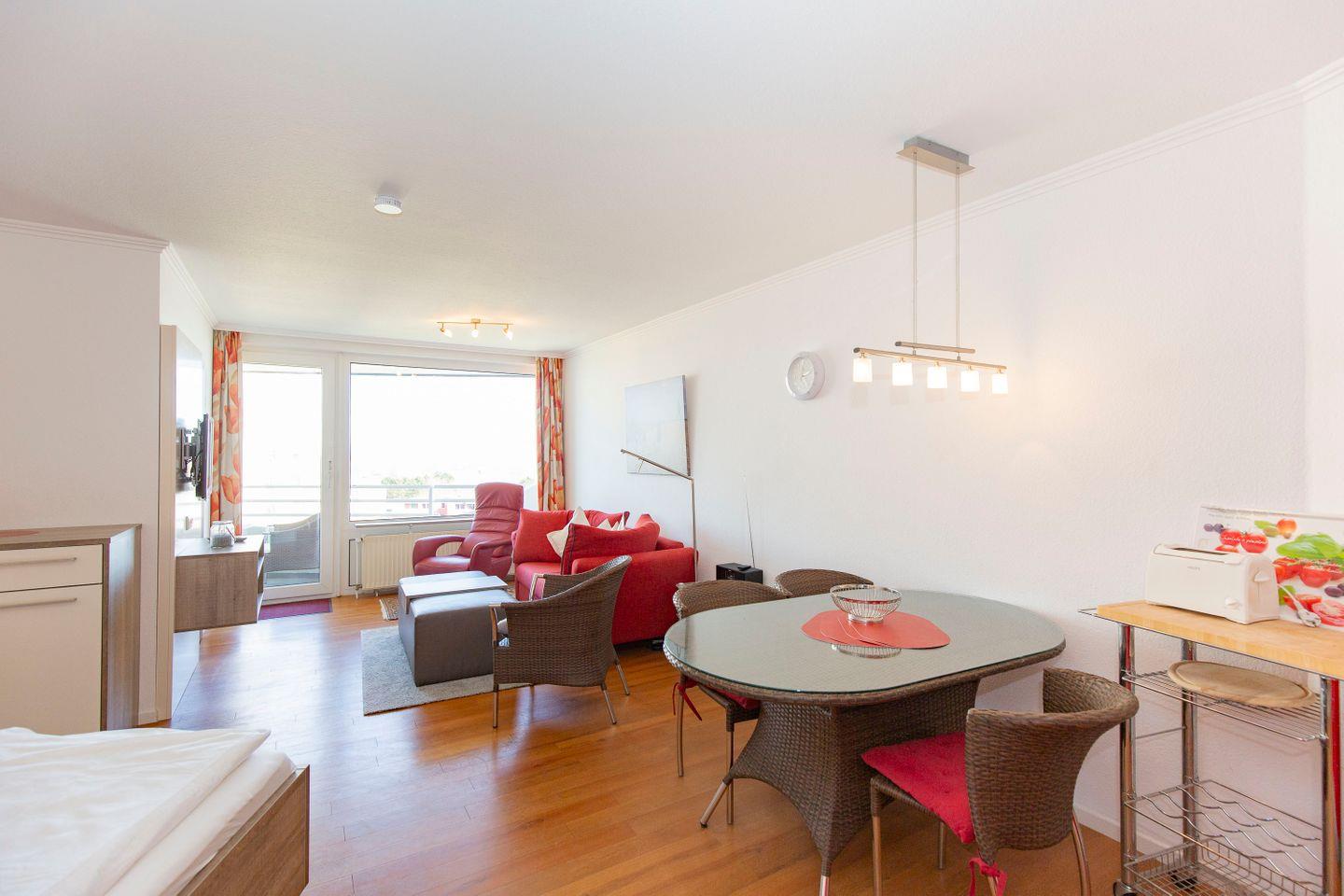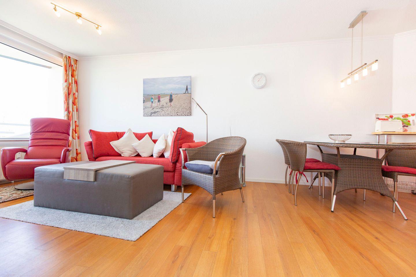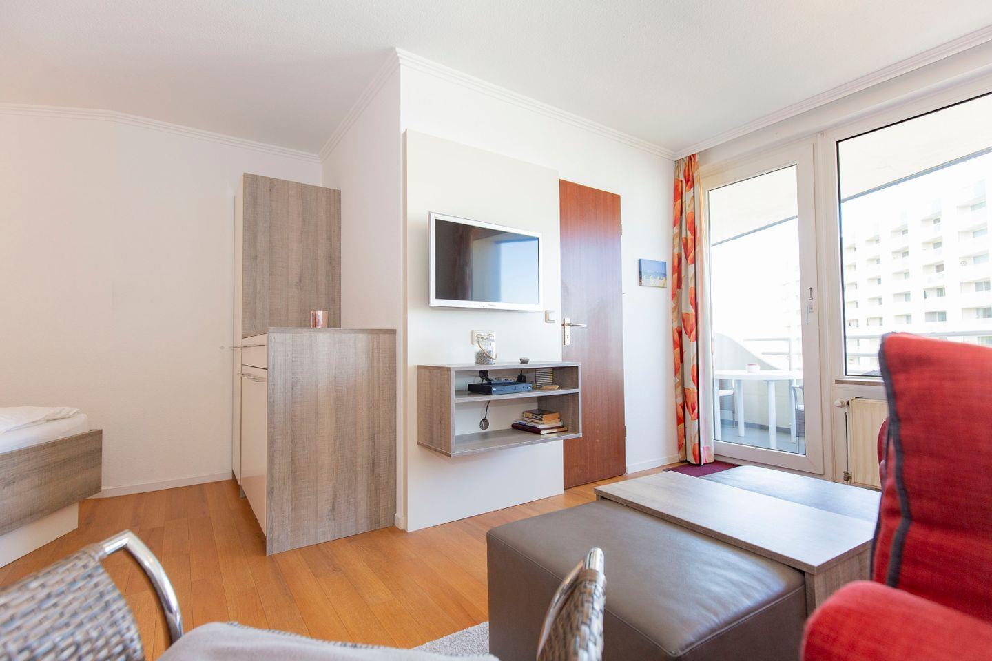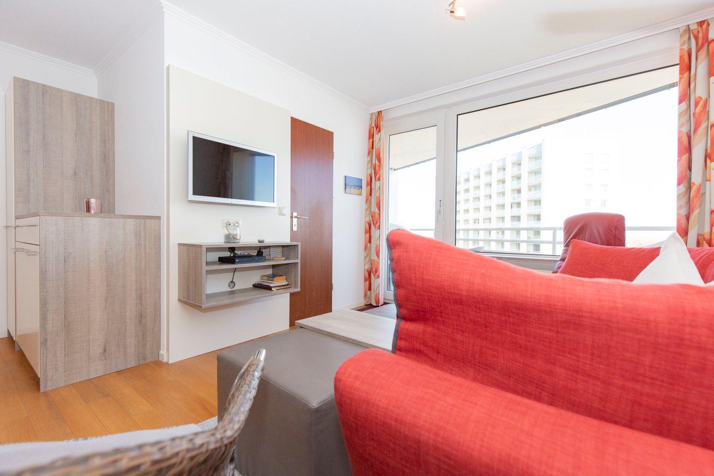 Haus "Lord Nelson", Typ 2, App.-Nr. "818", bis 4 Personen, 8. Etage, ca. 40 qm Größe, zum Weltschifffahrtsweg (seitlicher Meerblick Richtung Elbe), Wohnbereich mit feststehendem Doppelbett (1,80x2,00 m), sep. kleines Kinderzimmer mit Etagenbett, Dusche/WC, Küchenzeile mit Mikrowelle, Geschirrspüler, 4-Platten Ceranfeld, Telefon, Kabel-TV schwenkbar vom Sitzbereich/Sofa zum Bett, Blu-Ray-Player, Internet-Radio mit Bluetooth und USB, Balkon, Tiefgaragenstellplatz, Nichtraucherappartement, Haustiere nicht gestattet, kostenloser High-Speed- WLAN-Zugang im App., Strandkorb im Sommer 2026.