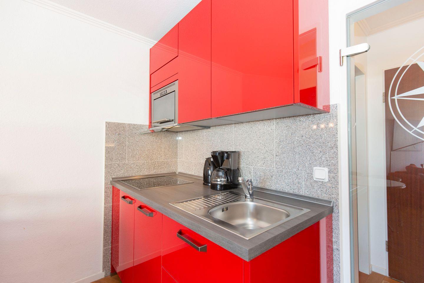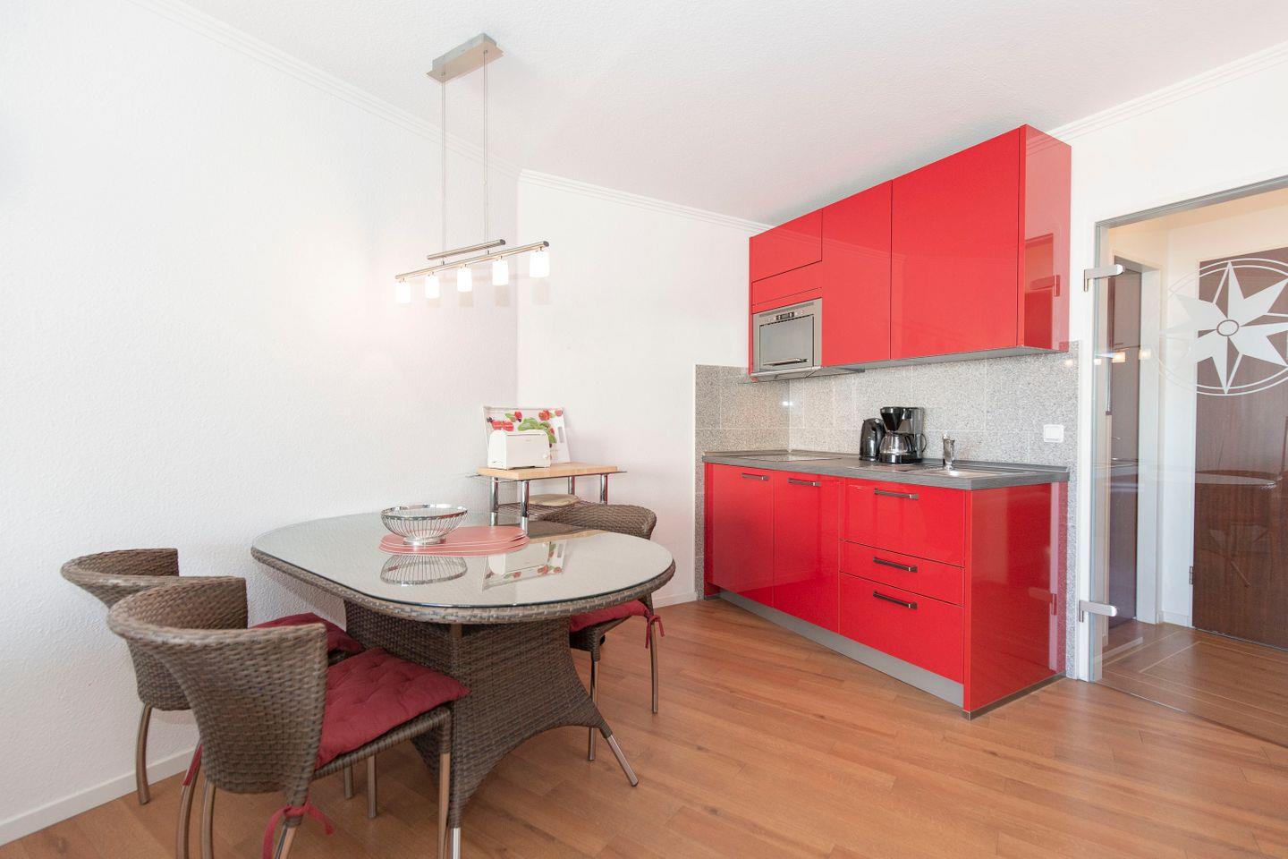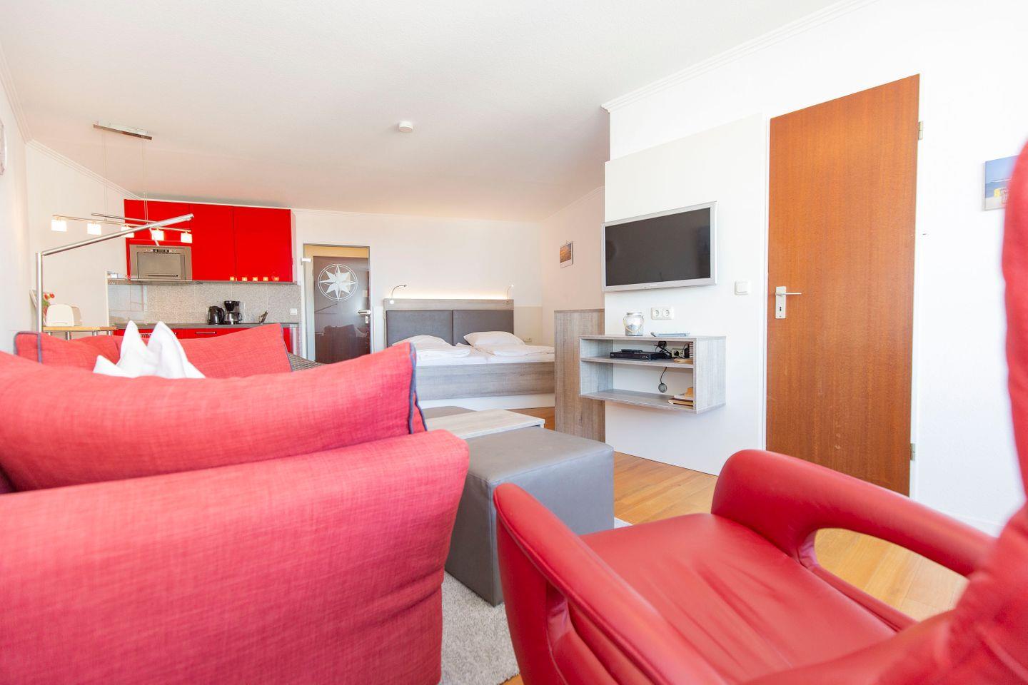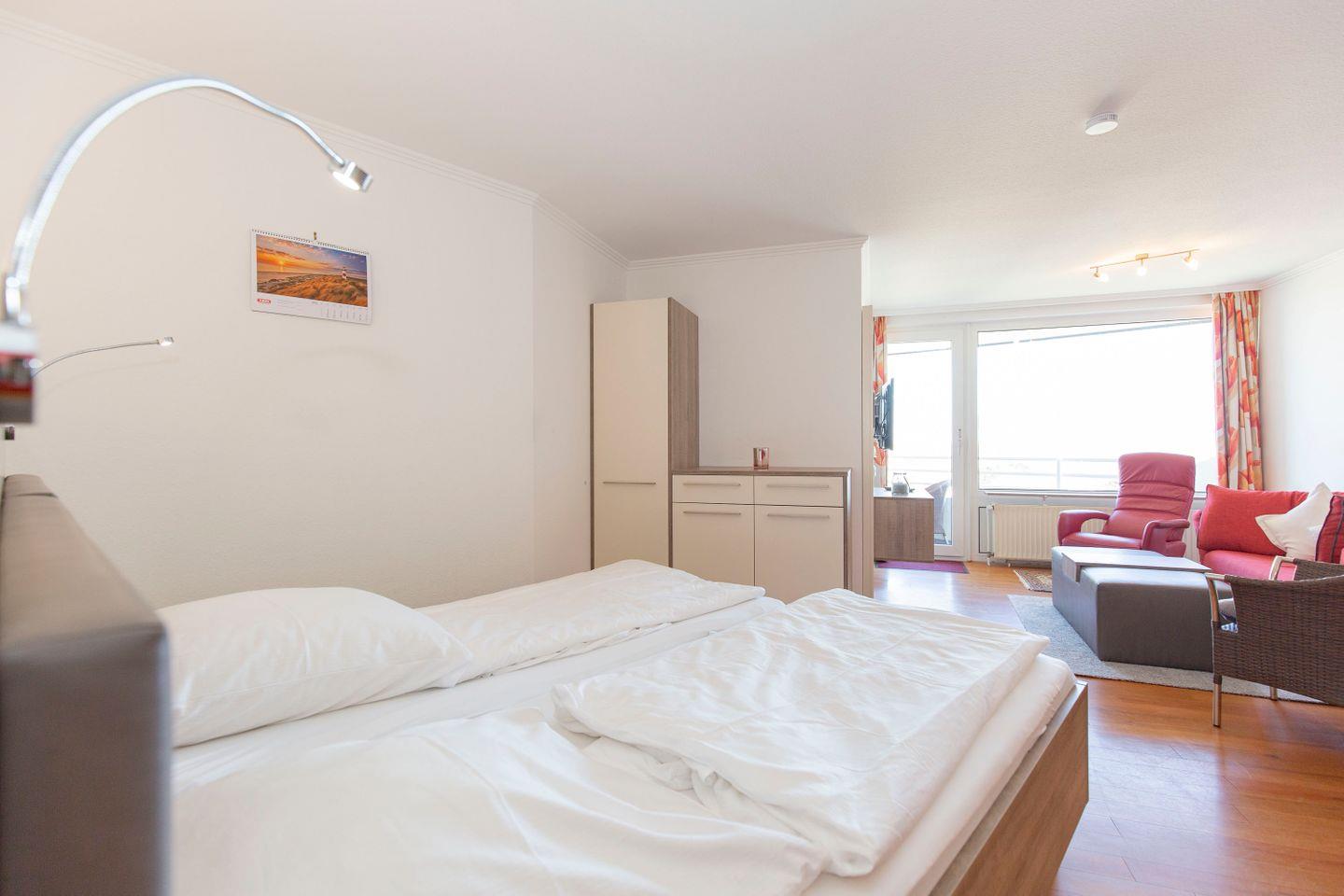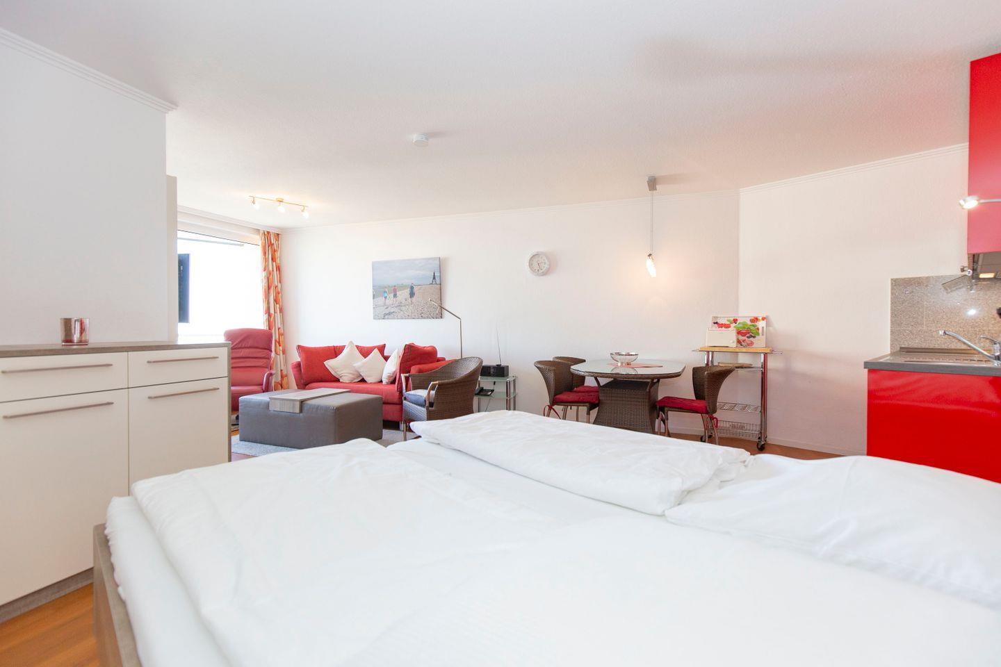 Haus "Lord Nelson", Typ 2, App.-Nr. "818", bis 4 Personen, 8. Etage, ca. 40 qm Größe, zum Weltschifffahrtsweg (seitlicher Meerblick Richtung Elbe), Wohnbereich mit feststehendem Doppelbett (1,80x2,00 m), sep. kleines Kinderzimmer mit Etagenbett, Dusche/WC, Küchenzeile mit Mikrowelle, Geschirrspüler, 4-Platten Ceranfeld, Telefon, Kabel-TV schwenkbar vom Sitzbereich/Sofa zum Bett, Blu-Ray-Player, Internet-Radio mit Bluetooth und USB, Balkon, Tiefgaragenstellplatz, Nichtraucherappartement, Haustiere nicht gestattet, kostenloser High-Speed- WLAN-Zugang im App., Strandkorb im Sommer 2026.