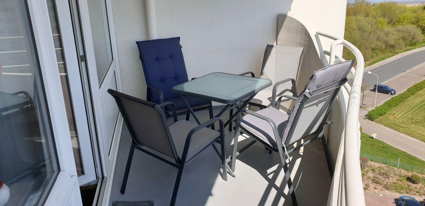 Auf dem Balkon der Ferienwohnung können Sie es sich jederzeit auf den Balkonmöbeln gemütlich machen, die frische Meeresluft einatmen und den Ausblick auf die Nordsee genießen.