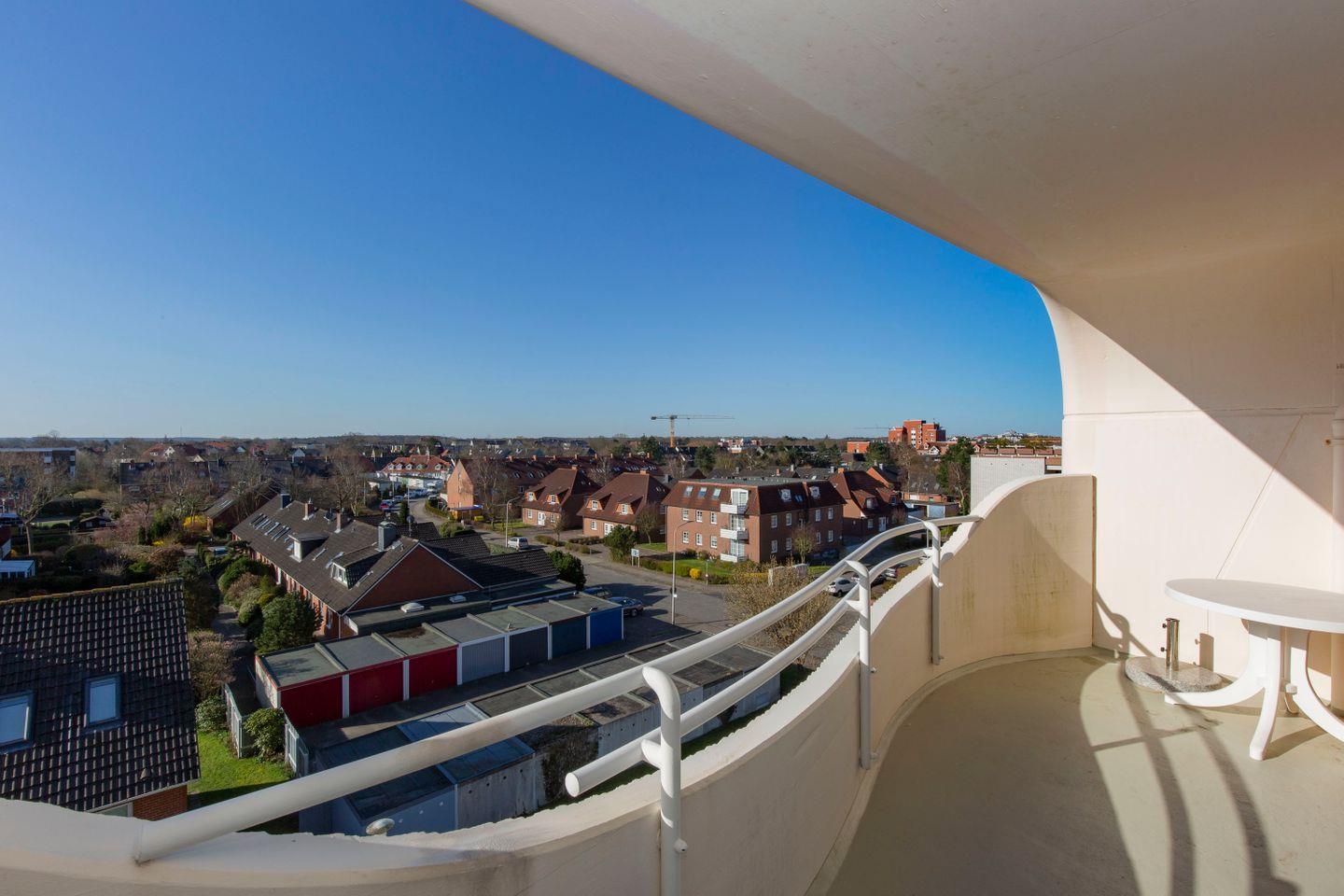 Der großzügige, windgeschützter, nicht einsehbare 10 m² Balkon der Ferienwohnung zur Südseite entzückt mit einem schönen Ausblick über die Dächer von Cuxhaven. Bei einem Frühstück unter freiem Himmel oder nach einem ereignisreichen Urlaubstag können unsere Gäste hier die frische Nordseeluft in Ruhe genießen.