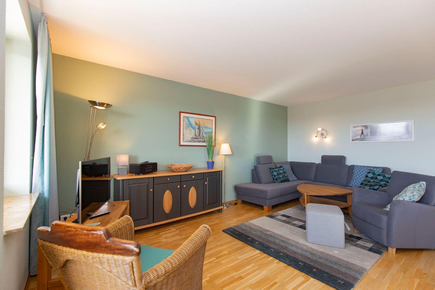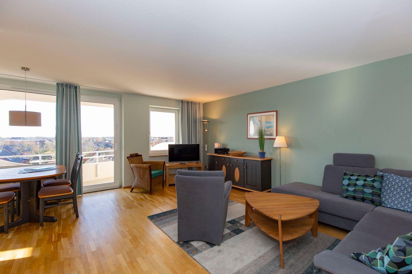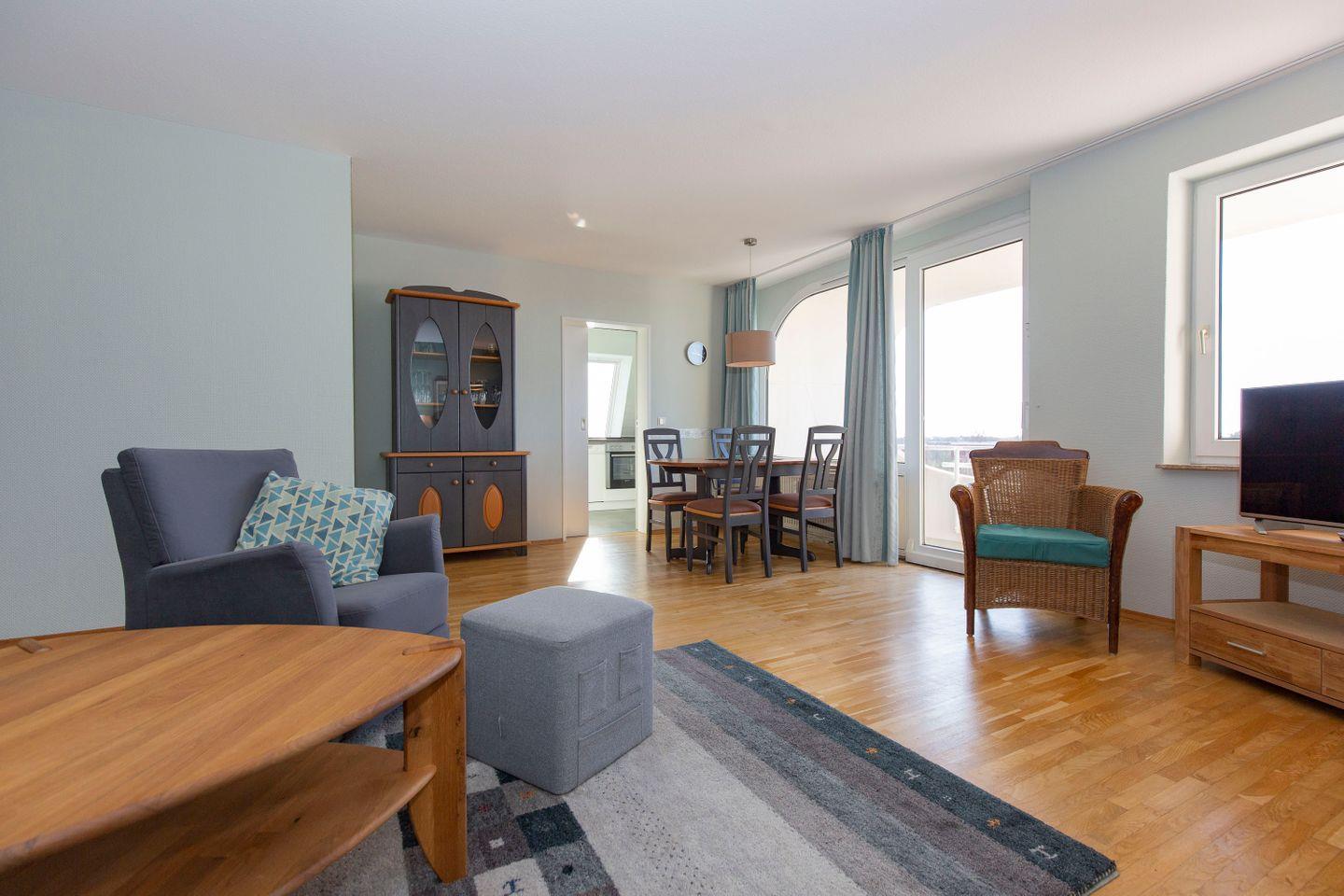 Haus "Trafalgar", Typ D, App.-Nr. 428, bis 4 Pers., 4. Etage, ca.70qm, Balkon Südseite mit Blick über Cuxhaven (ohne Meerblick), großzügiges Wohnzimmer mit Echtholzfußboden, 1. Schlafzimmer mit Doppelbett, 2. Schlafzimmer mit zwei Einzelbetten, Hart-PVC Design-Planken in beiden Schlafzimmern, sep. Küche mit Ceranfeld, Geschirrspüler, Backofen & Mikrowelle, Dusche/WC, Kabel-TV, W-Lan im App., breiter Tiefgaragenstellplatz, Nichtraucherwohnung, Haustiere sind nicht gestattet, Strandkorb im Sommer 2026.