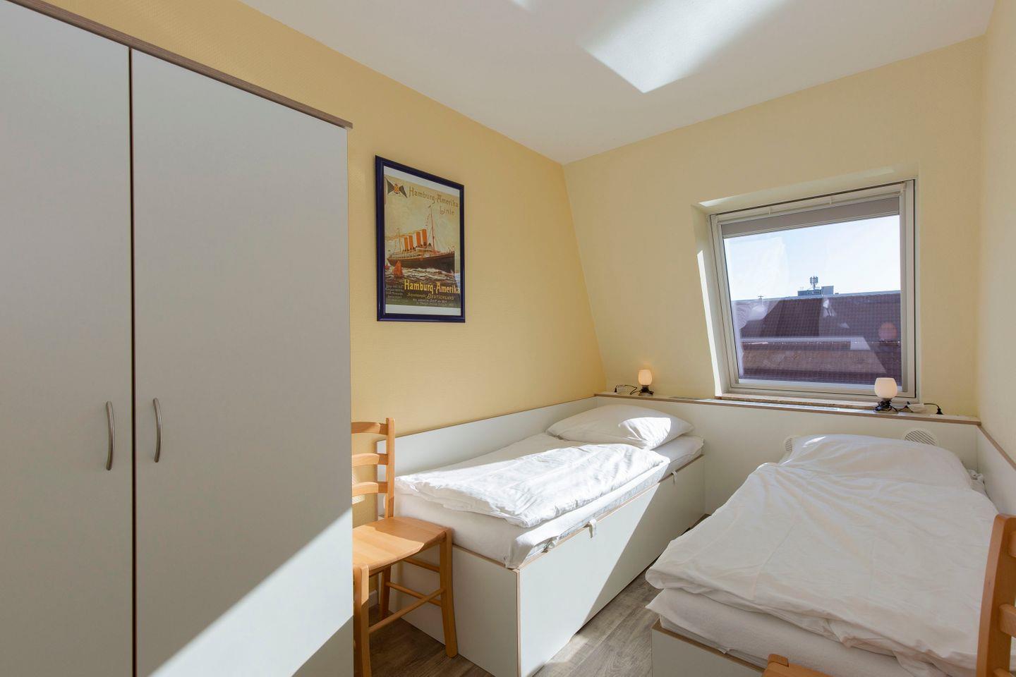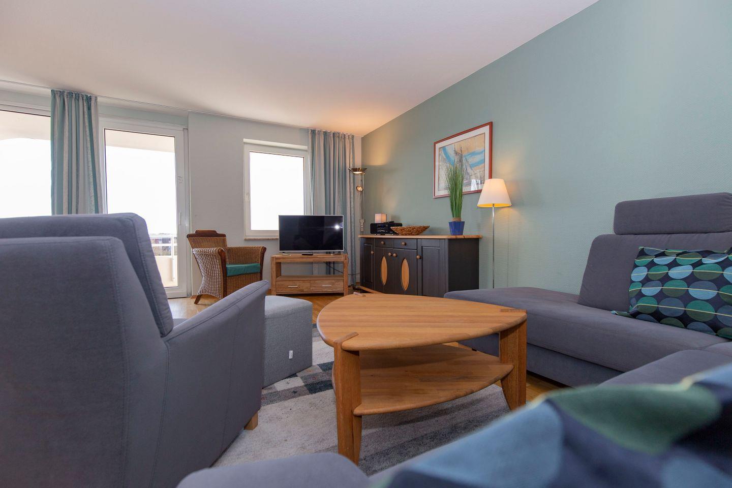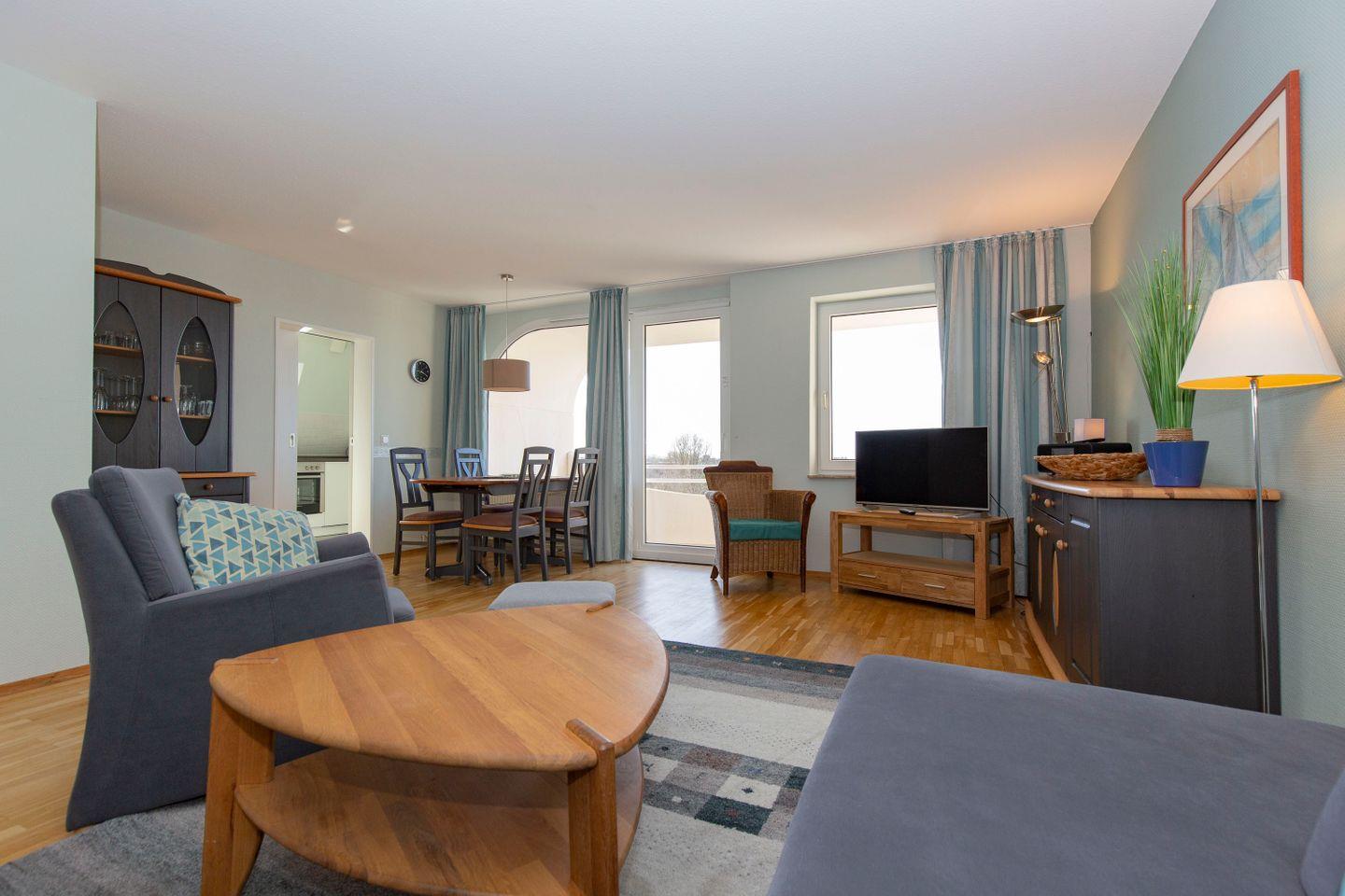 Haus "Trafalgar", Typ D, App.-Nr. 428, bis 4 Pers., 4. Etage, ca.70qm, Balkon Südseite mit Blick über Cuxhaven (ohne Meerblick), großzügiges Wohnzimmer mit Echtholzfußboden, 1. Schlafzimmer mit Doppelbett, 2. Schlafzimmer mit zwei Einzelbetten, Hart-PVC Design-Planken in beiden Schlafzimmern, sep. Küche mit Ceranfeld, Geschirrspüler, Backofen & Mikrowelle, Dusche/WC, Kabel-TV, W-Lan im App., breiter Tiefgaragenstellplatz, Nichtraucherwohnung, Haustiere sind nicht gestattet, Strandkorb im Sommer 2026.