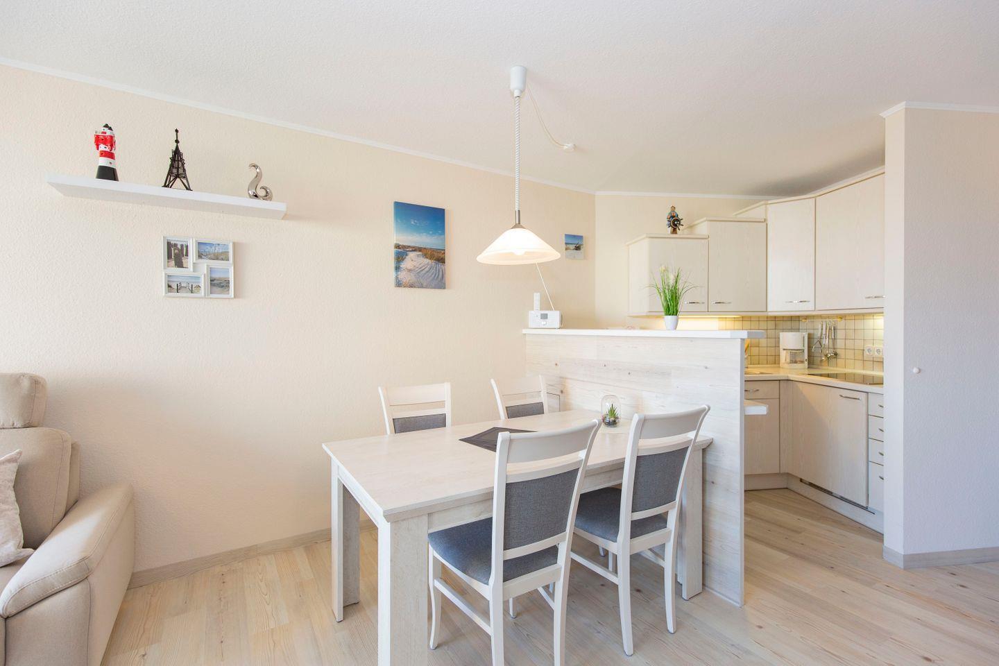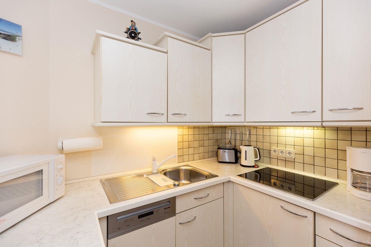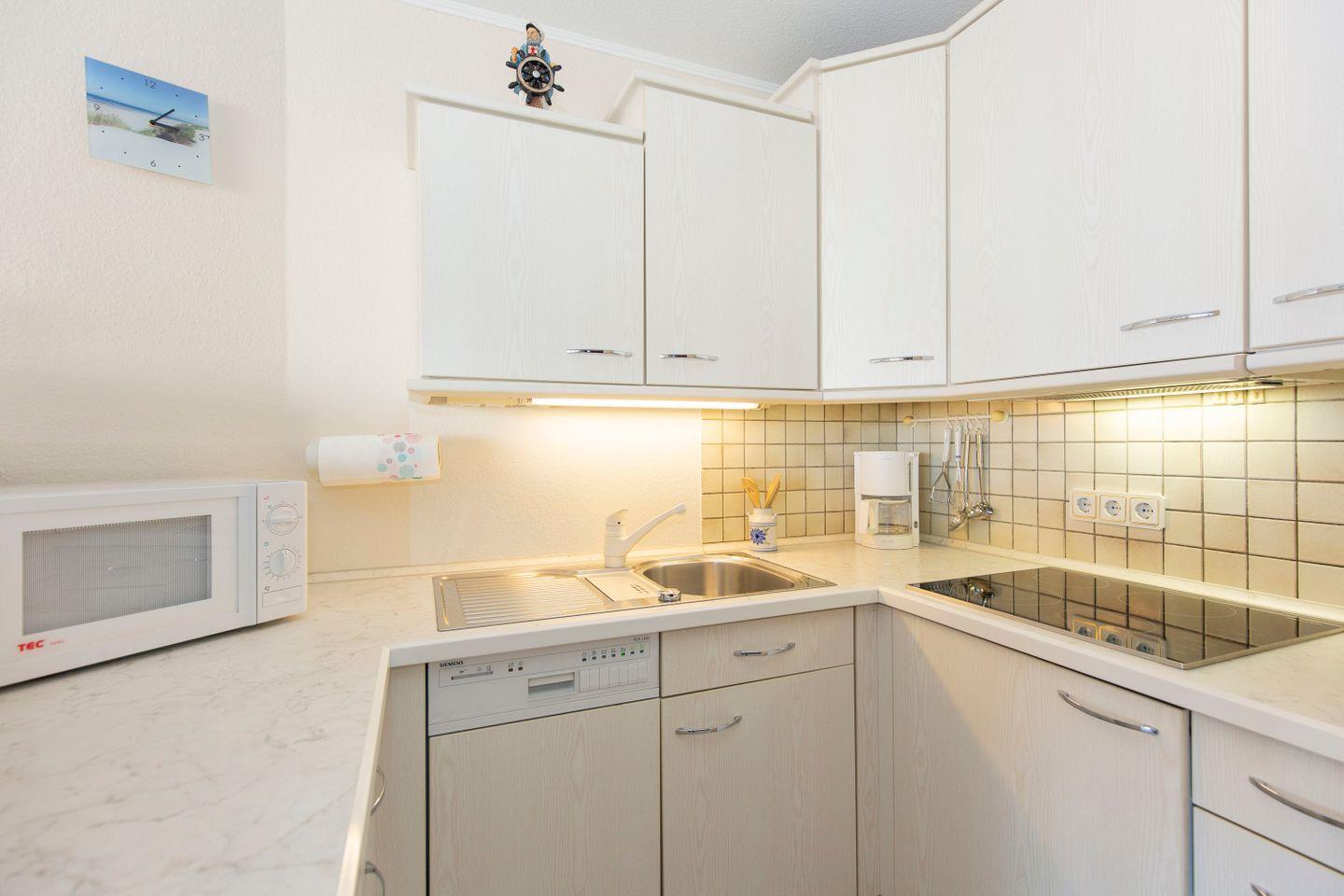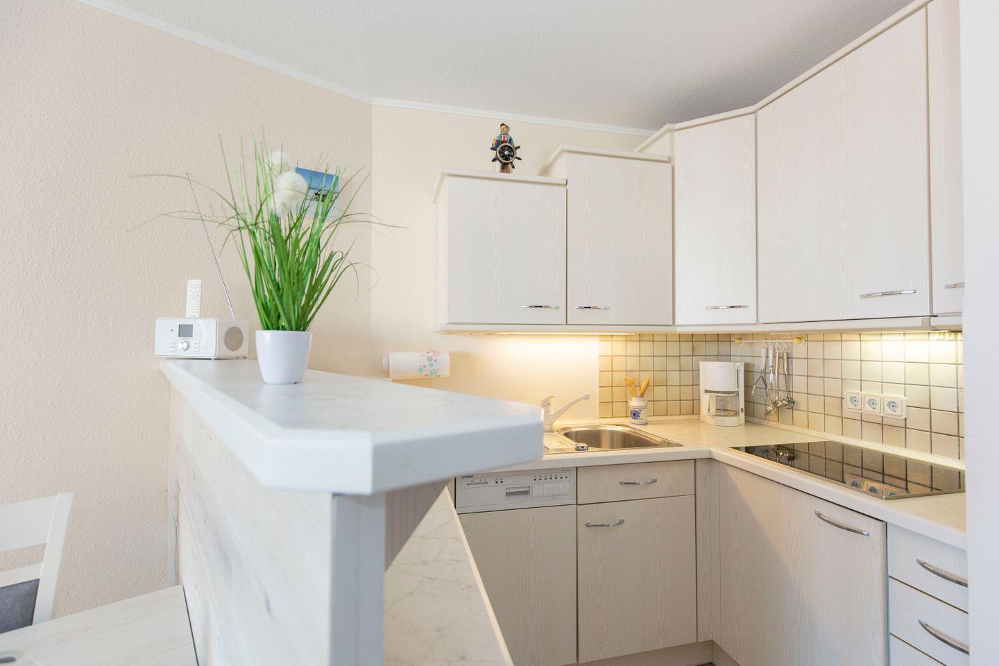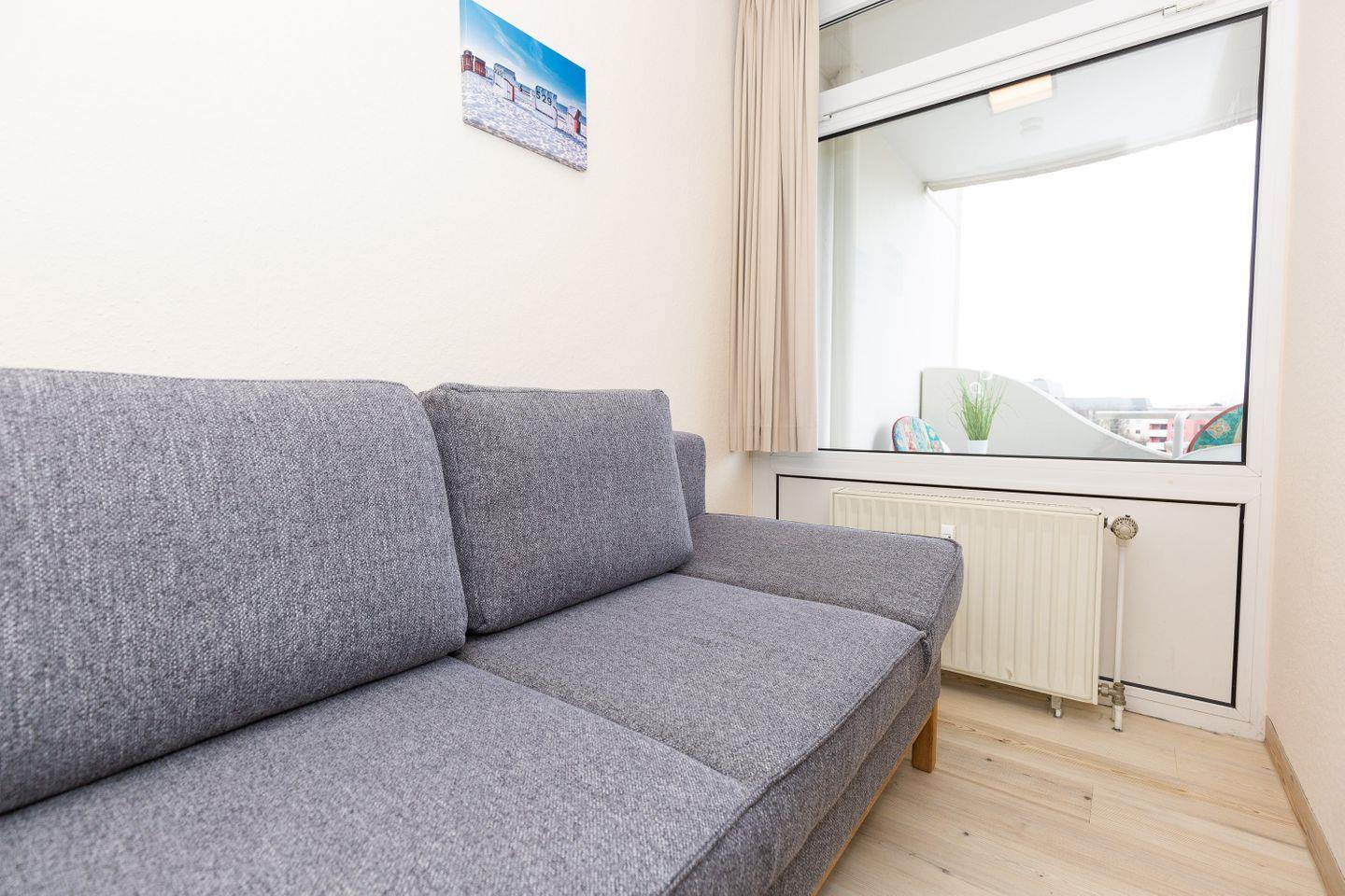 Haus "Lord Nelson", Typ 2, App.-Nr. "314", bis 4 Personen, ca. 40 m² Wohnungsgröße, 3. Etage, Ostseite (seitlicher Meerblick Richtung Weltschifffahrtsweg Elbe), Wohnbereich mit Boxspringbett (180x200, durchgehende Matratze), separates kleines Kinderzimmer mit Schlafcouch, Dusche/WC, Küchenzeile mit Geschirrspüler und 4-Platten-Ceranfeld, Balkon, Kabel-TV, WLAN, Haustiere sind nicht gestattet, Nichtraucherwohnung, Tiefgaragenstellplatz, Strandkorb im Sommer 2025
