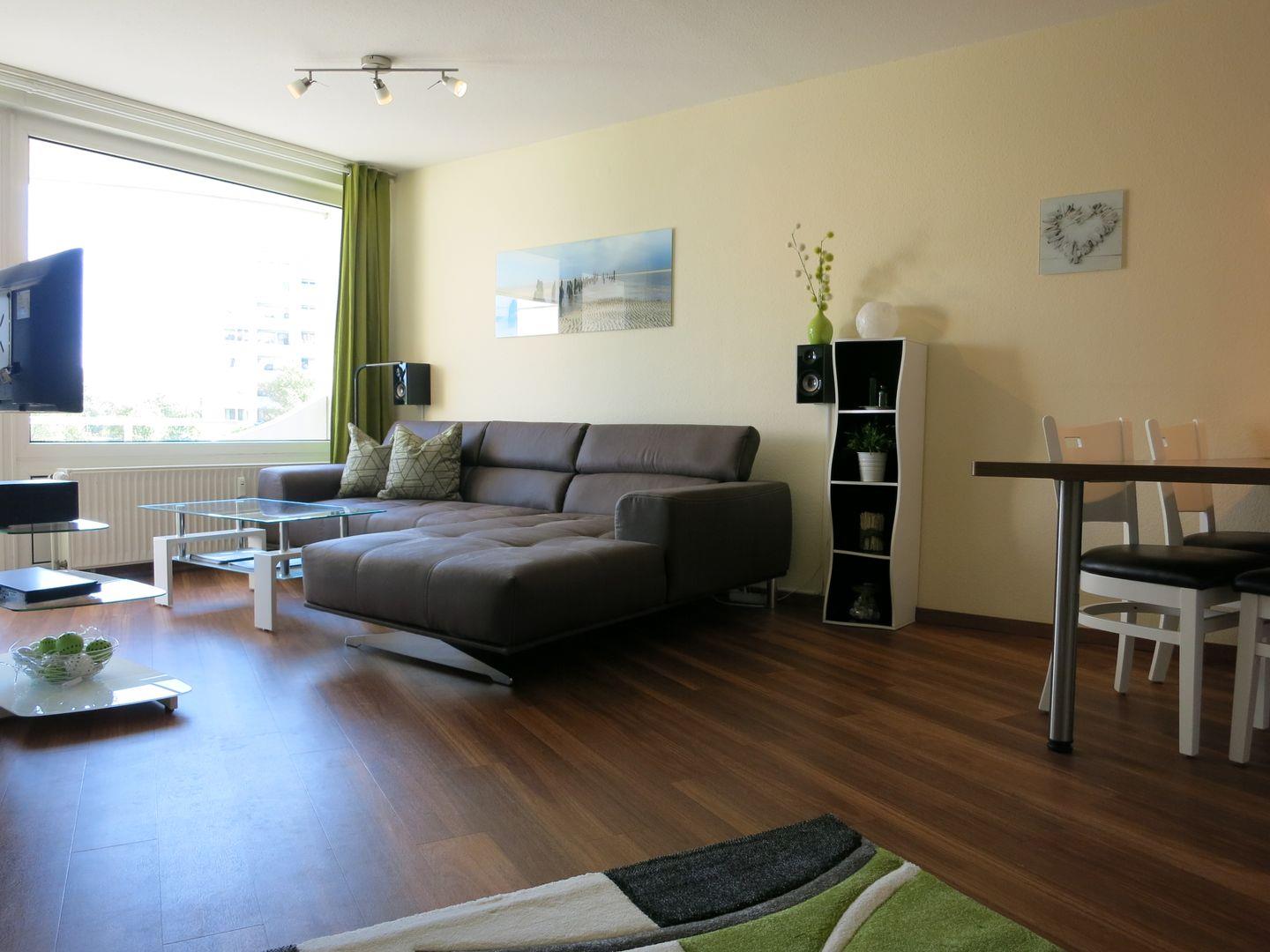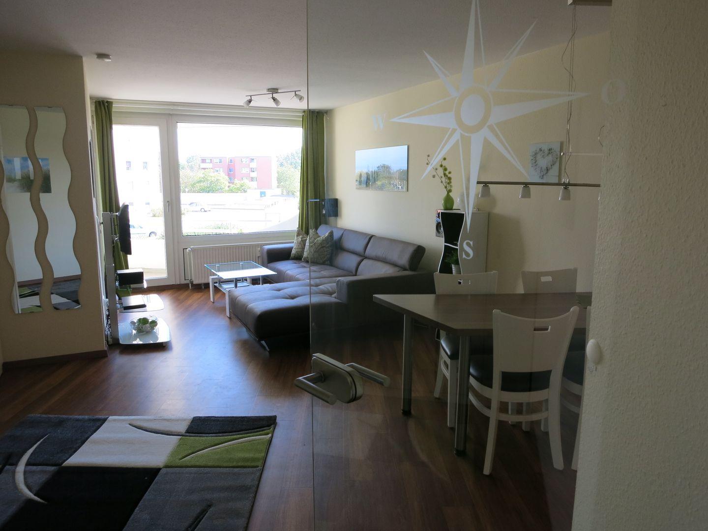 Modern eingerichtete Ferienwohnung in Cuxhaven-Döse, strandnah mit Schwimmbad, Sauna und Balkon.