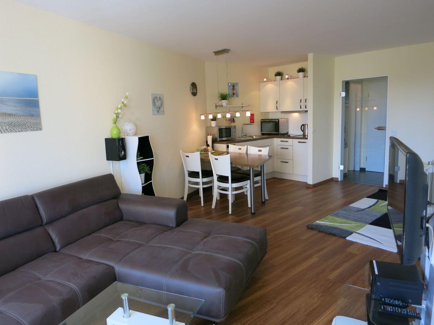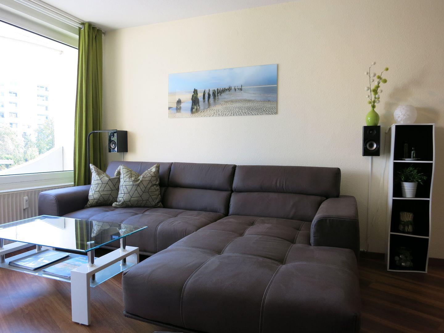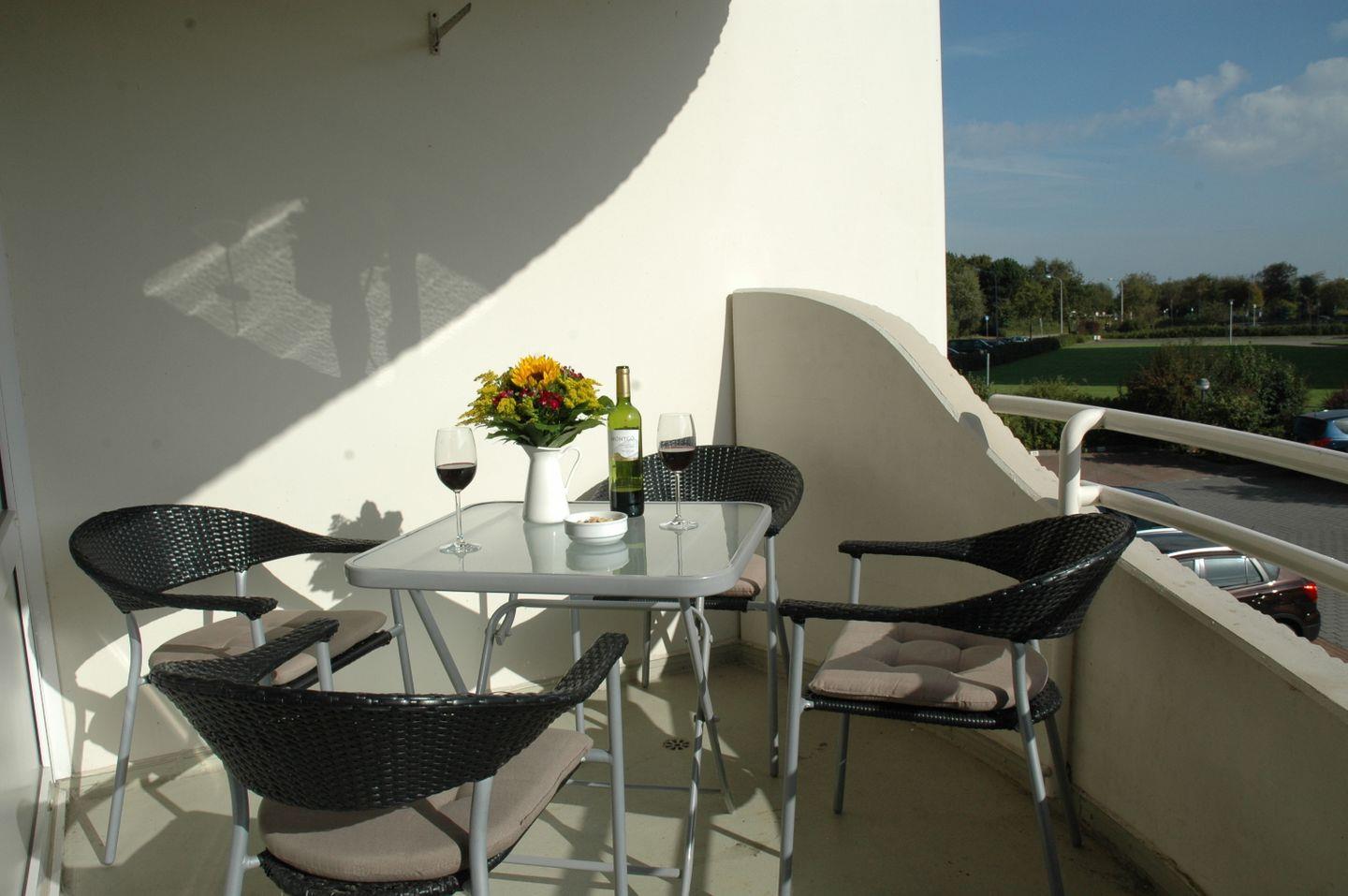 Über den Wohnbereich gelangen Sie auf den Balkon der Ferienwohnung. Hier können Sie jederzeit die frische Nordseeluft genießen.