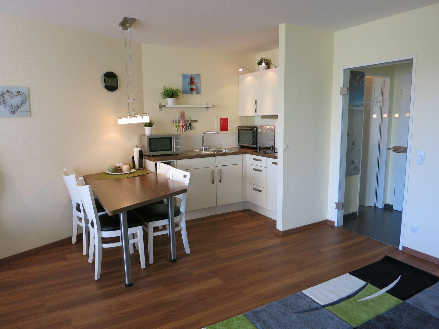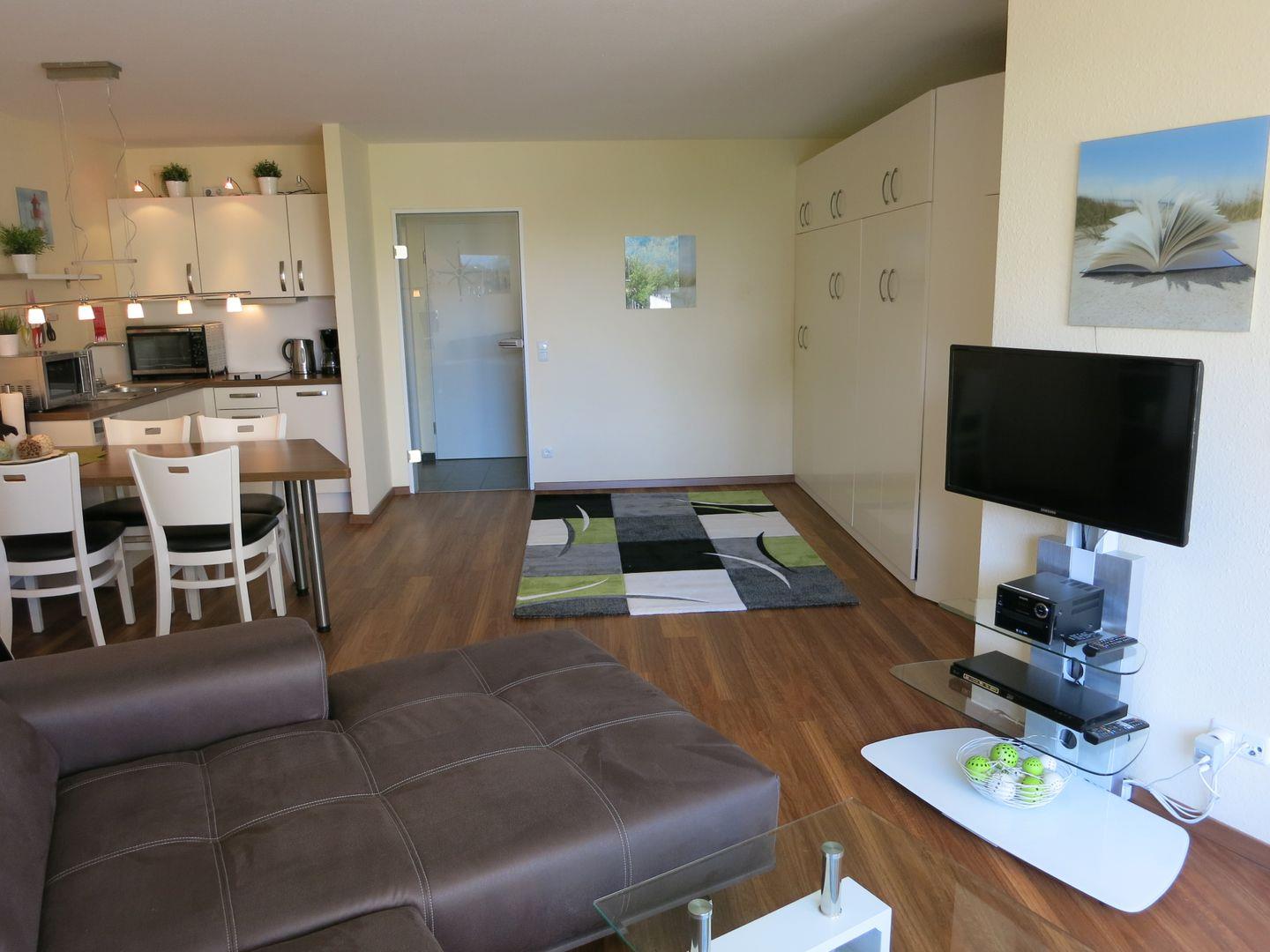 Haus Lord Nelson, Typ 2, App.-Nr. 119, bis 4 Pers., 1. Etage, ca. 40 qm Größe, Richtung Weltschifffahrtsweg (ohne Meerblick/Richtung Elbe), Wohnbereich mit Schrankbett (einzeln klappbar), sep. kleines Schlafzimmer mit Etagenbett (mit 100 cm hohem Einstieg auch für Erwachsene geeignet) und 2.TV-Flachbildschirm, Dusche/WC mit Föhn, Küchenzeile mit Geschirrspüler, Backofen, Mikrowelle und 2-Platten-Ceranfeld, Balkon, Kabel-TV, Blue-Ray-Player (auch für DVD geeignet), Kinderhochstuhl, kostenl. WLAN Zugang im App. Tiefgaragenstellplatz, Nichtraucherwohnung, Haustiere sind auf Anfrage gestattet, Strandkorb im Sommer 2026