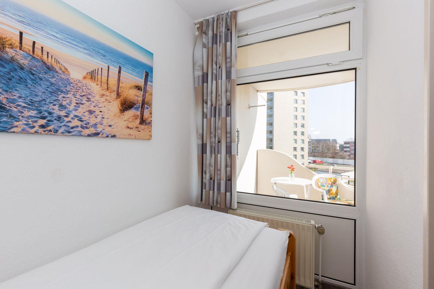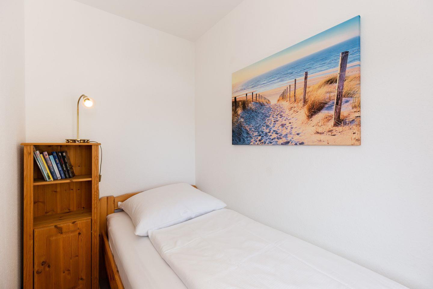 Haus "Lord Nelson", Typ 2, App.-Nr. "217", bis 3 Personen, 2. Etage, ca. 40 qm Wohnungsgröße, Ostseite (ohne Meerblick/Richtung Elbe), Balkon, Wohnbereich mit in den Schrank integrierten Boxspringbett (mit zwei Einzelmatratzen) , separates kleines Kinderzimmer mit Einzelbett, Dusche/WC, Küchenzeile mit Mikrowelle, Telefon, Kabel-TV, kostenl. WLAN-Zugang im App., Tiefgaragenstellplatz, Strandkorb im Sommer 2025, Nichtraucherappartement