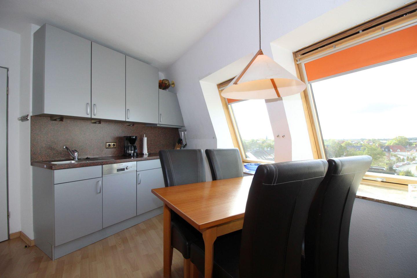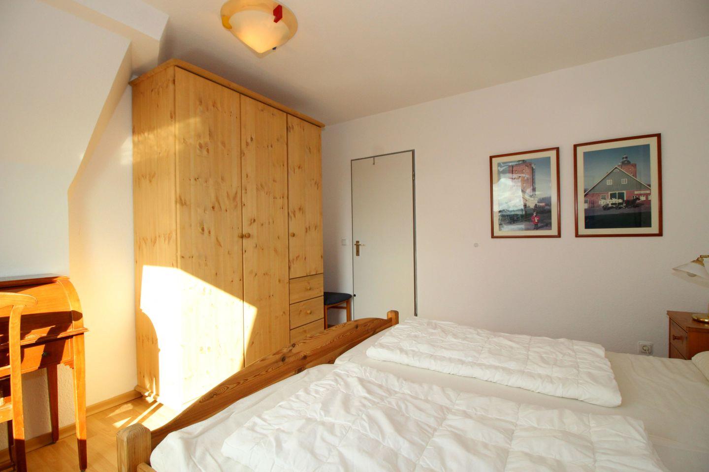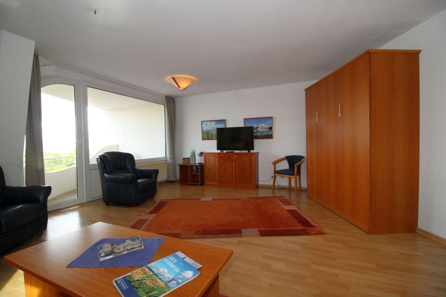 Haus "Trafalgar", Typ B, App.-Nr. 427, bis 4 Personen, 4. Etage, ca. 56 qm, Westseite (Meerblick), Wohn/Schlafraum mit Schrankbett, separates Schlafzimmer mit Doppelbett, Küchenzeile mit Ceranfeld, Geschirrspüler, Dusche/WC, Balkon, Kabel-TV, kostenl. W-Lan im App, Nichtraucherwohnung, Haustiere sind nicht gestattet, Tiefgaragenstellplatz, Strandkorb im Sommer 2026.