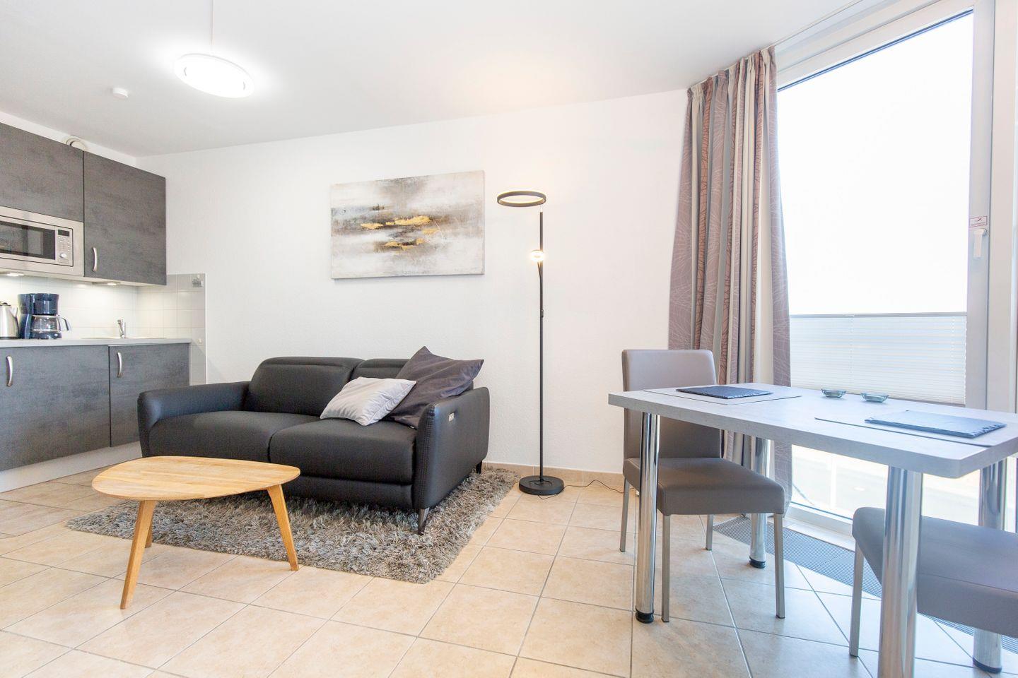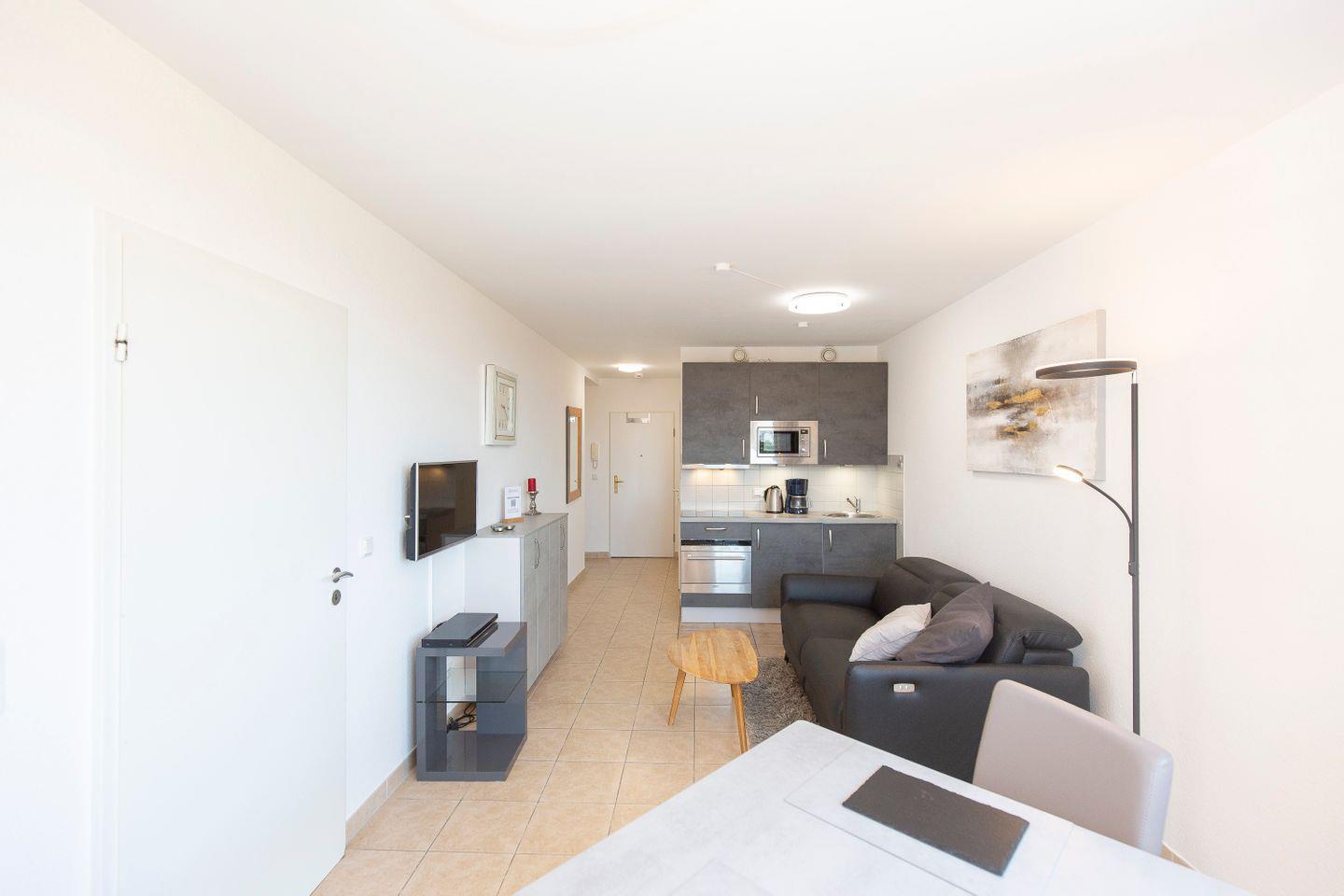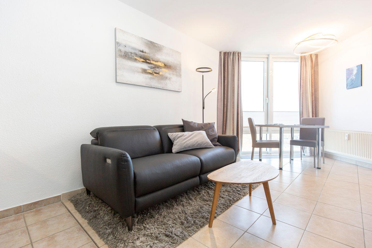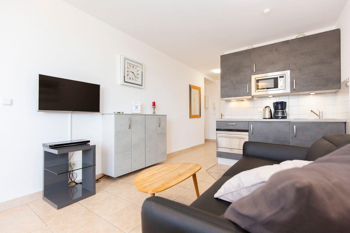 Haus "Kurpark-Residenz", Typ A, App.-Nr. "241", bis 2 Personen, 2. OG, ca. 38 m² Größe, Nordseite (Seeseite, Blickrichtung "Elbmündung"), Wohnzimmer mit Couch, sep. Schlafzimmer mit Boxspringbett, Dusche/WC, Küchenzeile mit Mikrowelle, Loggia, SAT-TV, kostenl. W-Lan Zugang im App., Tiefgaragenstellplatz, Strandkorb im Sommer 2026.