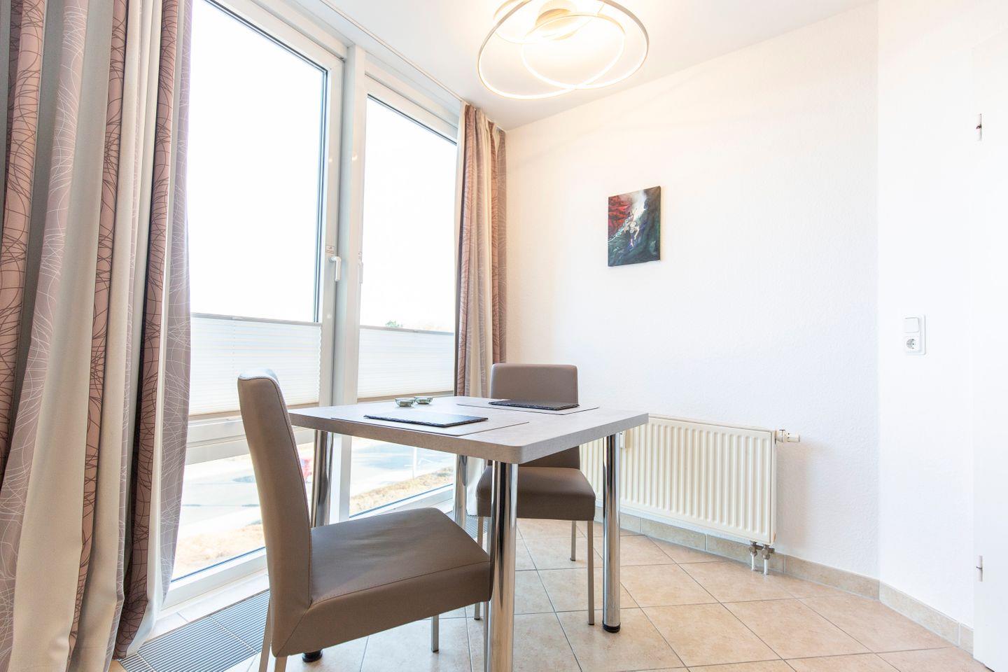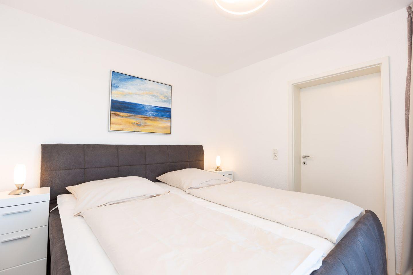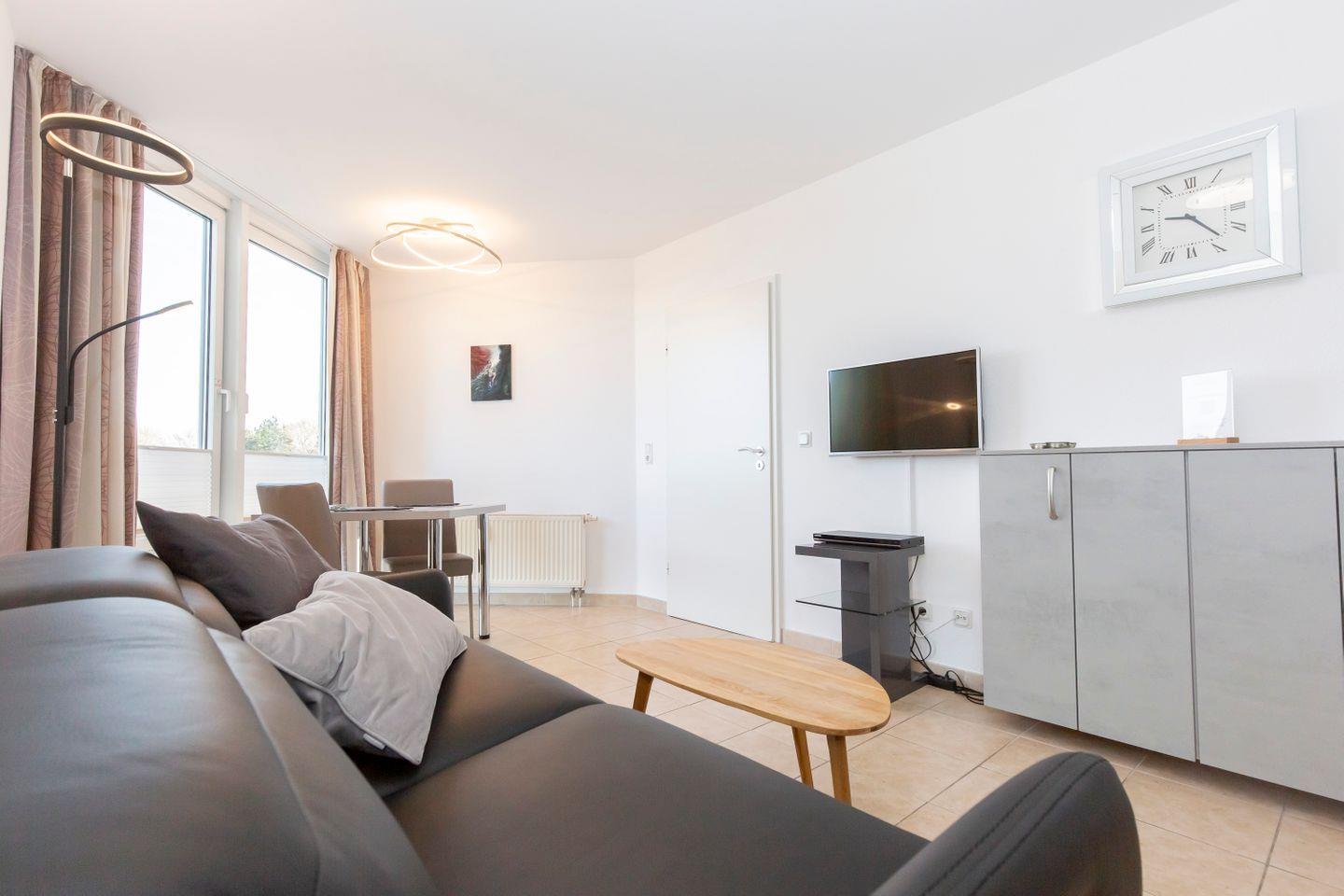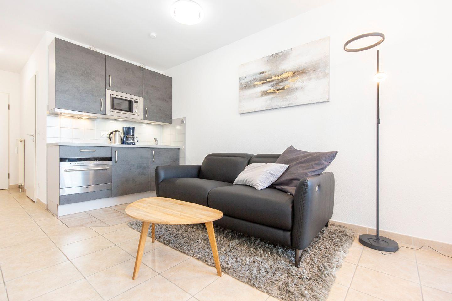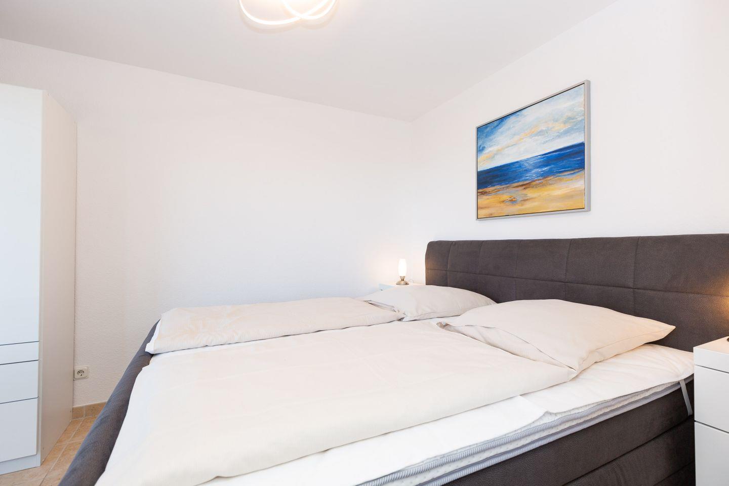 Haus "Kurpark-Residenz", Typ A, App.-Nr. "241", bis 2 Personen, 2. OG, ca. 38 m² Größe, Nordseite (Seeseite, Blickrichtung "Elbmündung"), Wohnzimmer mit Couch, sep. Schlafzimmer mit Boxspringbett, Dusche/WC, Küchenzeile mit Mikrowelle, Loggia, SAT-TV, kostenl. W-Lan Zugang im App., Tiefgaragenstellplatz, Strandkorb im Sommer 2026.