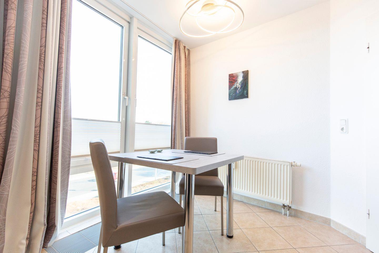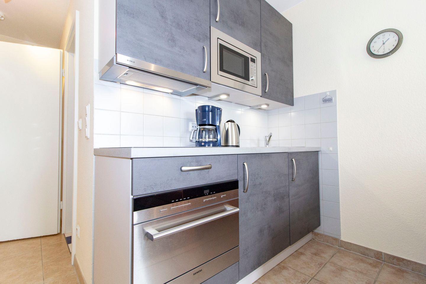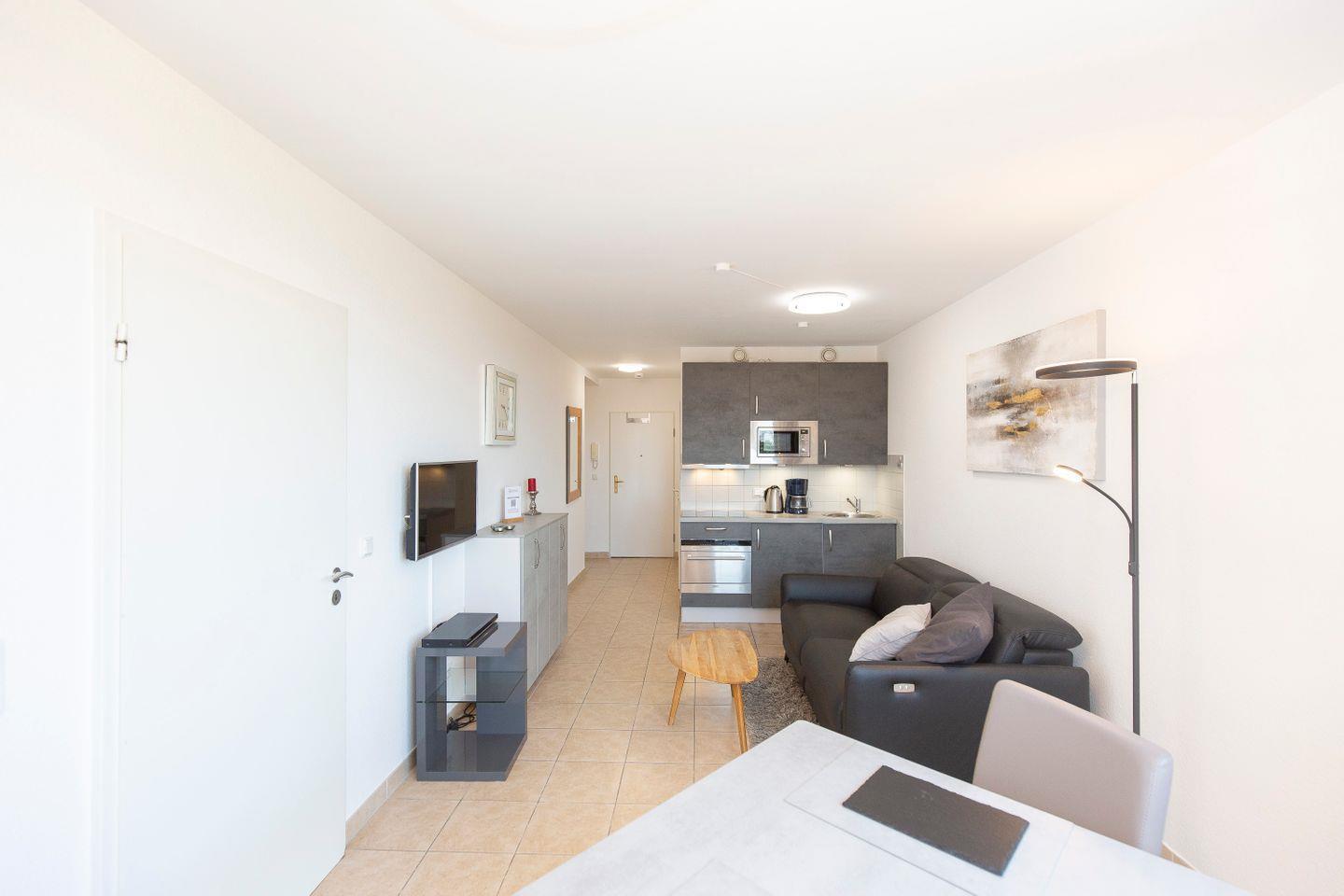 Haus "Kurpark-Residenz", Typ A, App.-Nr. "241", bis 2 Personen, 2. OG, ca. 38 m² Größe, Nordseite (Seeseite, Blickrichtung "Elbmündung"), Wohnzimmer mit Couch, sep. Schlafzimmer mit Boxspringbett (großes Laken), Dusche/WC, Küchenzeile mit Mikrowelle, Loggia, SAT-TV, kostenl. W-Lan Zugang im App., Tiefgaragenstellplatz, Strandkorb im Sommer 2026.