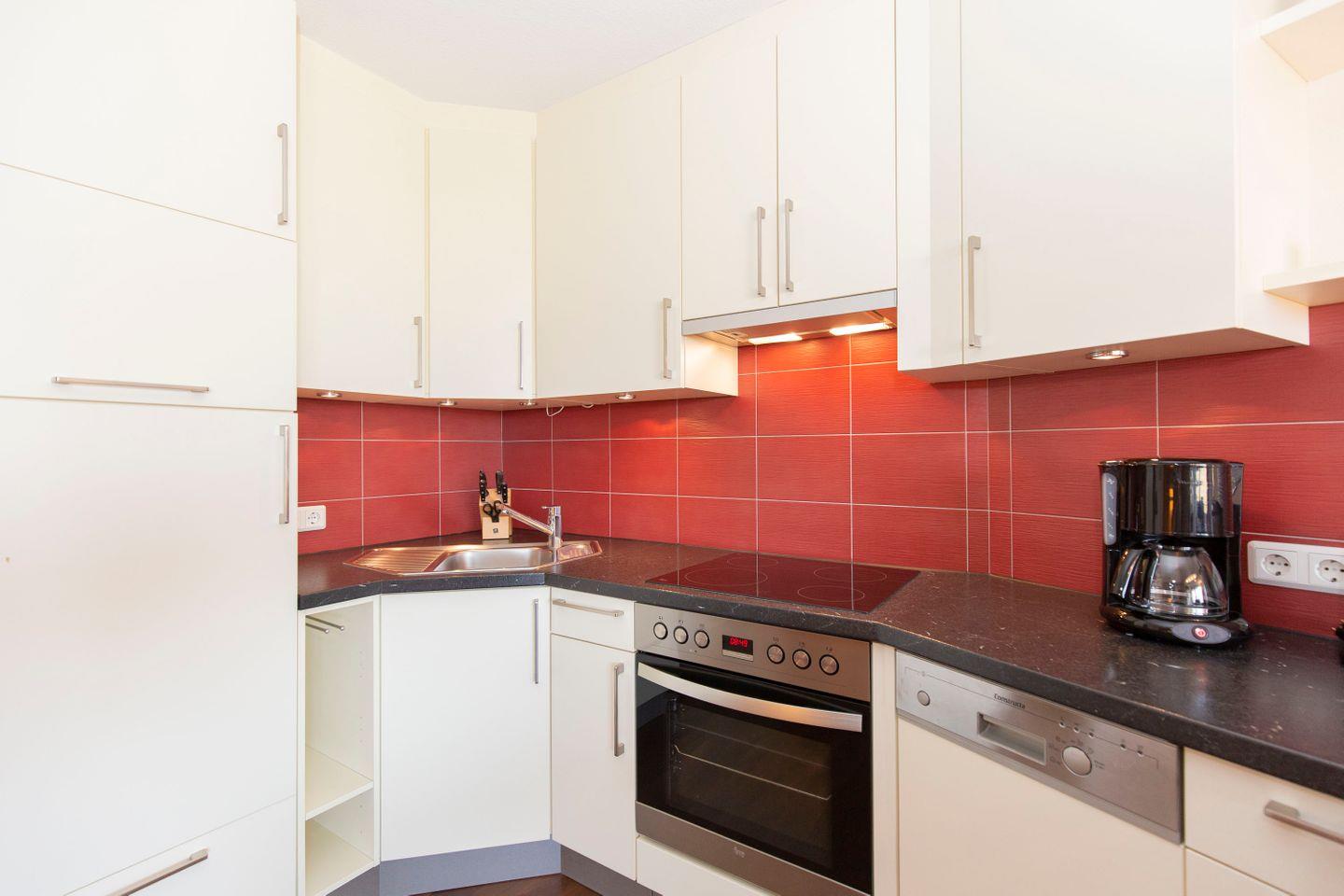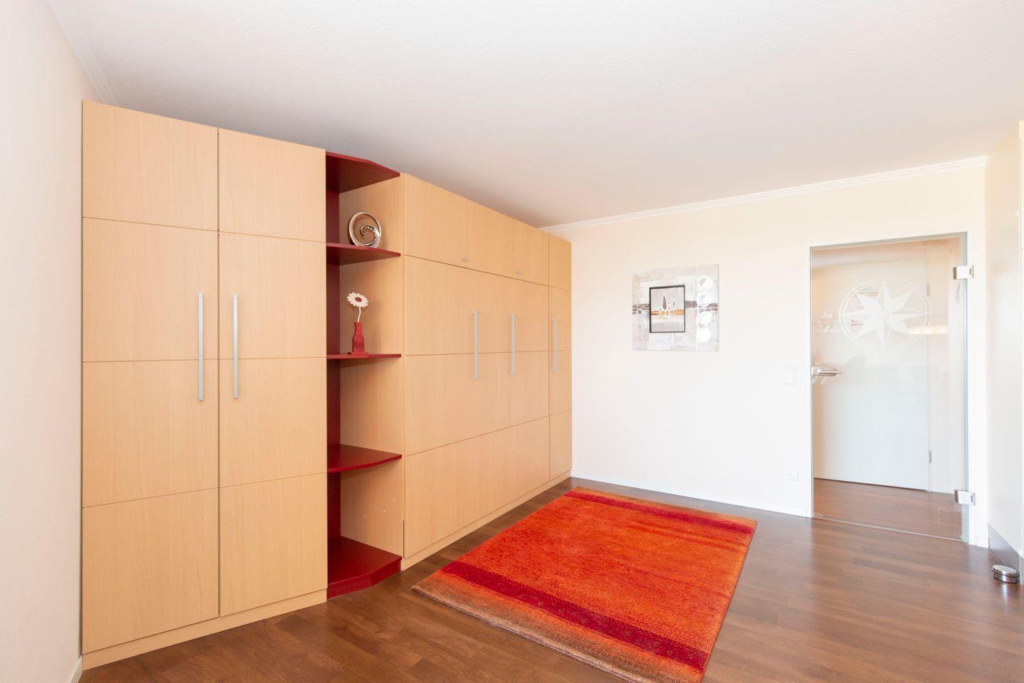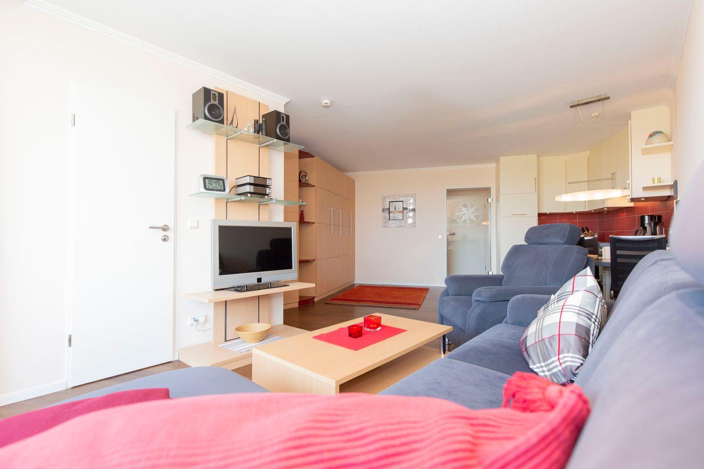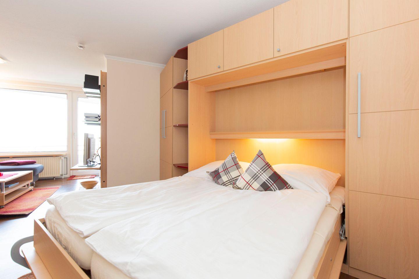 Haus Lord Nelson, Typ 2, Appartement 204, bis 3 Personen, 2. Etage, ca. 40 qm Wohnungsgröße, Weltnaturerbe Wattenmeer (ohne Meerblick/Richtung Neuwerk), Wohnbereich mit Schrankbett, sep. kleines Schlafzimmer mit Einzelbett, Dusche/WC, Küchenzeile mit Backofen, Geschirrspüler, 4-Platten-Ceranfeld, Mikrowelle, Balkon, Kabel-TV, DVD-Player, kostenl. W-Lan Zugang im App., Tiefgaragenstellplatz, Haustiere sind nicht gestattet, Nichtraucher, Strandkorb im Sommer 2026